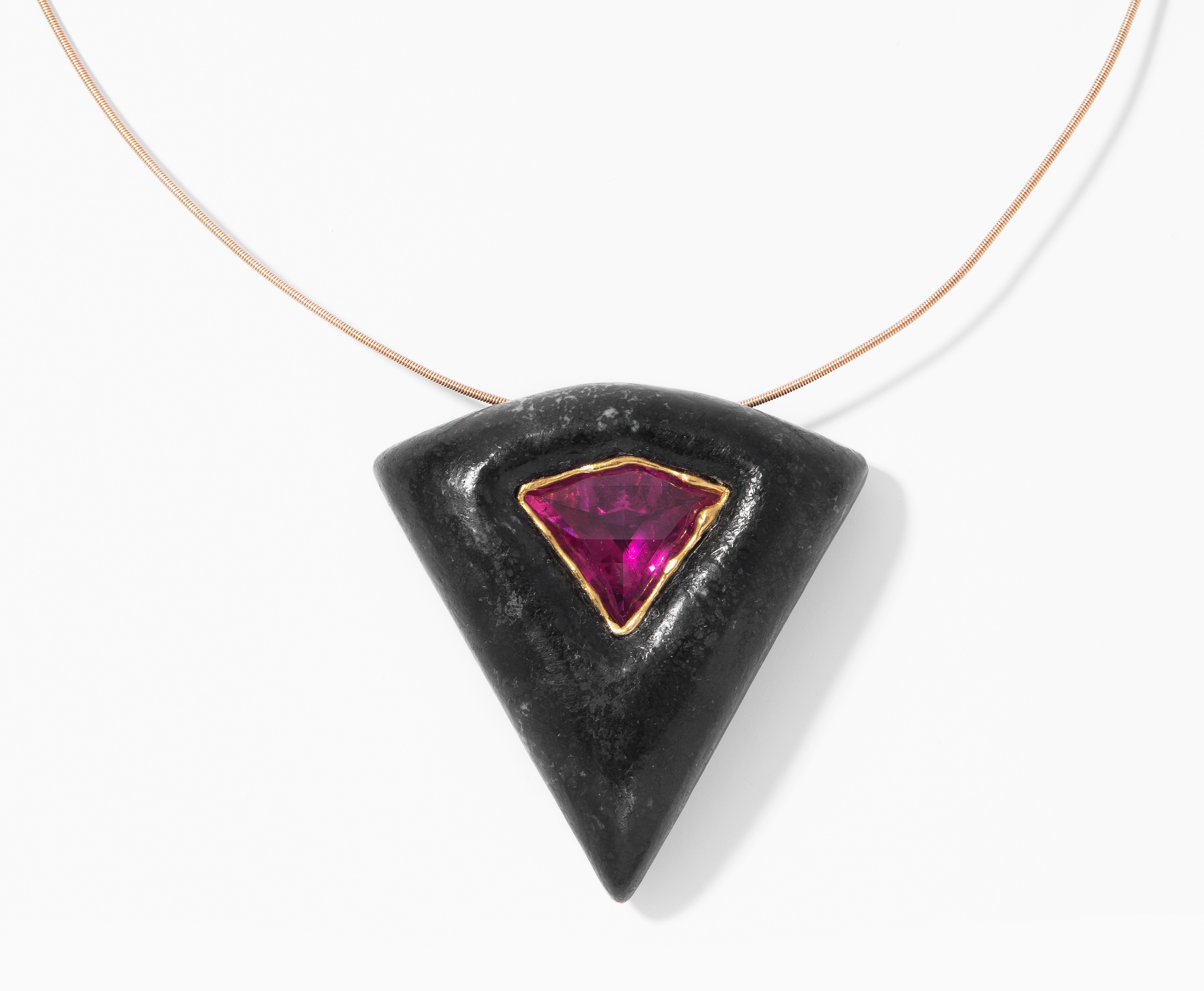 750 Gelbgold. Aparter Anhänger. Dreieckiger Granit mit Rubellit von ca. 15 ct. Goldsaite L 42 cm. 57,1 g.