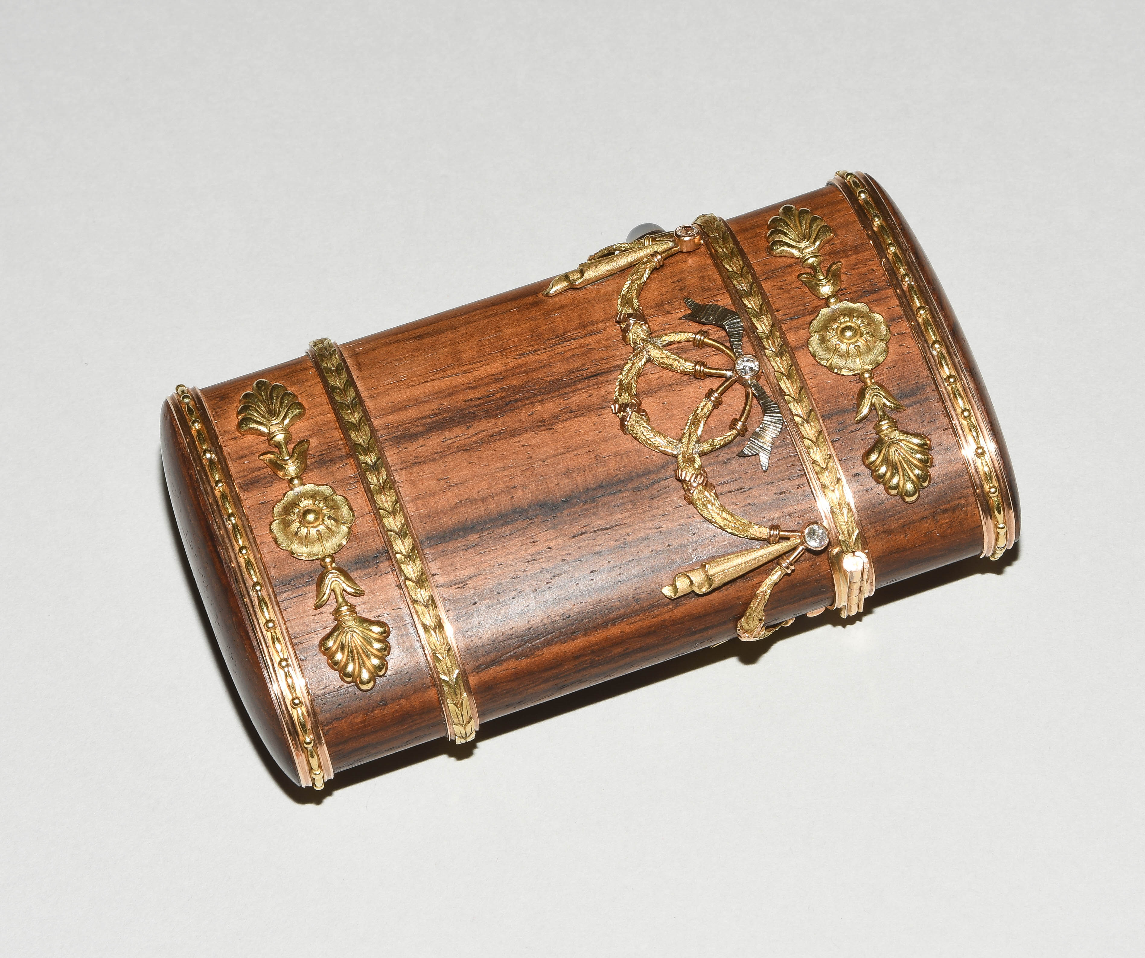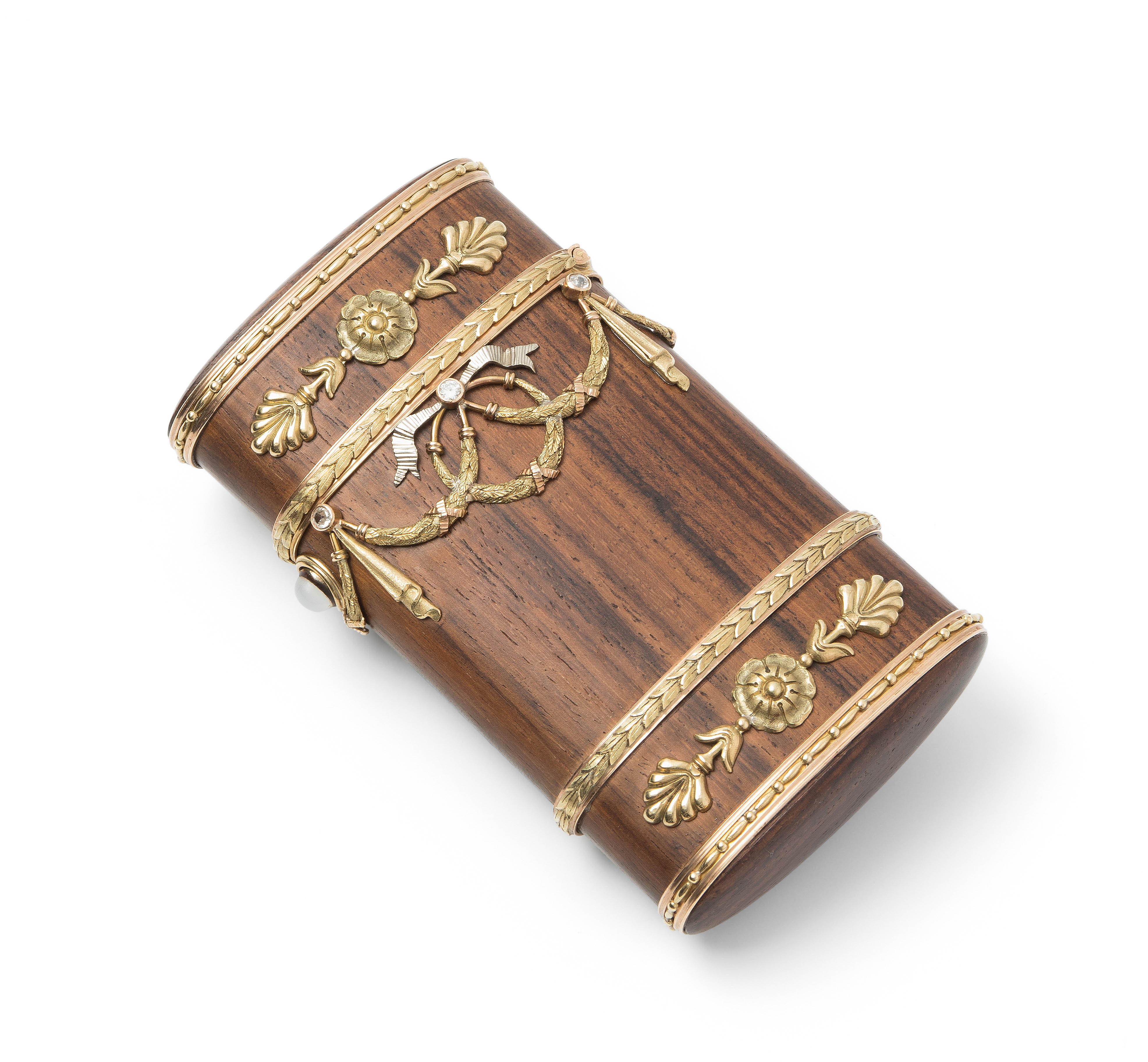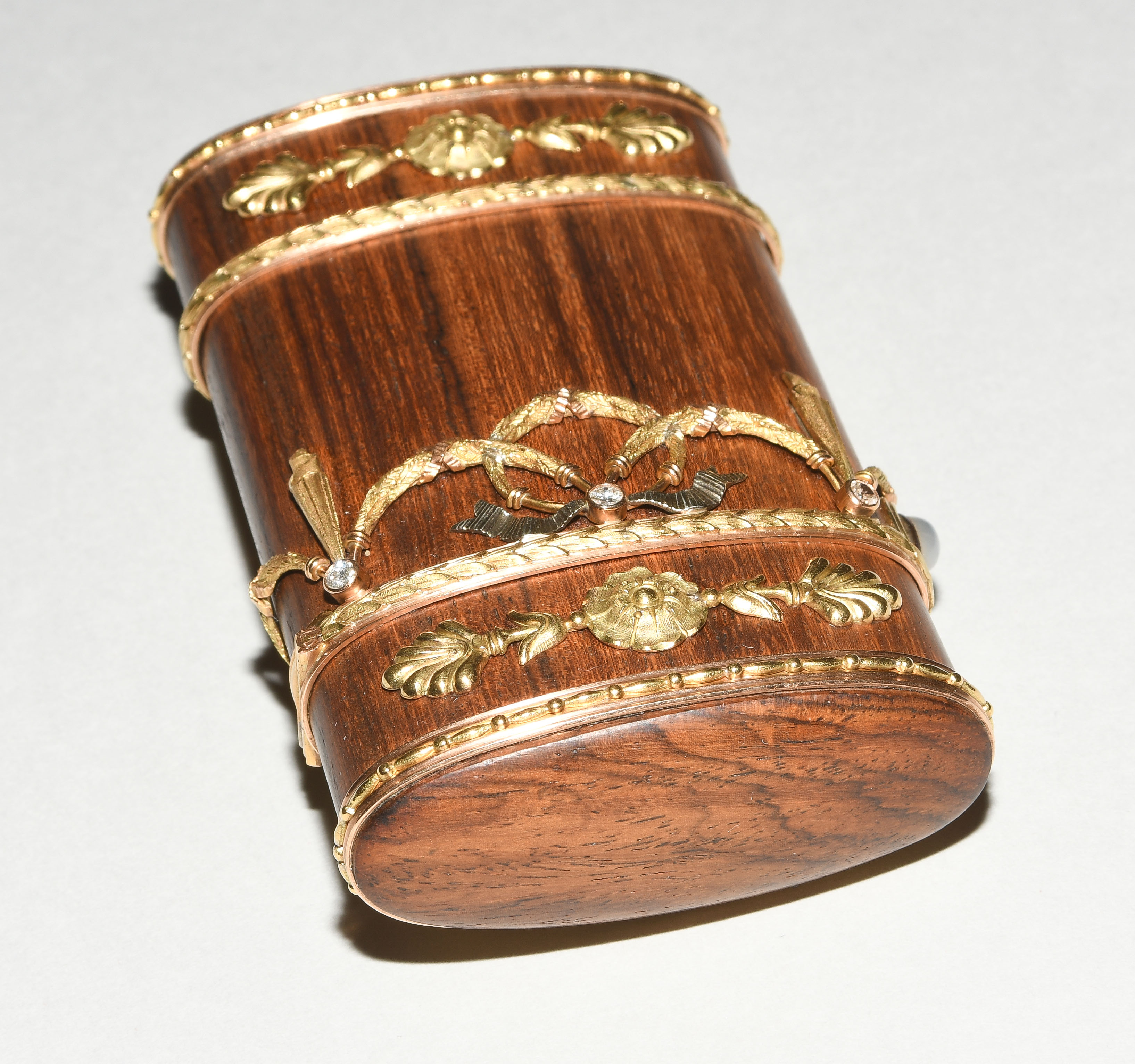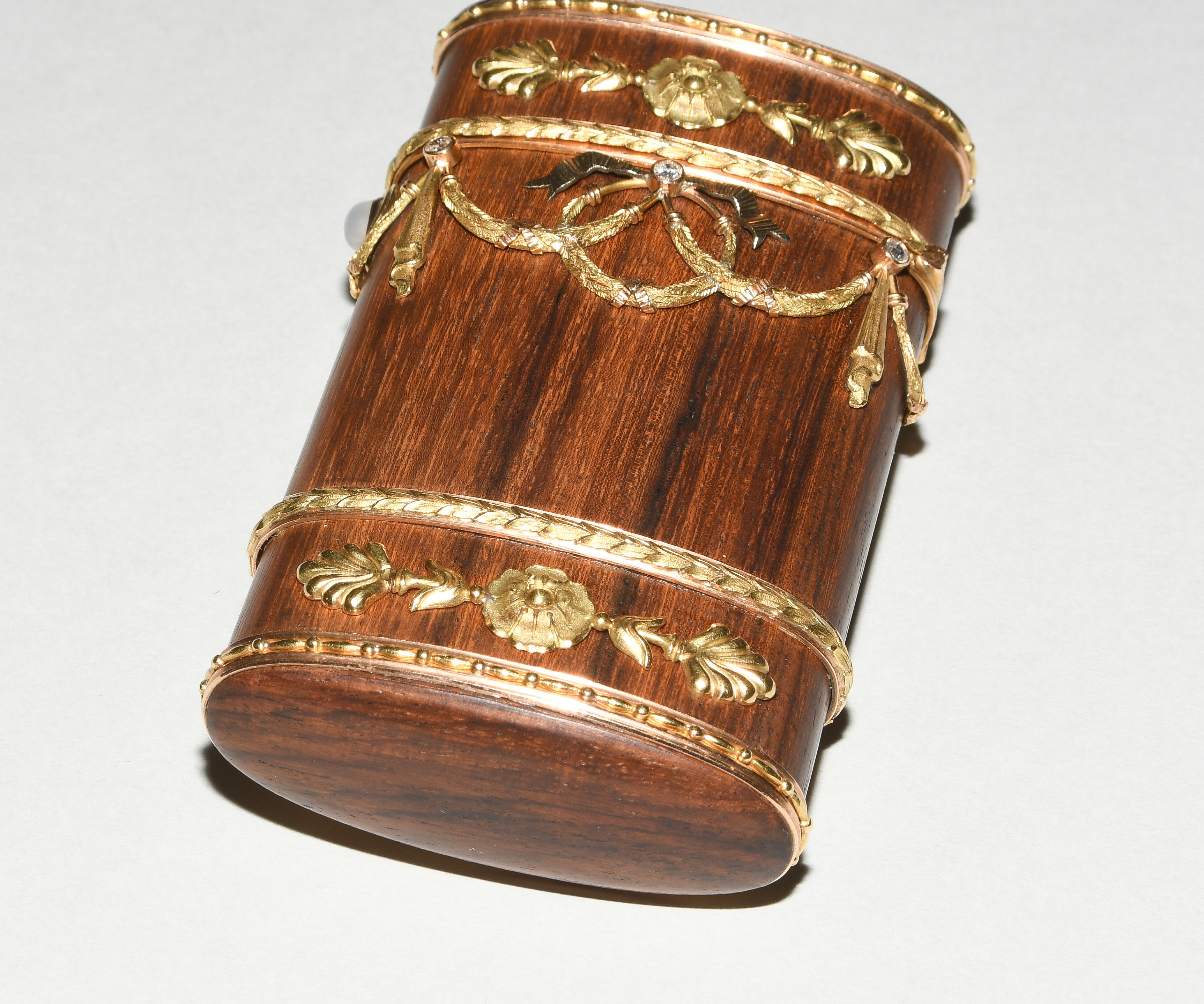 Zürich, 20.Jh. Im Stil des Louis XVI. Hersteller- Verkäufermarke Meister. Palisander und Gold "en trois couleurs". Schlanke Form mit gerundeten Seiten und scharniertem Deckel aus Palisander in Goldfassung. Horizontale feine Blattbordüren, dazwischen Girlanden- und Maschendekors, die mit 6 Altschliffdiamanten besetzt sind. Mondstein-Cabochon als Verschluss. Gemarkt EM, Gold Feingehalt 750. 5,5x10,1x1,2 cm, ca. 181 g.