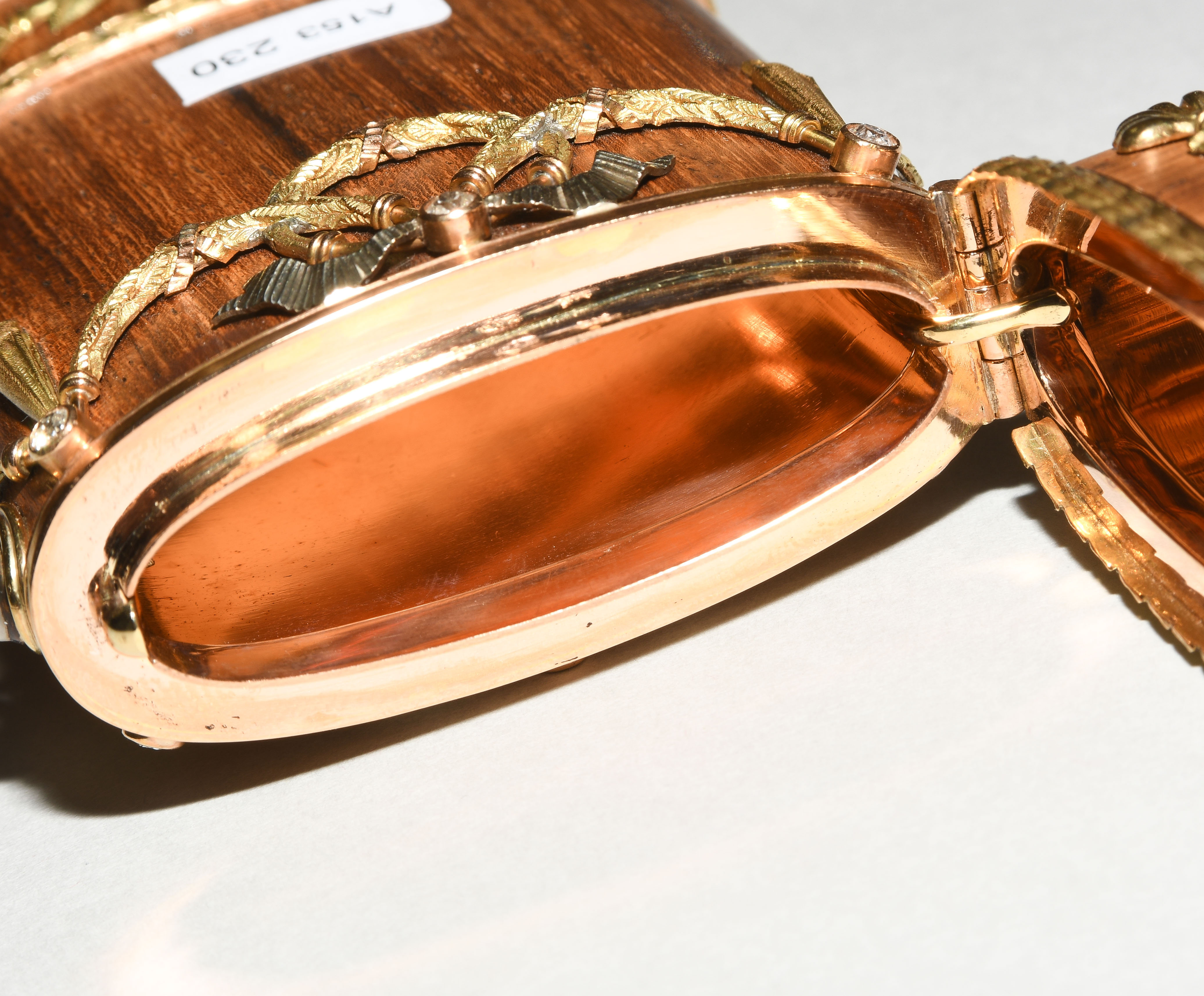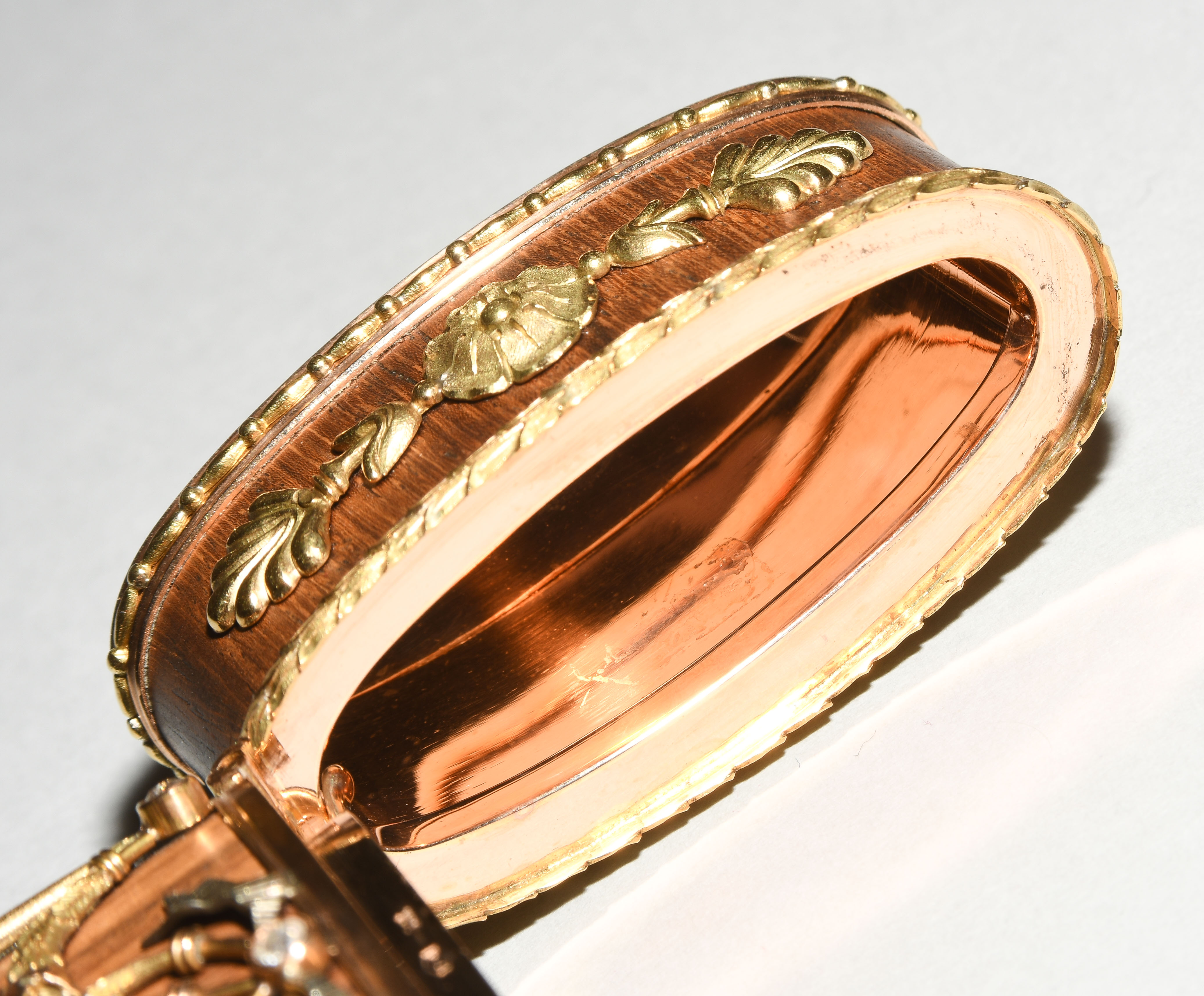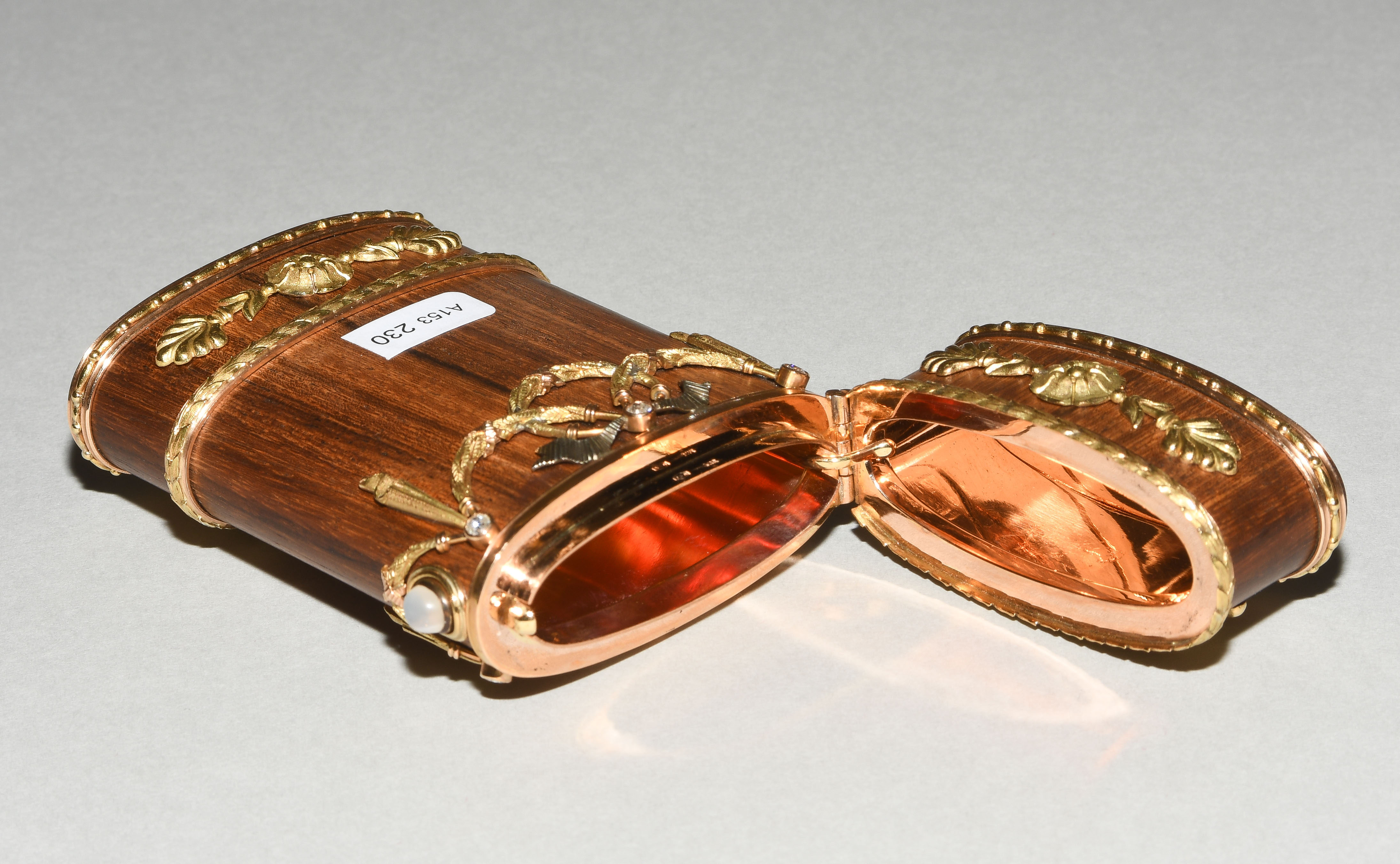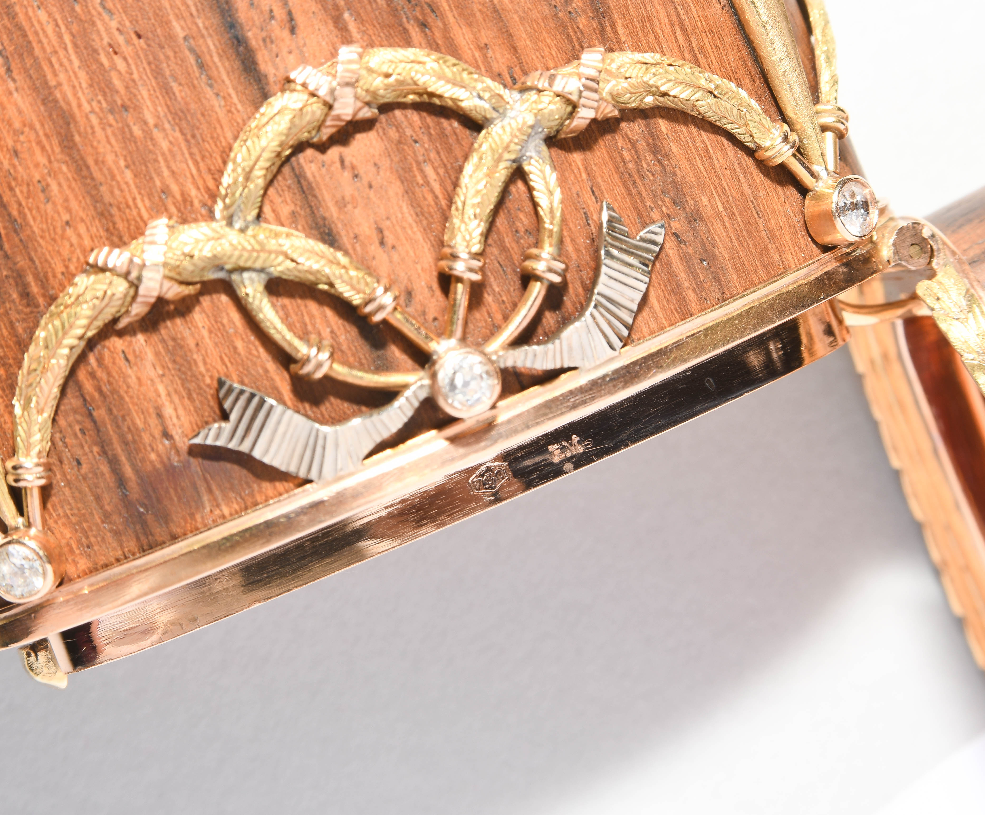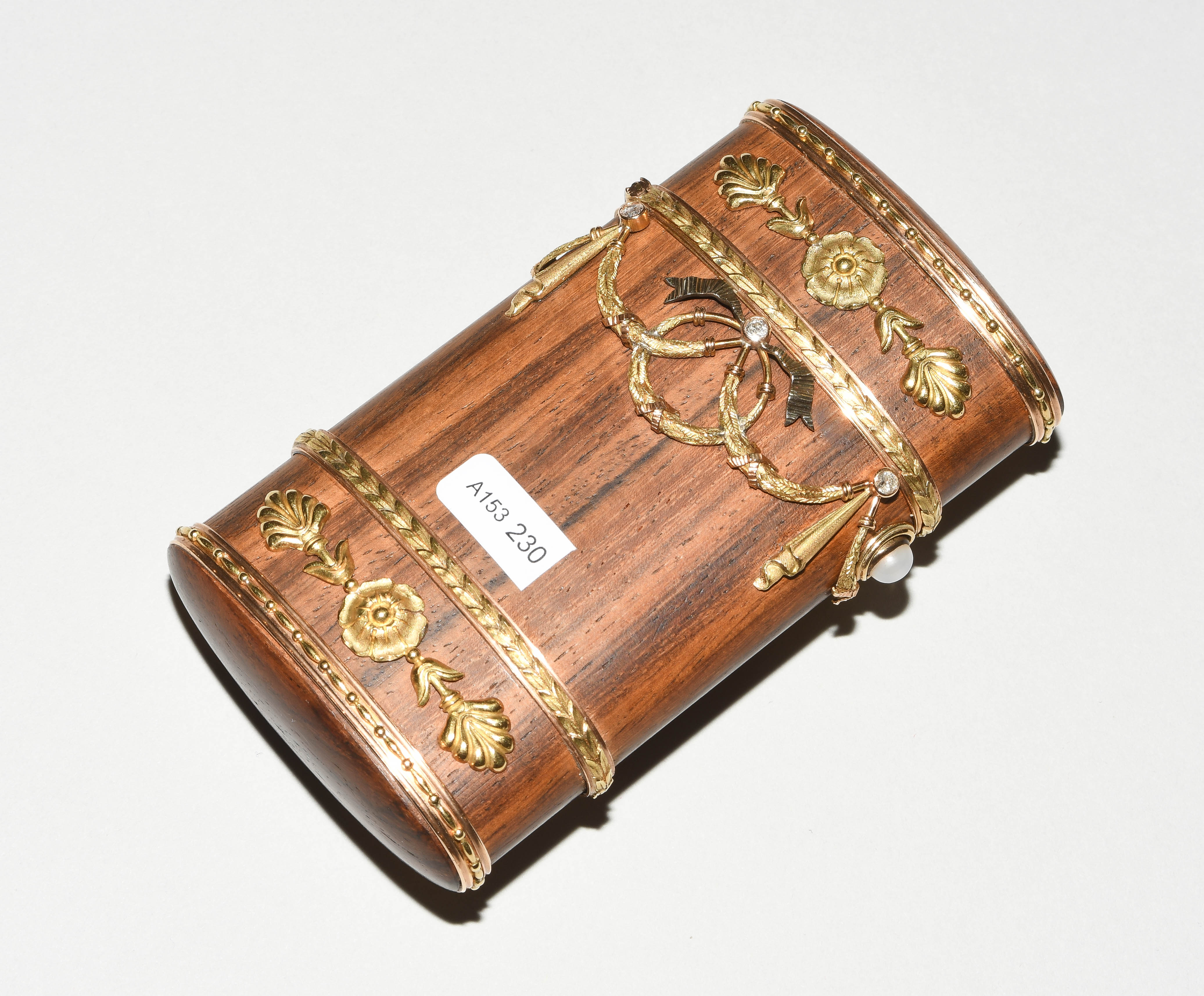 Zürich, 20.Jh. Im Stil des Louis XVI. Hersteller- Verkäufermarke Meister. Palisander und Gold "en trois couleurs". Schlanke Form mit gerundeten Seiten und scharniertem Deckel aus Palisander in Goldfassung. Horizontale feine Blattbordüren, dazwischen Girlanden- und Maschendekors, die mit 6 Altschliffdiamanten besetzt sind. Mondstein-Cabochon als Verschluss. Gemarkt EM, Gold Feingehalt 750. 5,5x10,1x1,2 cm, ca. 181 g.