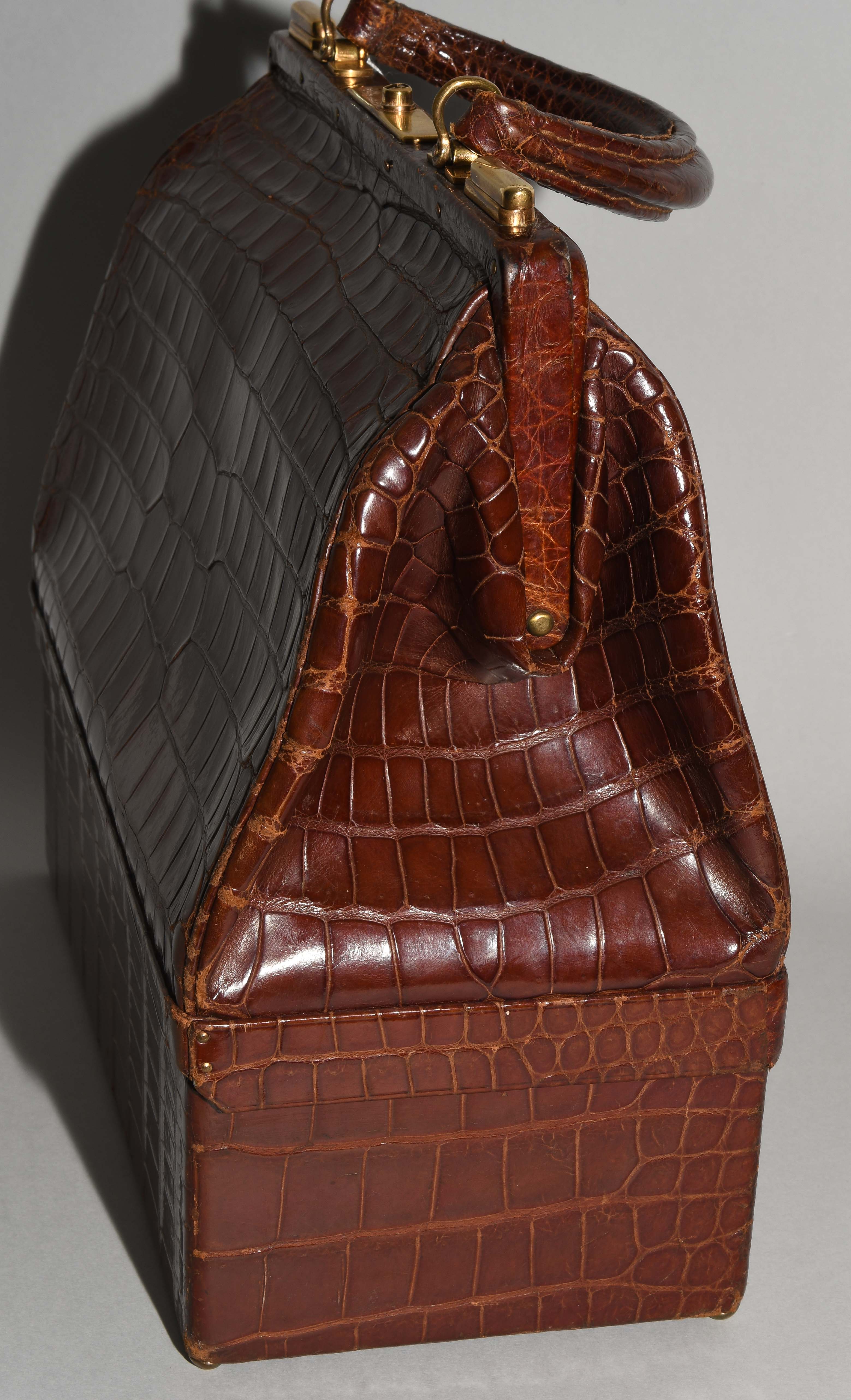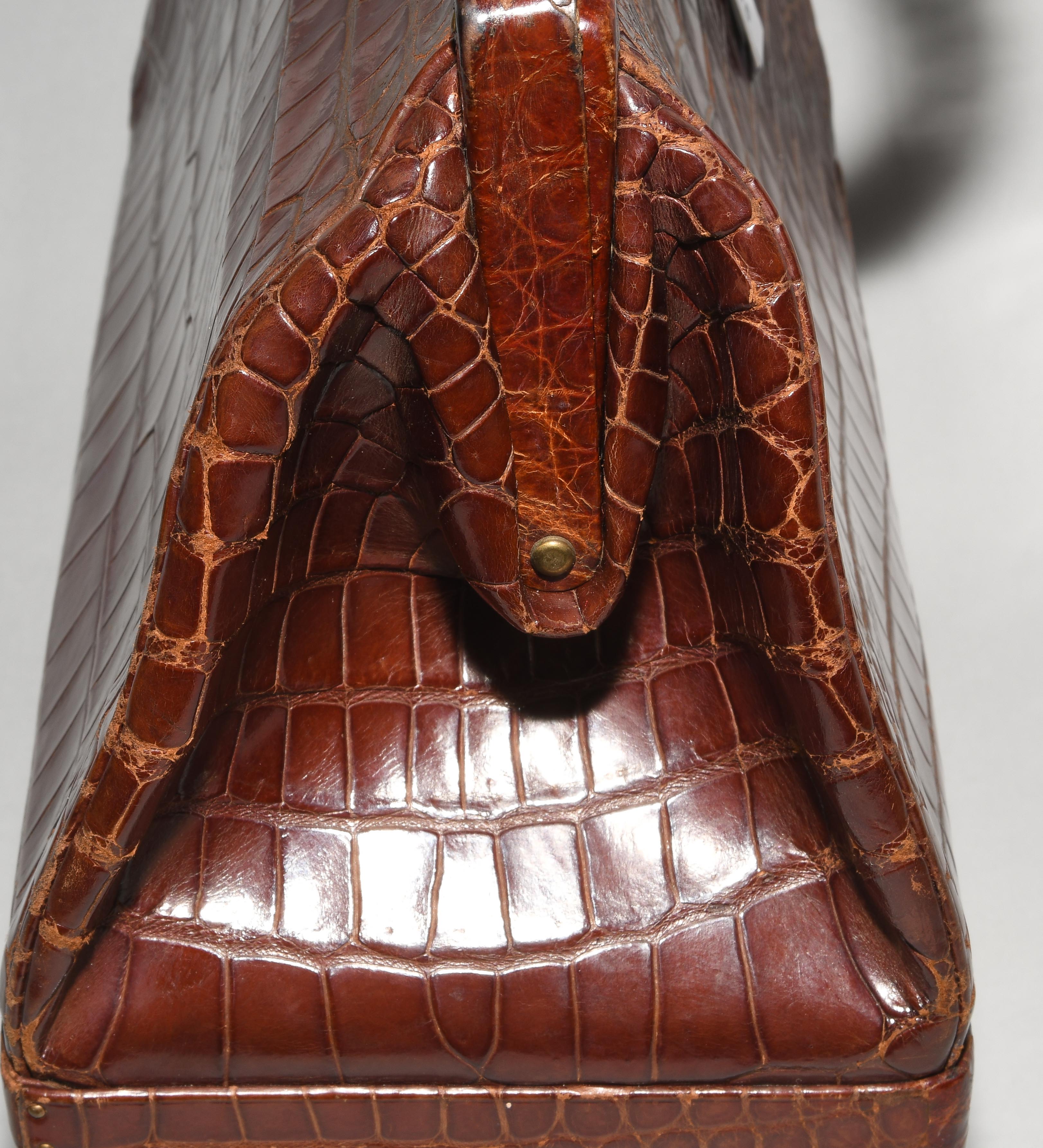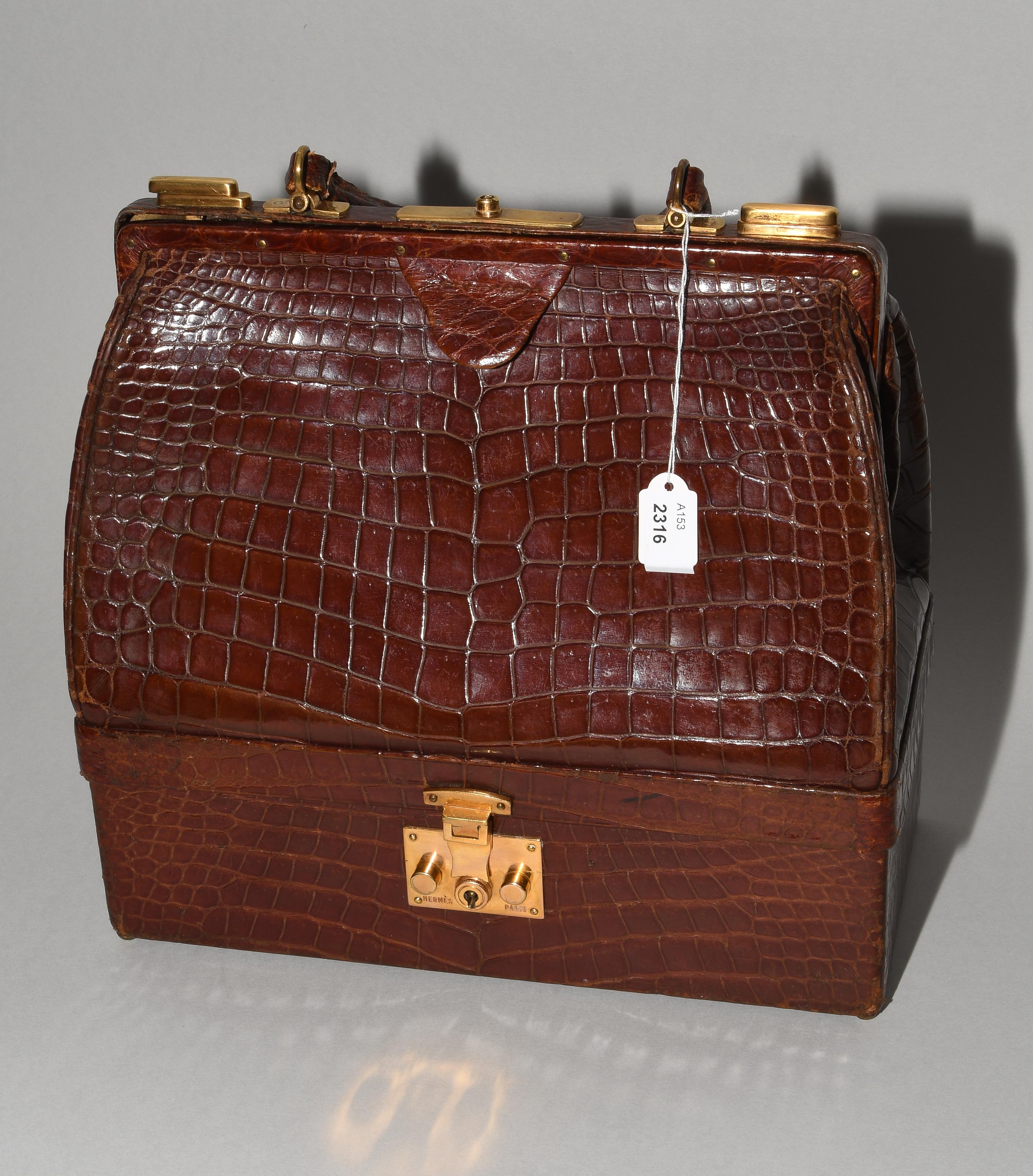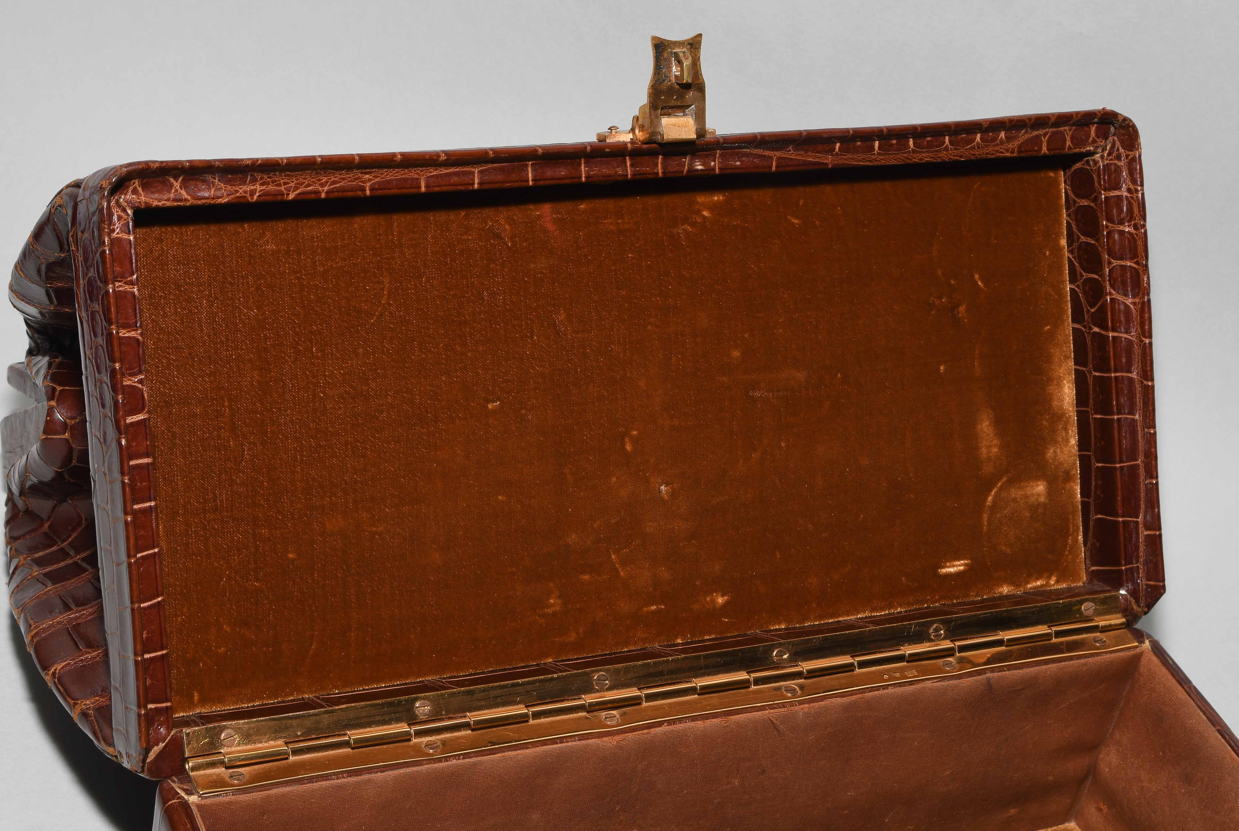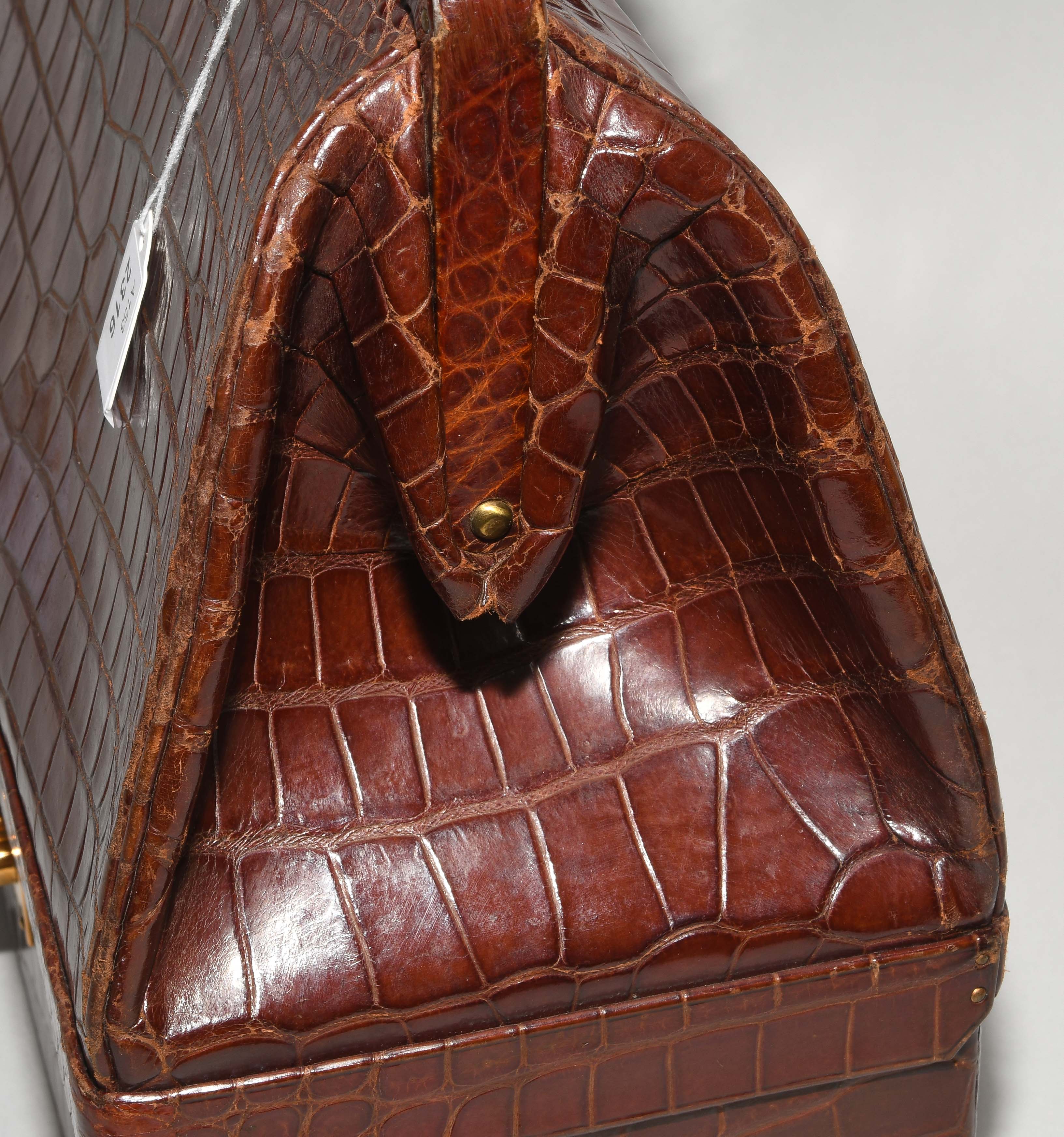 Gemarkt "Hermès Paris". Aus dunkelbraunem Krokodilleder. Vergoldete Metallbeschläge. Verschliessbares Hauptfach. Separates Scmuckfach ebenfalls verschliessbar. Zwei Schlüsseln. 26x24x12,5 cm. Alters- und Gebrauchsspuren.