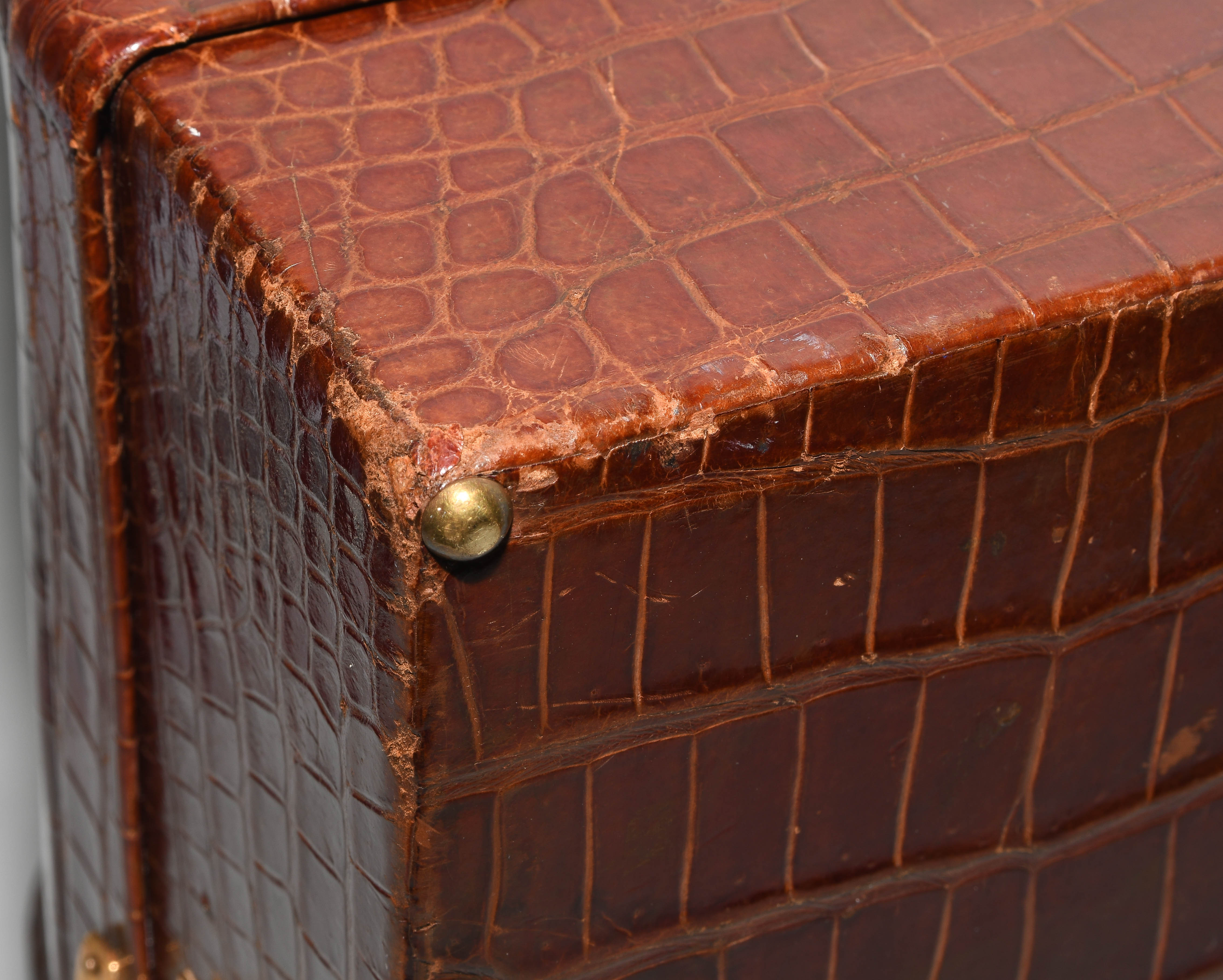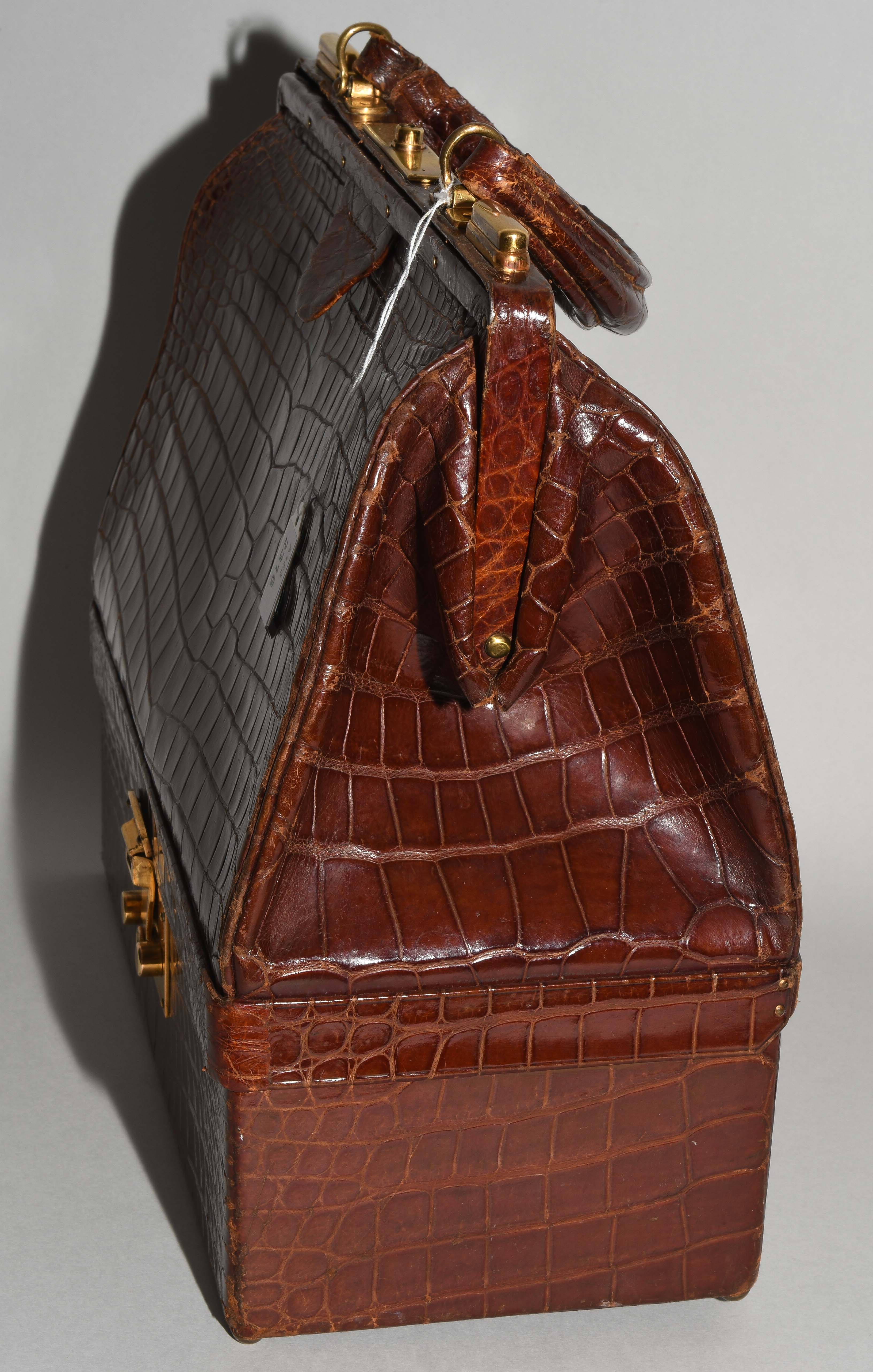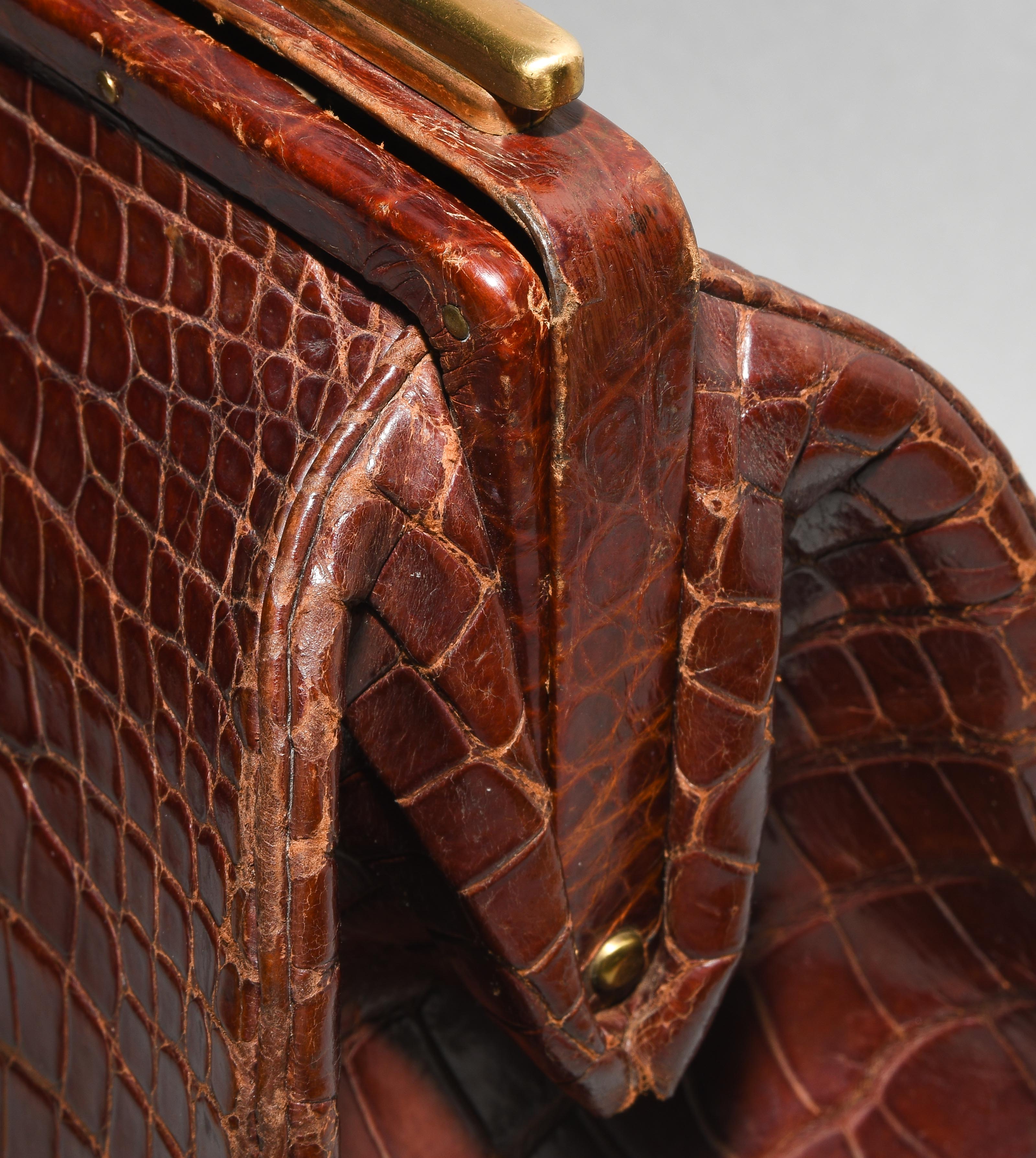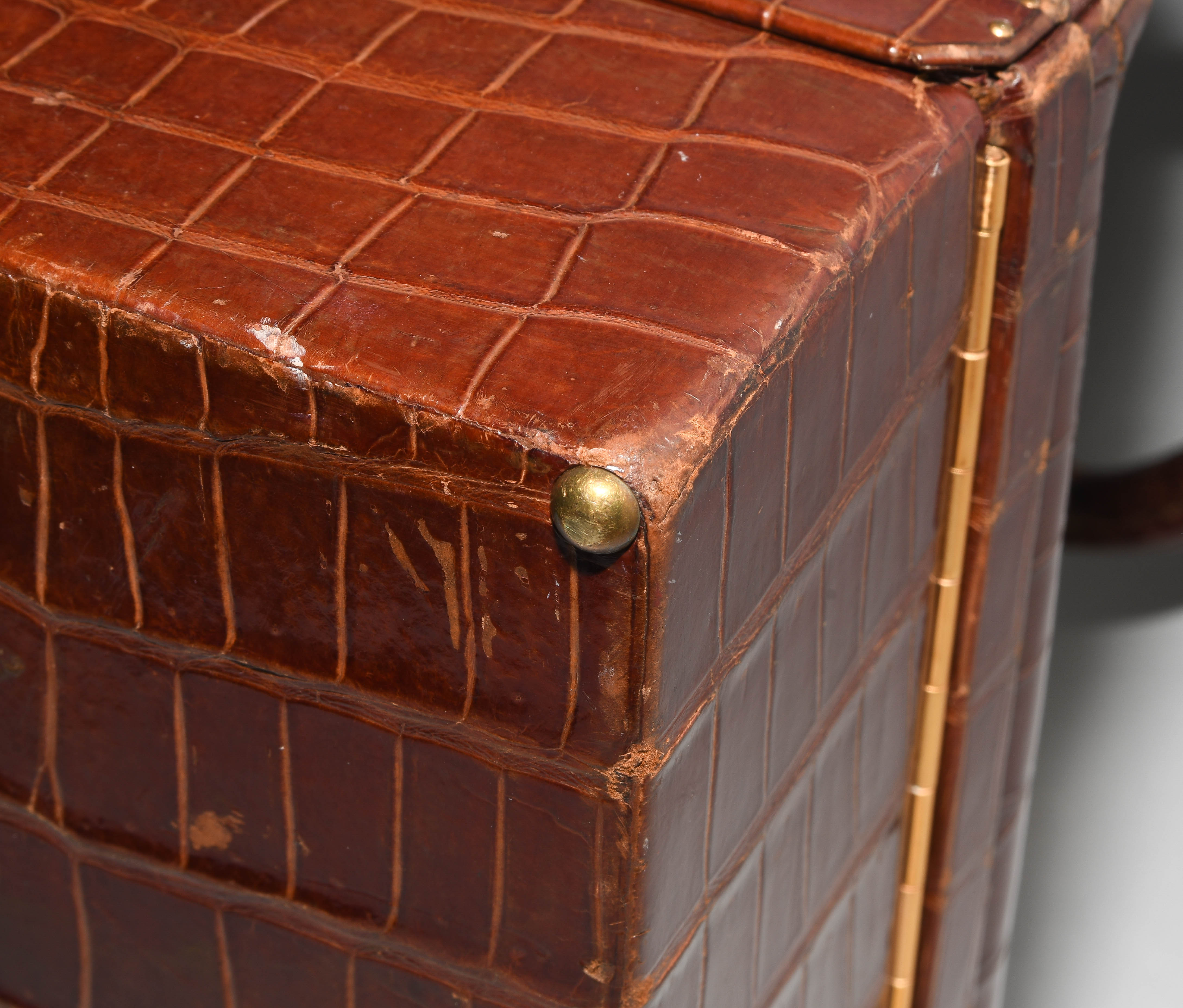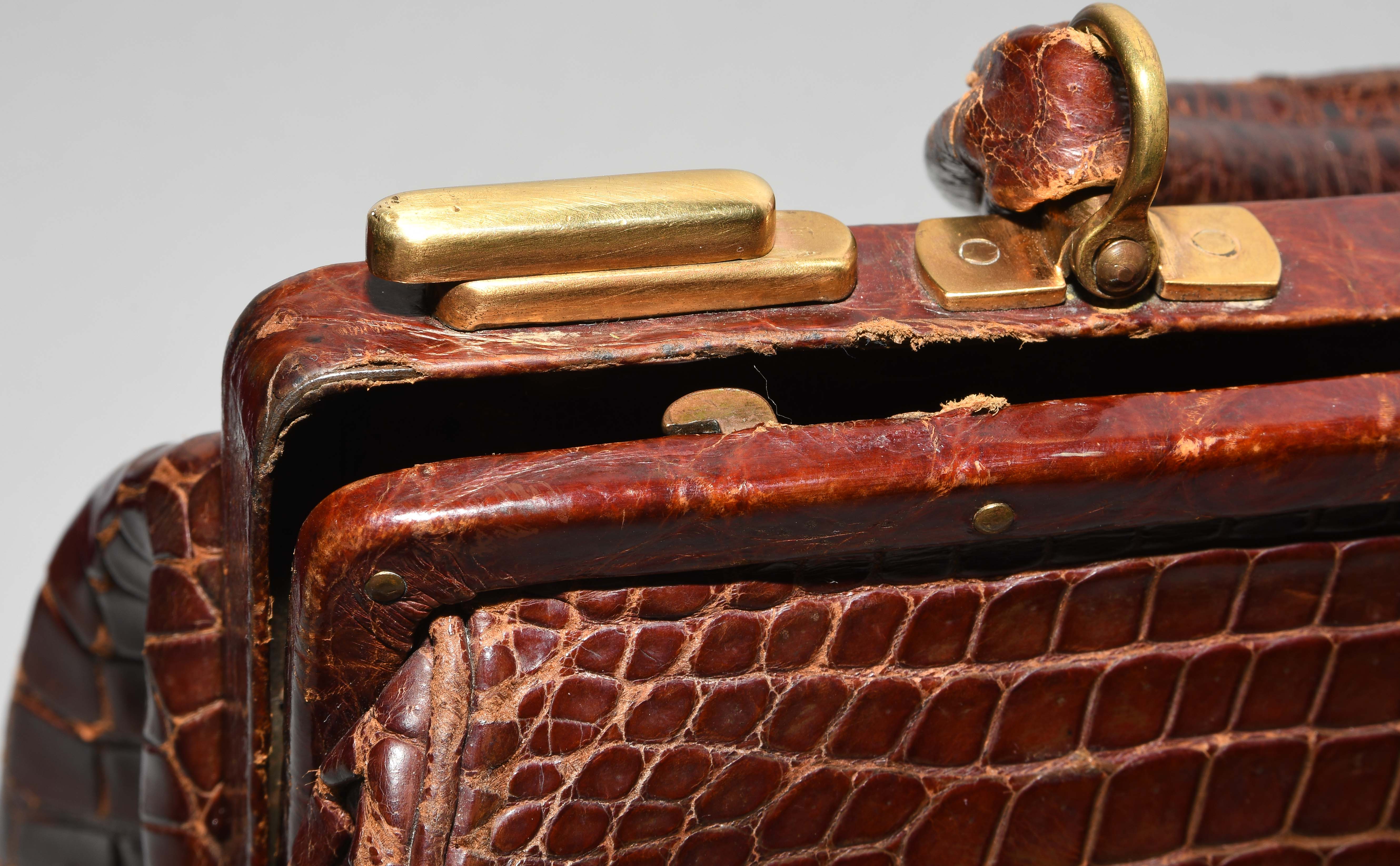 Gemarkt "Hermès Paris". Aus dunkelbraunem Krokodilleder. Vergoldete Metallbeschläge. Verschliessbares Hauptfach. Separates Scmuckfach ebenfalls verschliessbar. Zwei Schlüsseln. 26x24x12,5 cm. Alters- und Gebrauchsspuren.