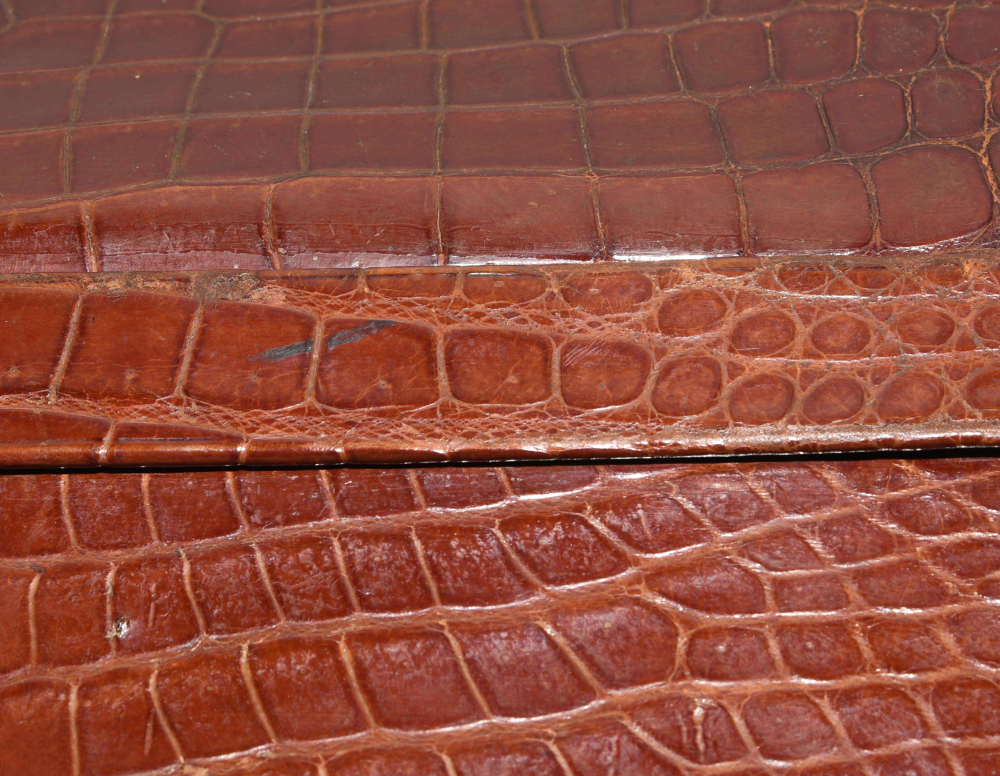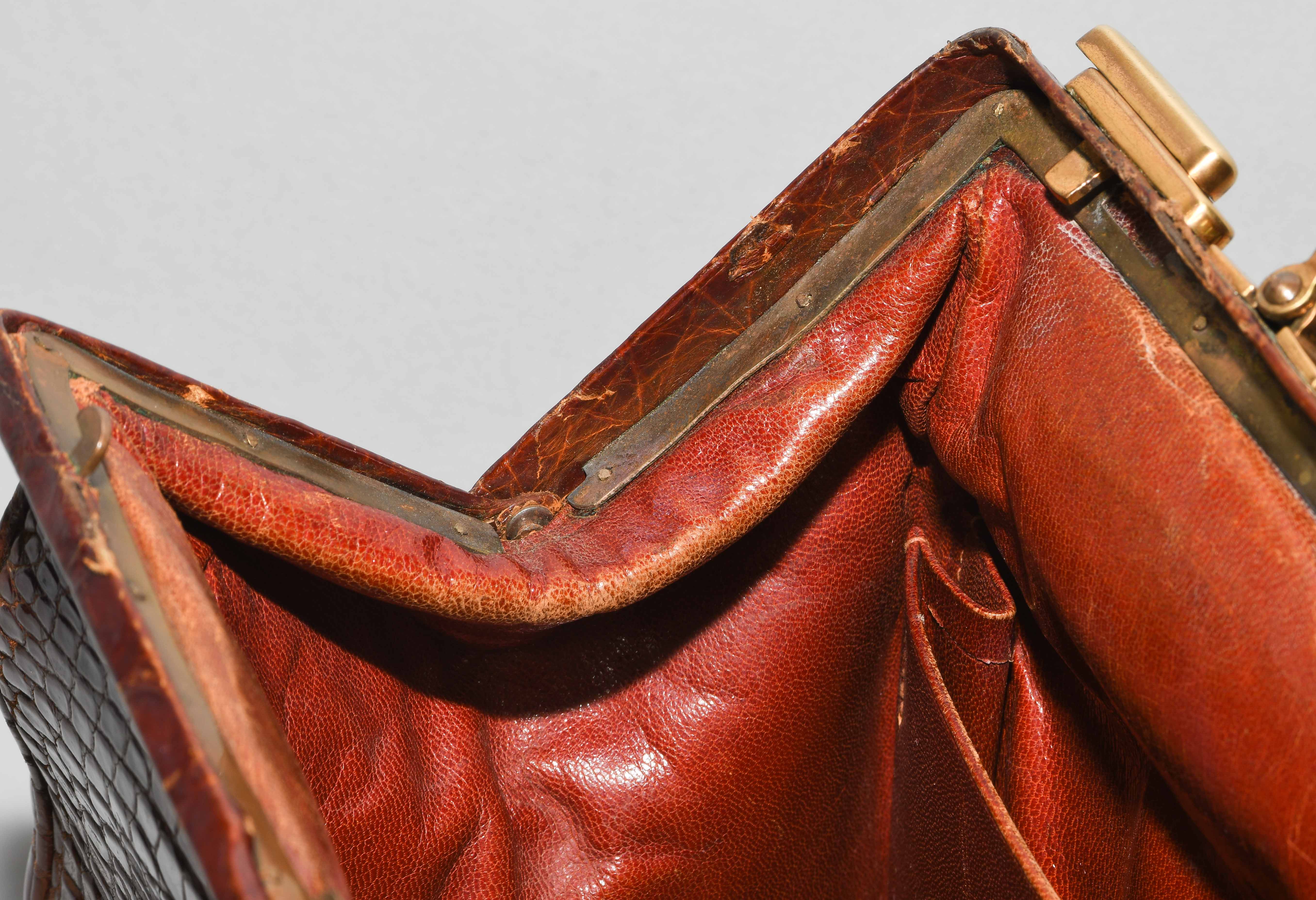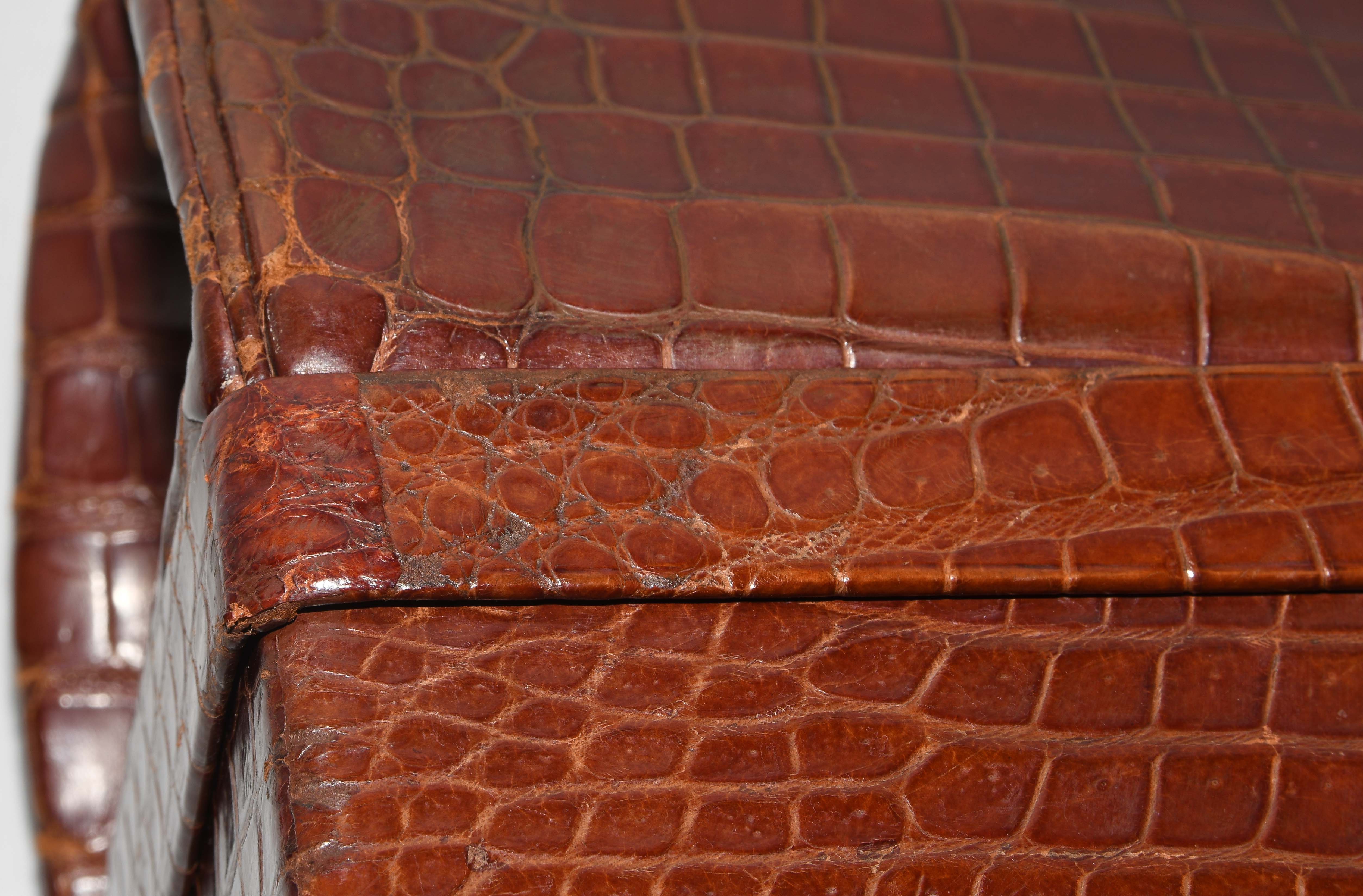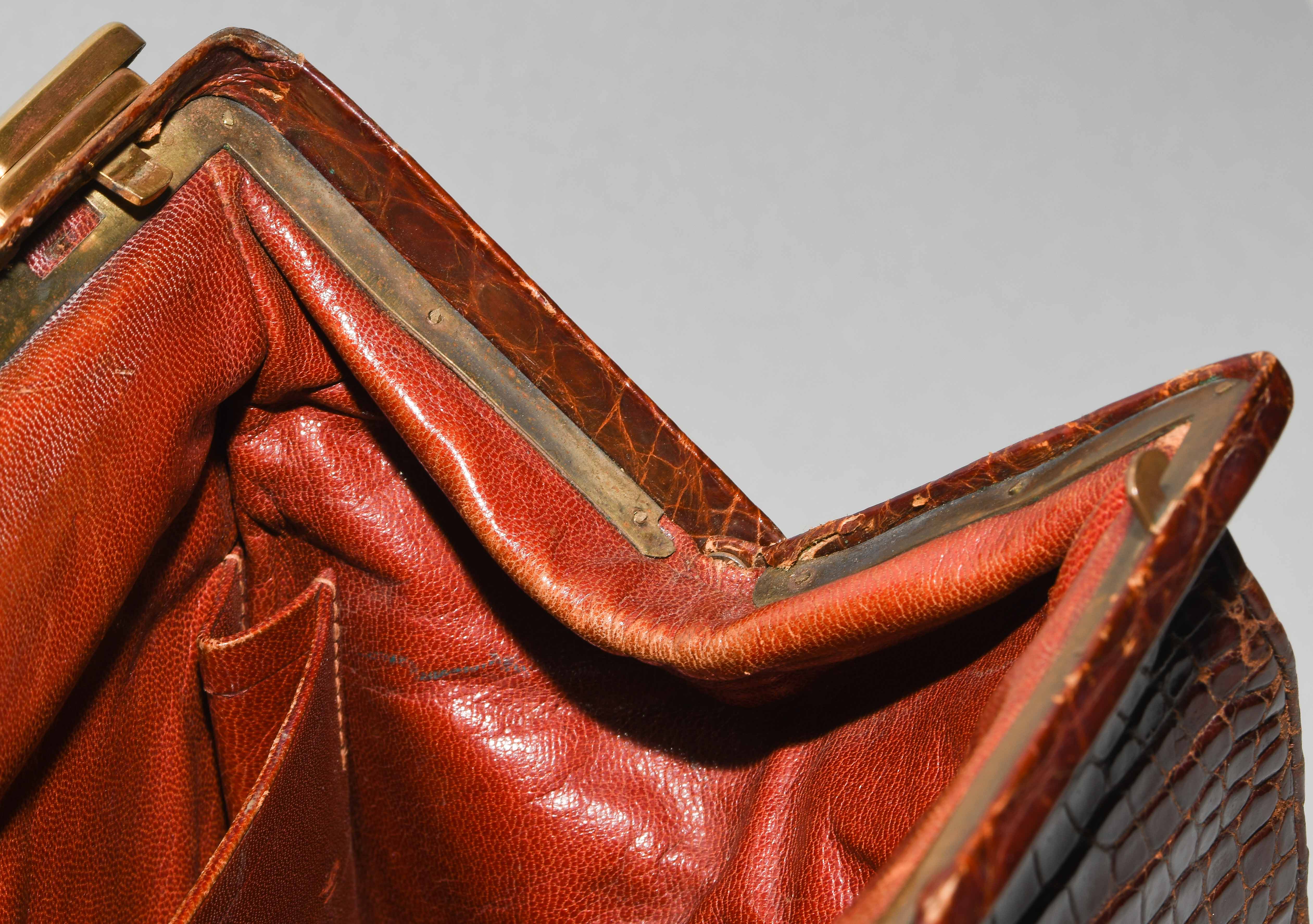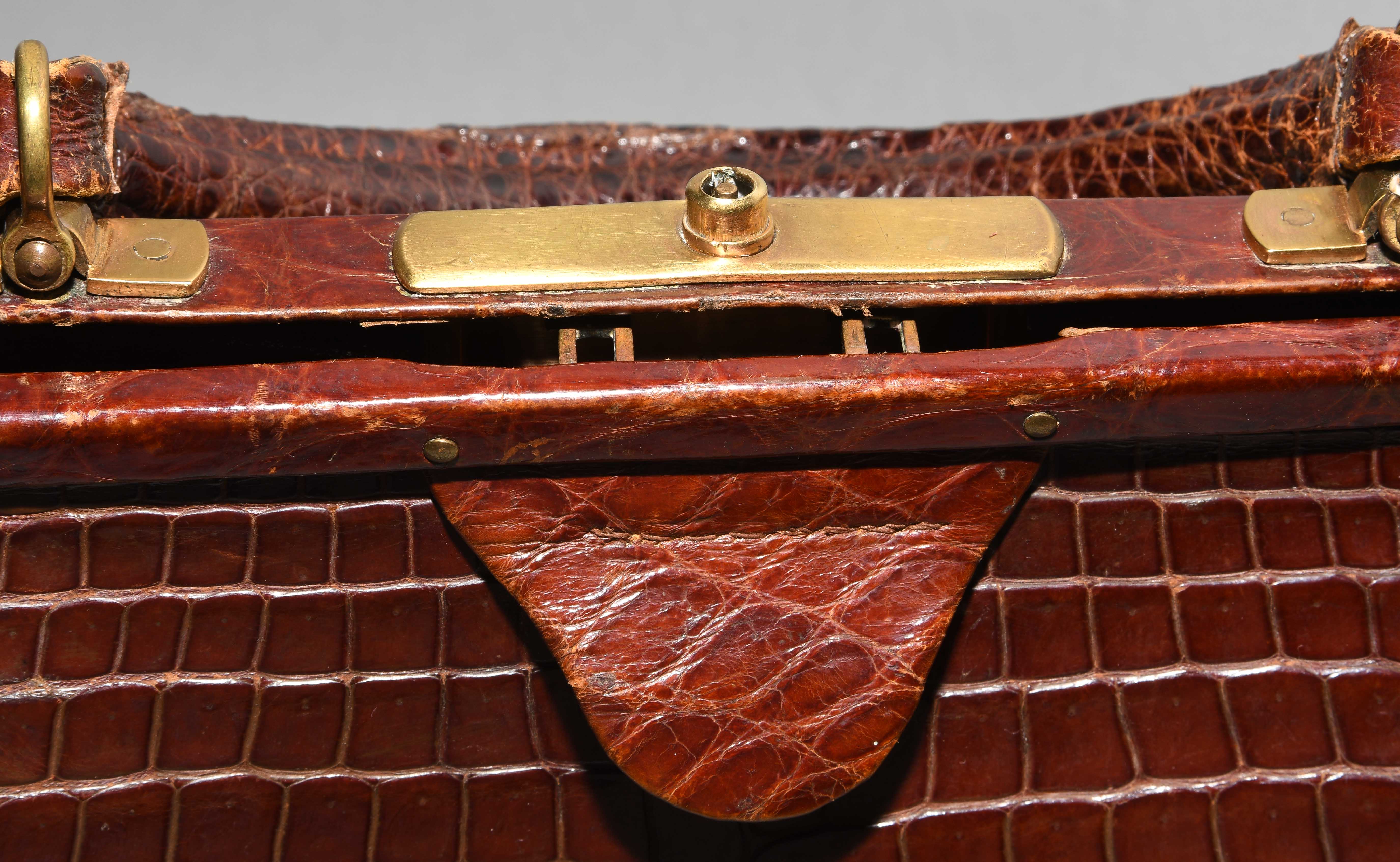 Gemarkt "Hermès Paris". Aus dunkelbraunem Krokodilleder. Vergoldete Metallbeschläge. Verschliessbares Hauptfach. Separates Scmuckfach ebenfalls verschliessbar. Zwei Schlüsseln. 26x24x12,5 cm. Alters- und Gebrauchsspuren.