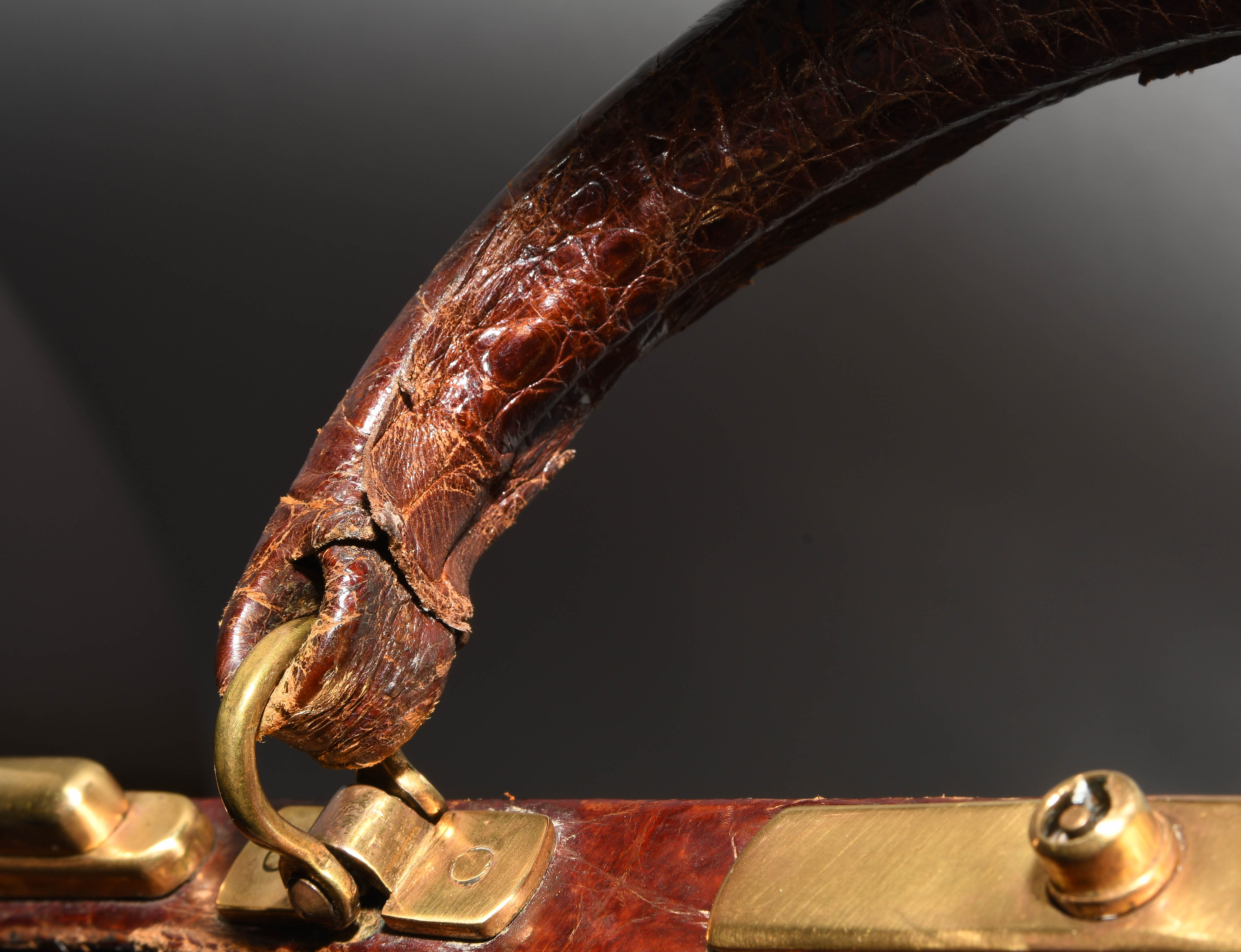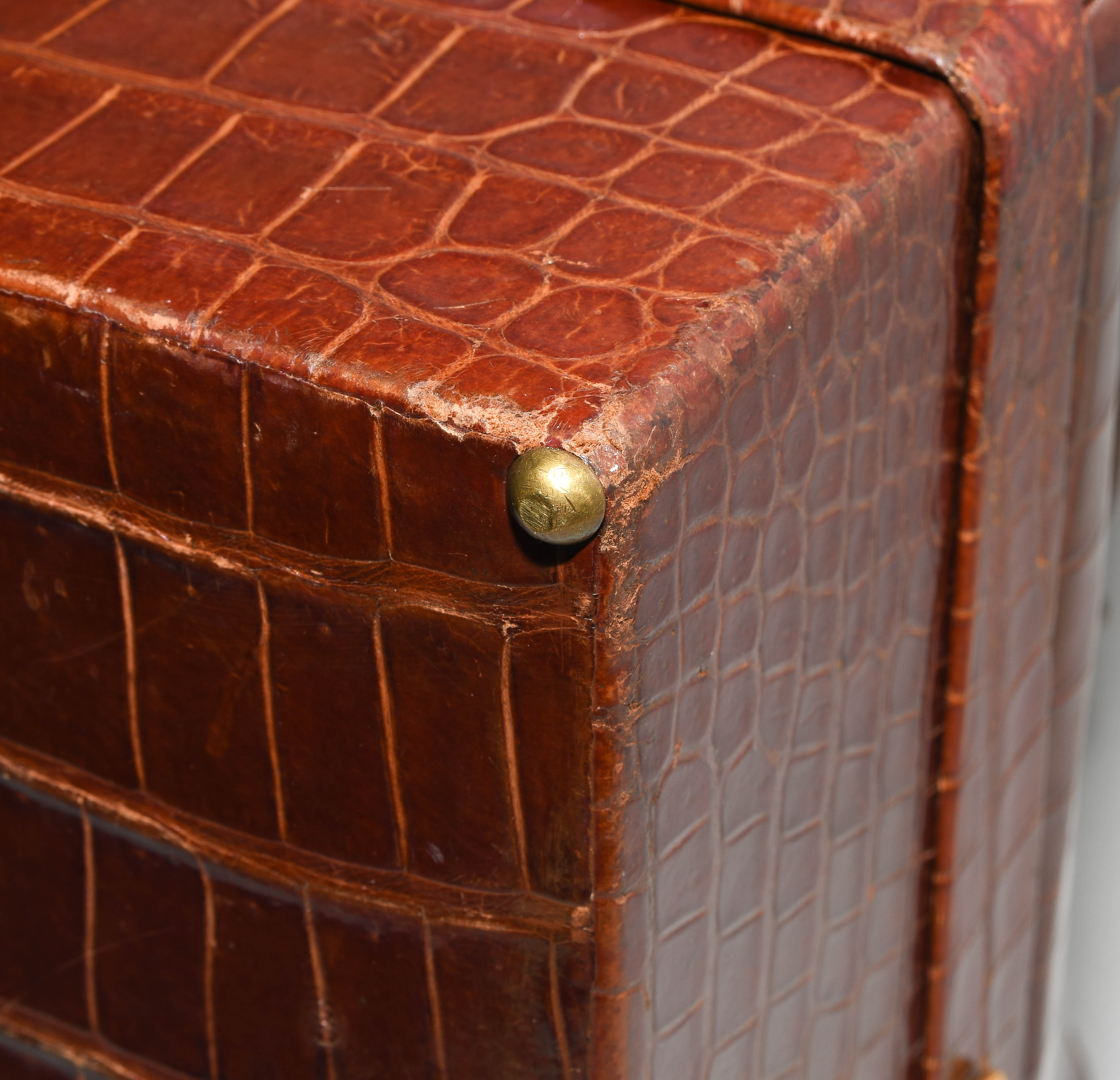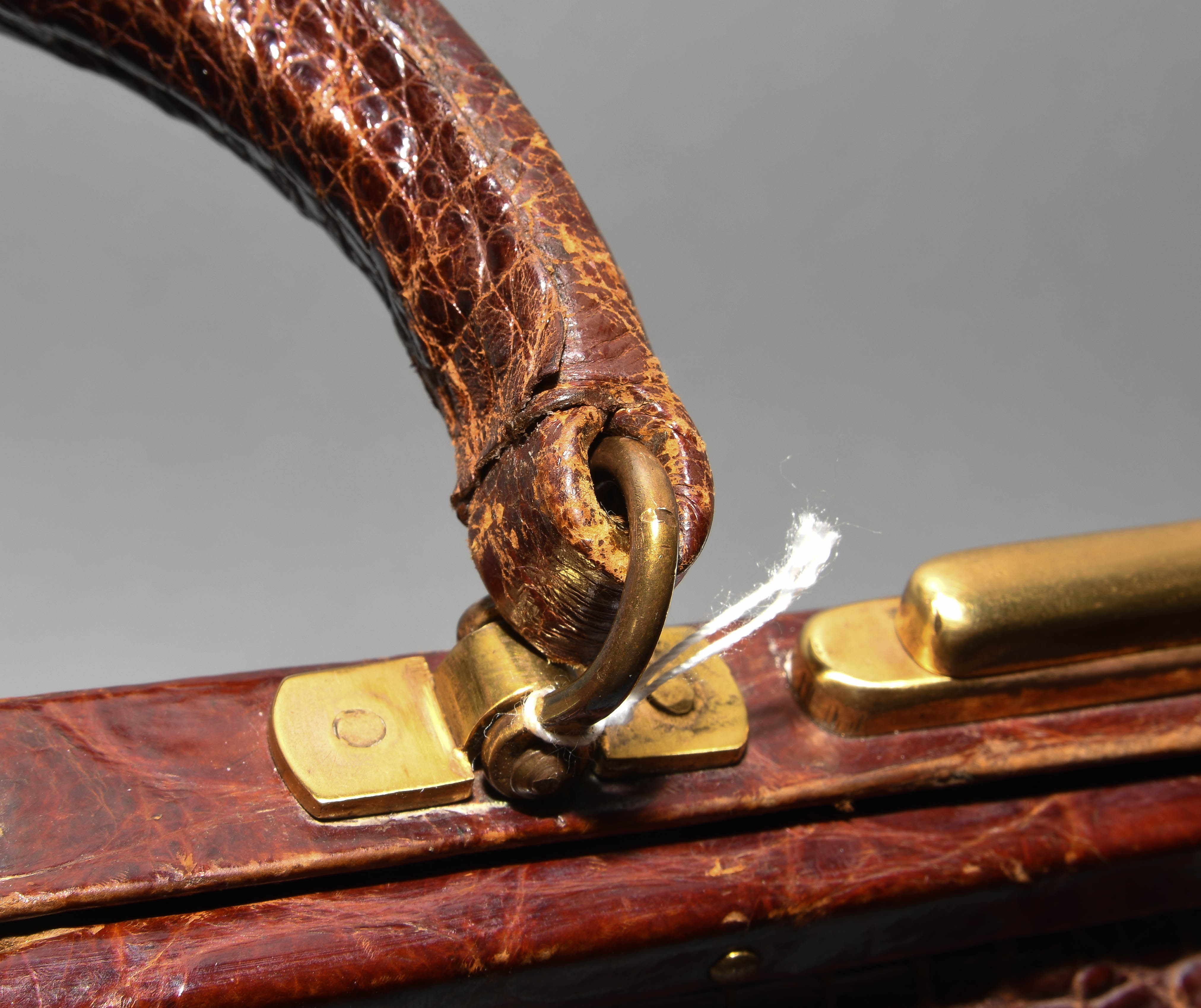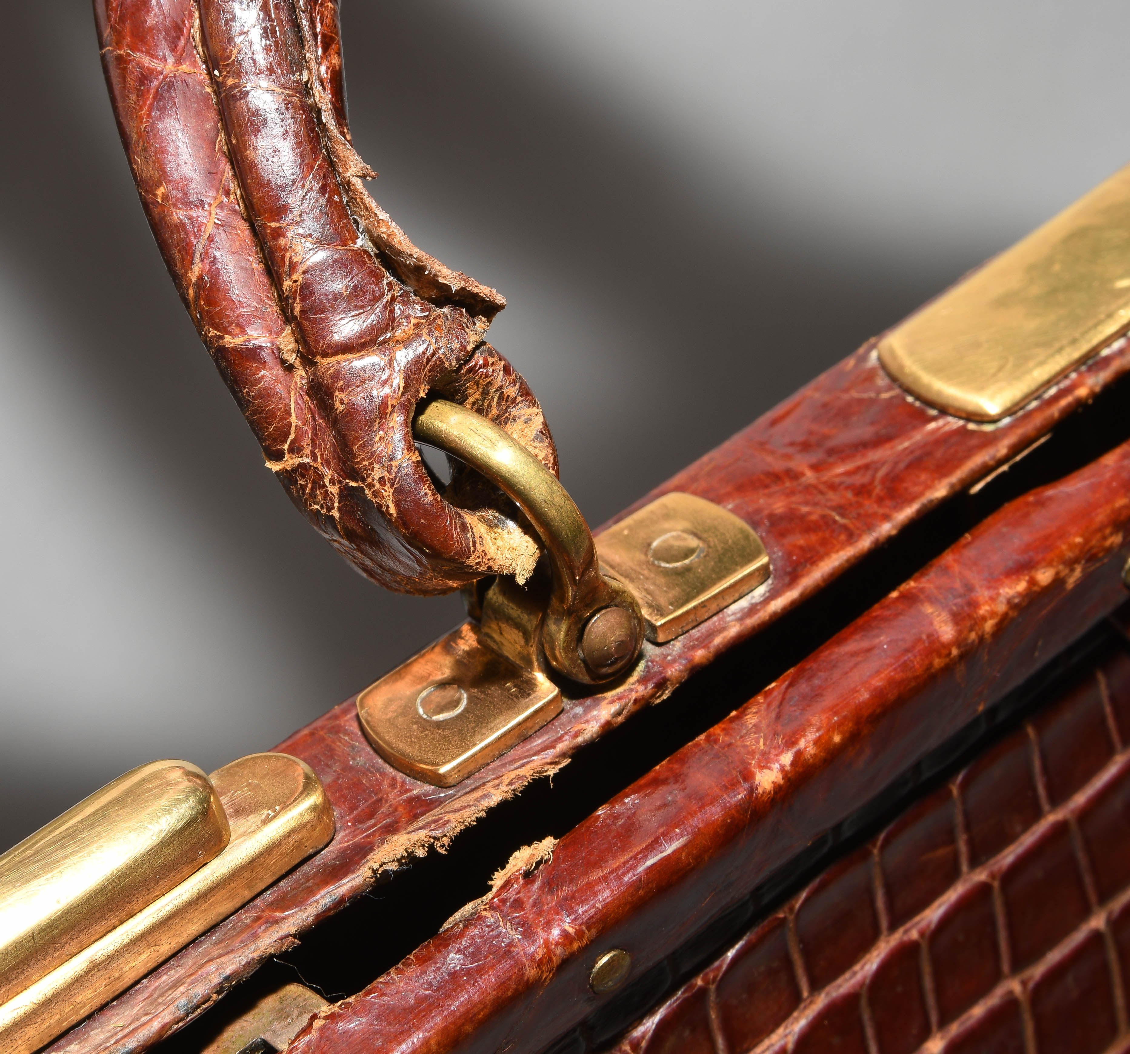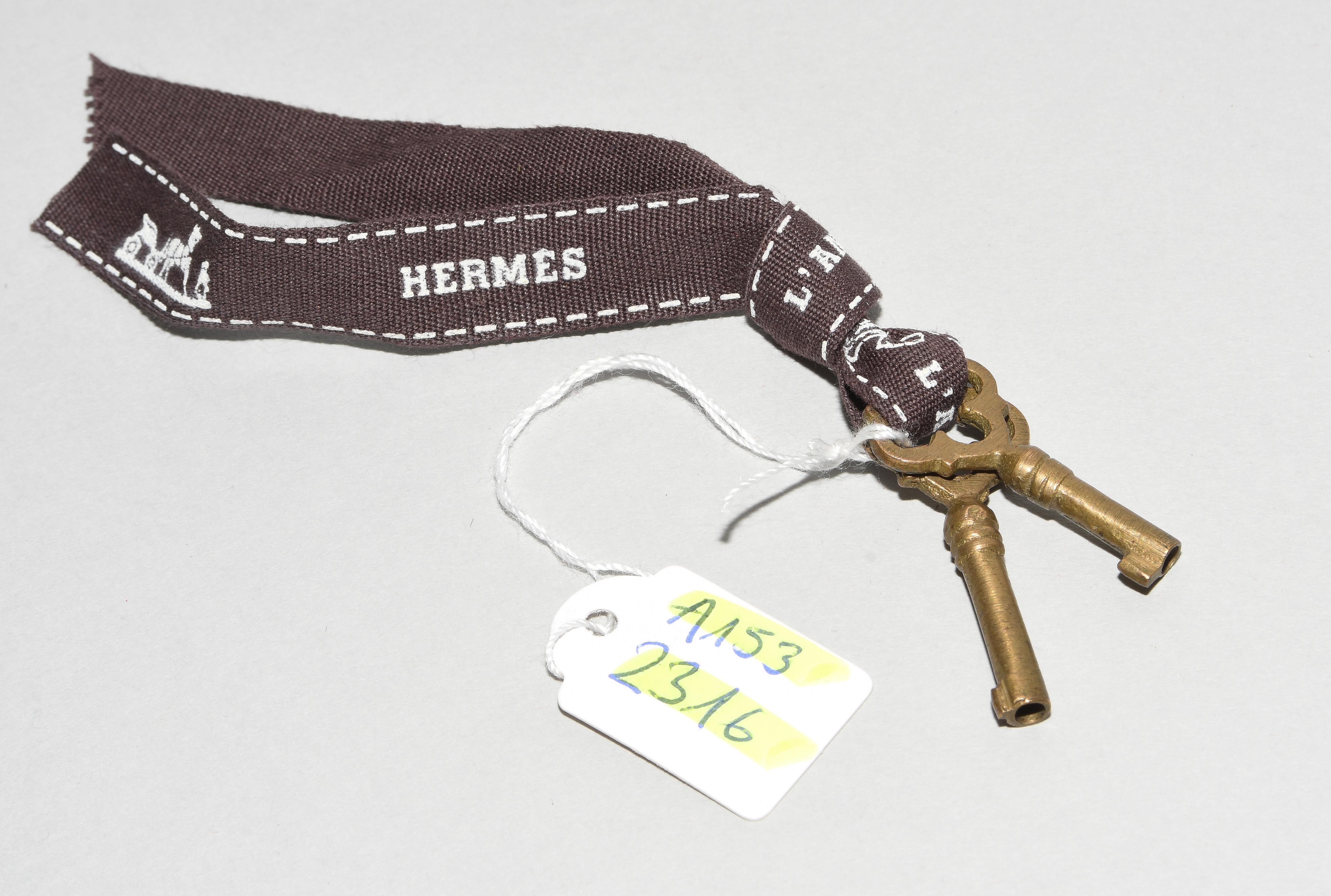 Gemarkt "Hermès Paris". Aus dunkelbraunem Krokodilleder. Vergoldete Metallbeschläge. Verschliessbares Hauptfach. Separates Scmuckfach ebenfalls verschliessbar. Zwei Schlüsseln. 26x24x12,5 cm. Alters- und Gebrauchsspuren.