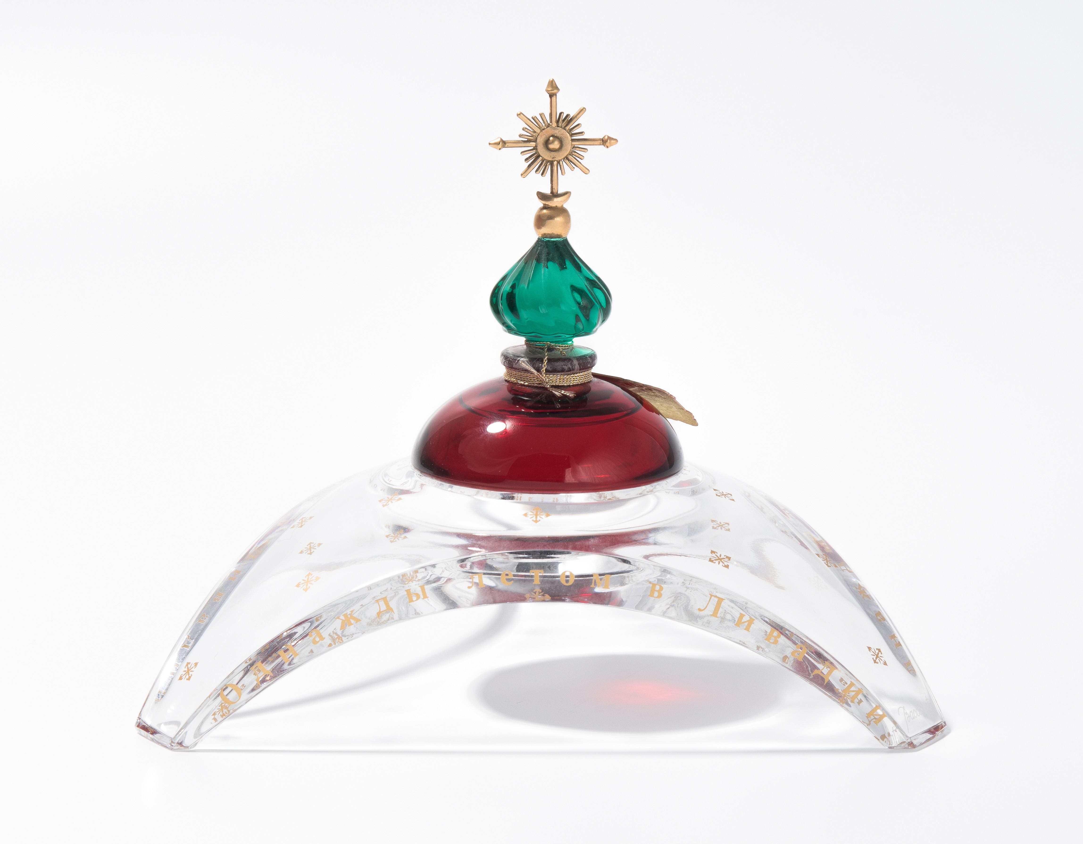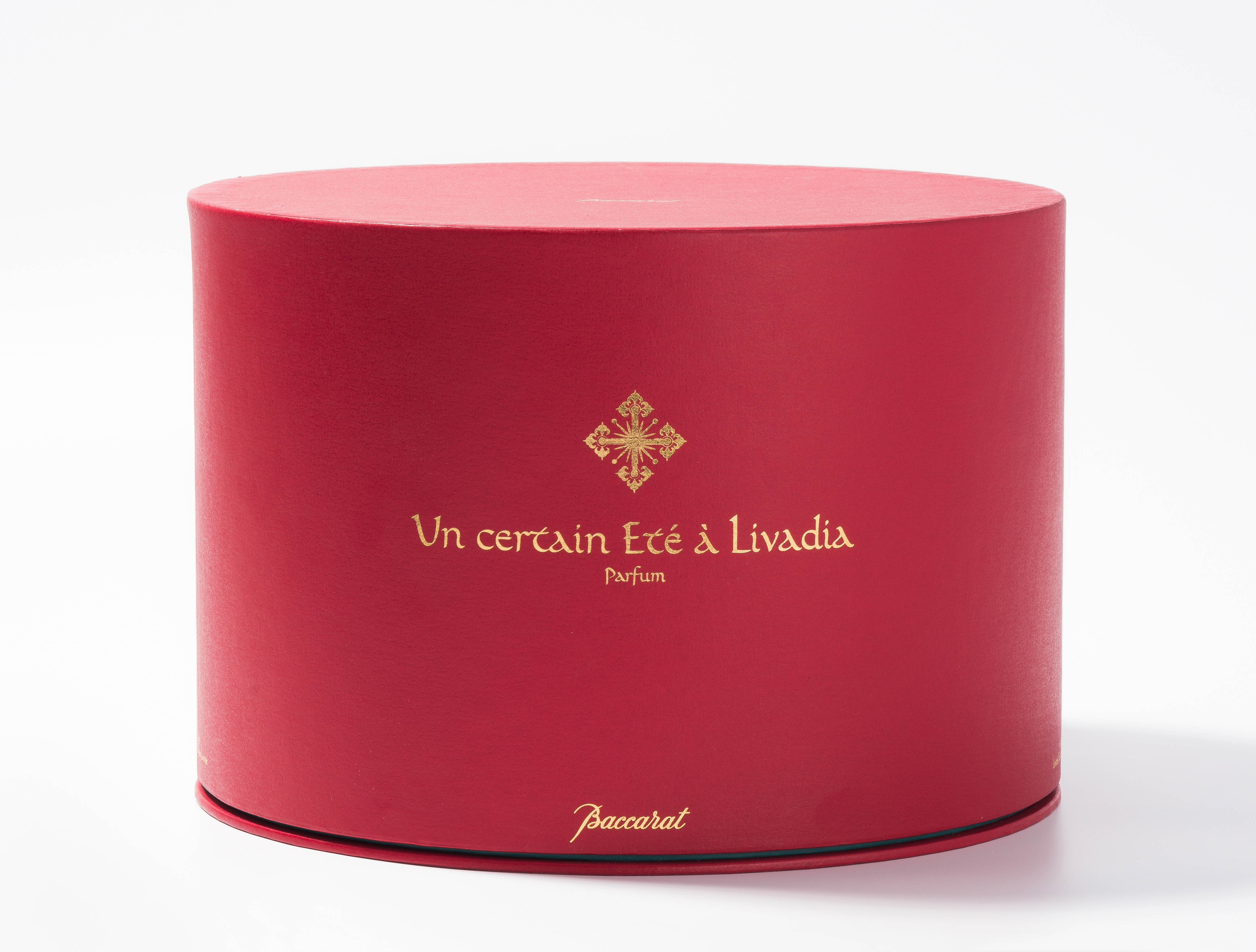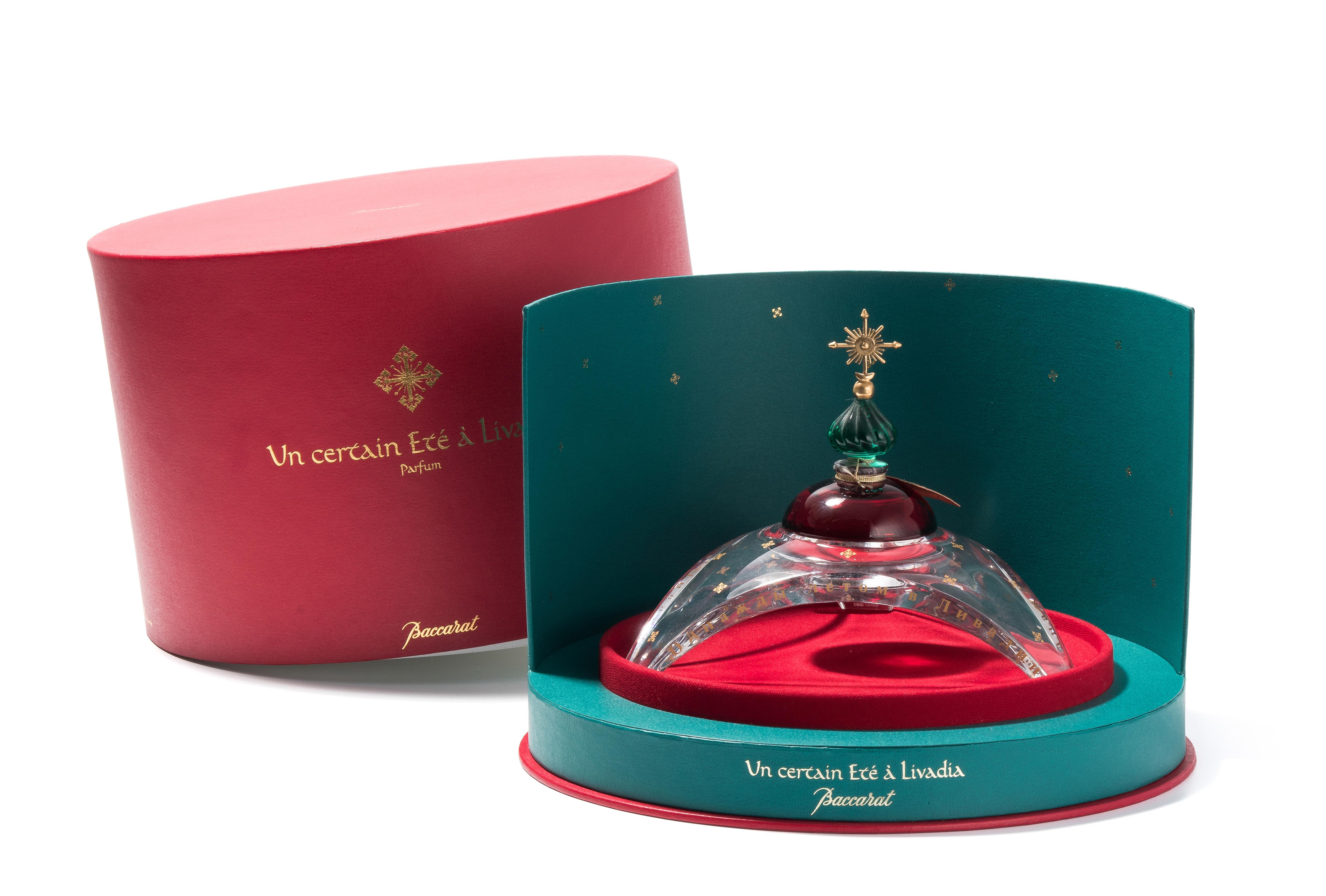 Parfum "Un certain Eté à Livadia". Erscheinungsjahr 2000. Limitierte Auflage. Farbloses, grünes und rotes Kristallglas, Golddekor, Metall. Mit Originalverpackung. 30 ml-1 fl.oz. Bezeichnet und nummeriert: Baccarat, 350/1500. H (Flakon mit Sockel) 12,5 cm.