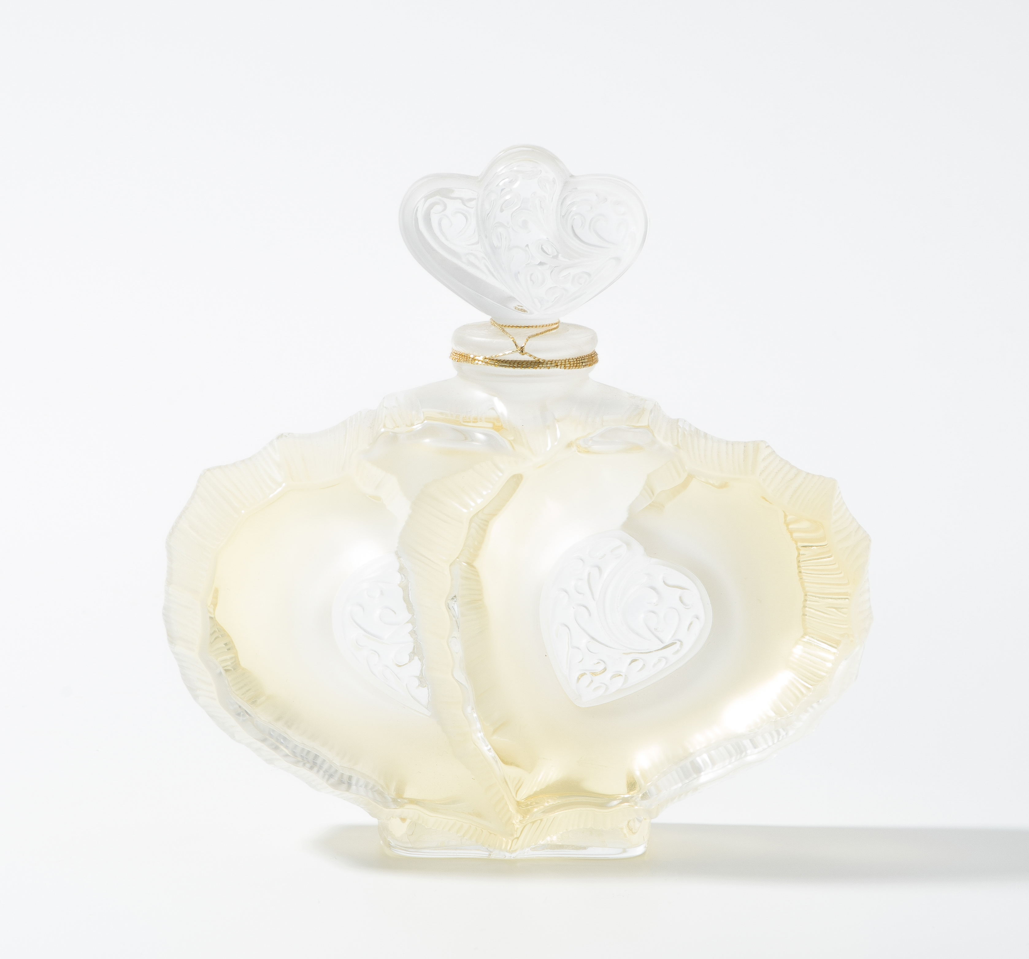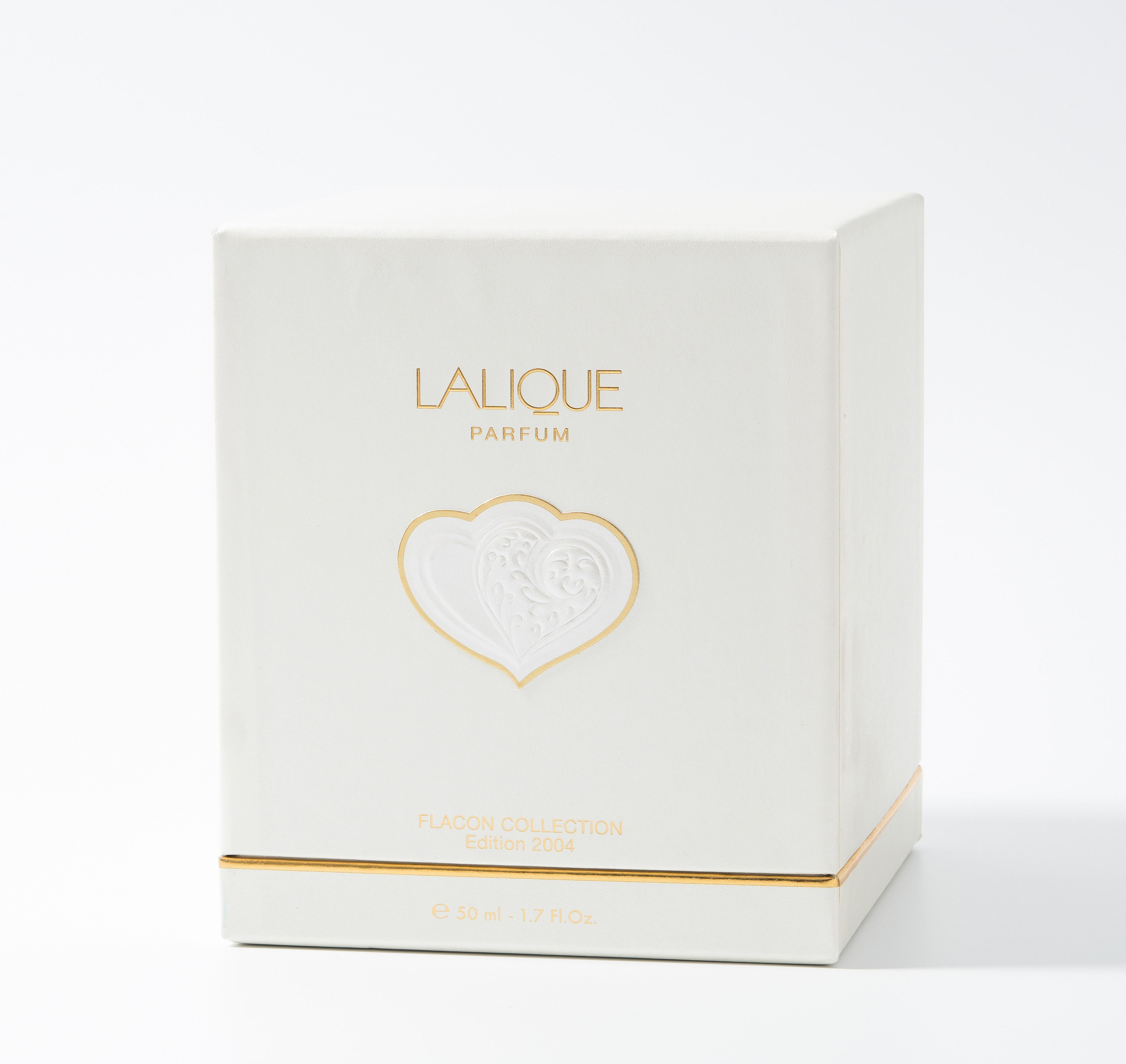 Parfum "Deux coeurs". Flacon Collection Edition 2004, limitierte Auflage. Farbloses Kristallglas, moulé pressé. Mit Originalverpackung. 50 ml-1.7 fl.oz. Bezeichnet und nummeriert: Lalique France, B 442. H (Flakon) 11 cm.