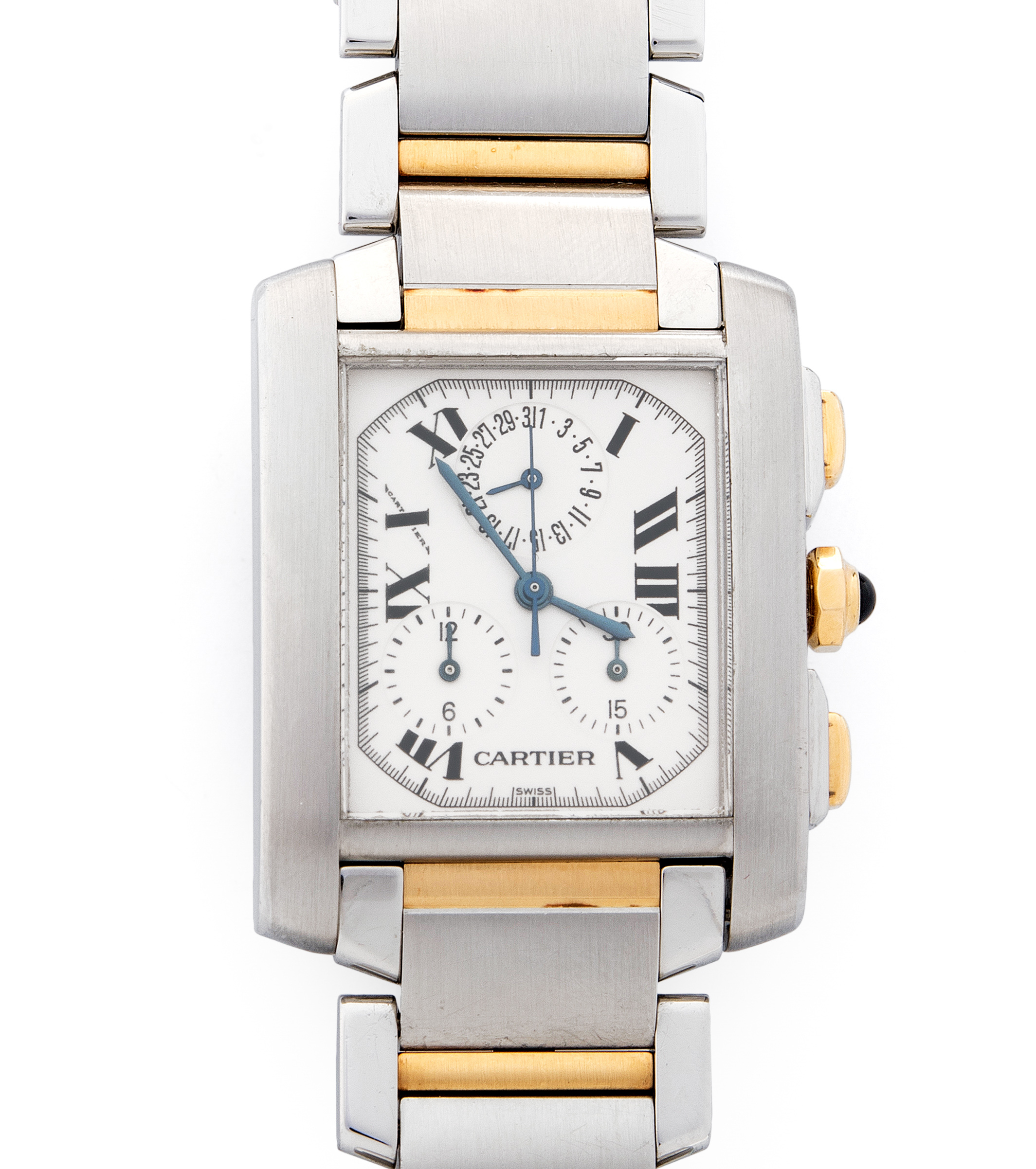 Rechteckiger, automatischer Chronograph 80er Jahre in Edelstahl-/Gelbgoldgehäuse. Boden verschraubt, Gehäusenummer 149737BB, Referenznummer 2303, 29x36 mm. Cremefarbenes Zifferblatt mit römischen Stundenzahlen, Stab-Zeiger, zentraler Chronographenzeiger. Drei Hilfszifferblätter, 30 Minuten-, 12 Stunden- und Datumsanzeige. Gliederarmband mit doppelseitiger Faltschliesse, Umfang 16 cm. Box und Ersatzglieder beigegeben. Gebrauchsspuren.