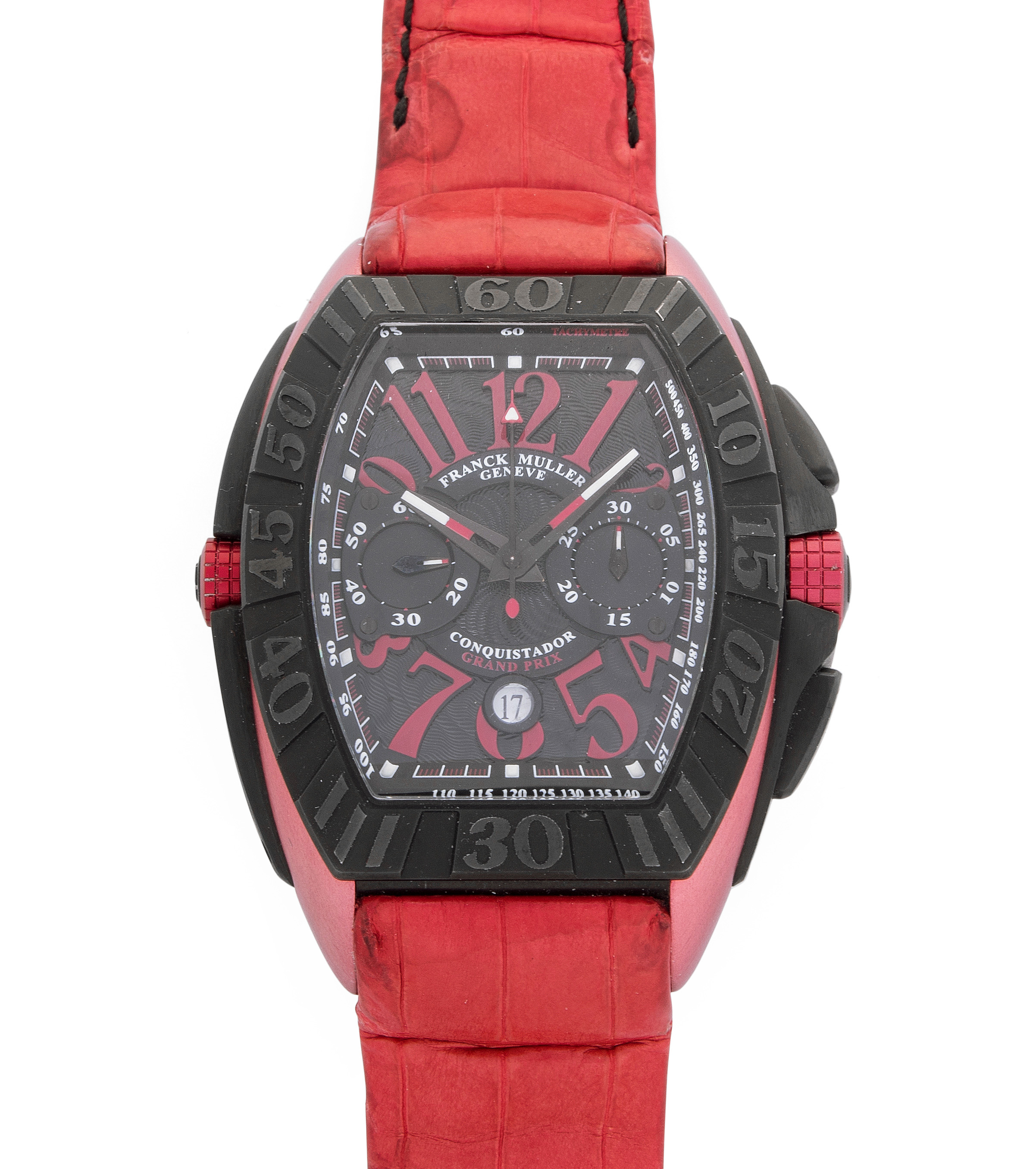 Tonneauförmiger, automatischer Chronograph 2010 in Ergal-Aluminiumgehäuse. Boden verschraubt, Gehäusenummer 39, Referenznummer 9900 CC GP, 42x49 mm. Schwarzes Zifferblatt mit roten, arabischen Stundenzahlen, Indizes. Stab-Zeiger, zentraler Chronographenzeiger. Zwei Hilfszifferblätter, kleine Sekunden- und 30 Minutenanzeige, Datumsfenster. Rotes Lederarmband mit Dornschliesse. Box und Zertifikat beigegeben. Gebrauchsspuren.