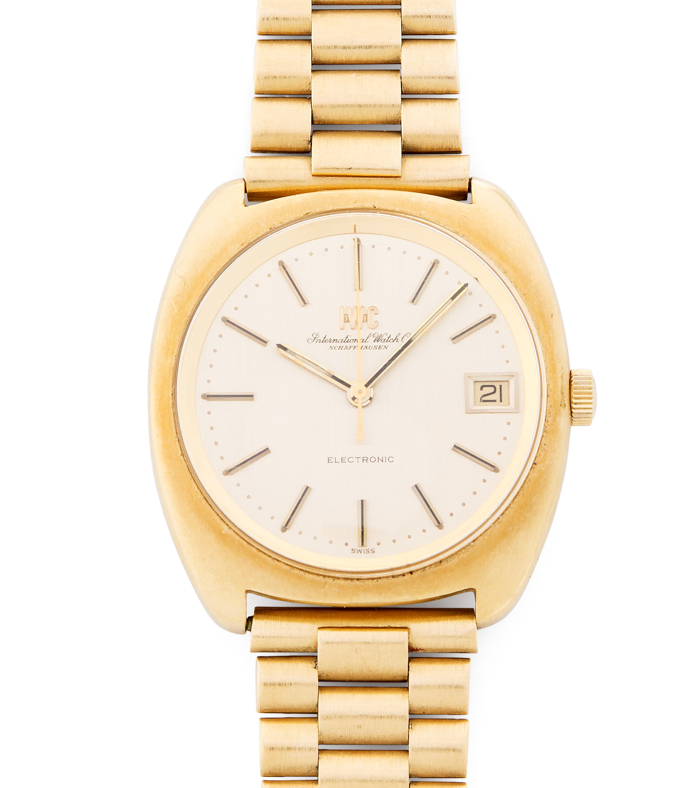 Runde Armbanduhr 1971 mit Quarzwerk in tonneauförmigem 750 Gelbgoldgehäuse mit Armband ca. 60 g. Boden gedrückt, Werknummer 2185566, Kaliber 150, Gehäusenummer 2054035, D 37 mm. Goldfarbenes Zifferblatt mit Stundenindizes, Stab-Zeiger, zentraler Sekundenzeiger, Datumsfenster. Gliederarmband mit einseitiger Faltschliesse, Umfang 16 cm. Gebrauchsspuren. Batterie ersetzt 04/19.