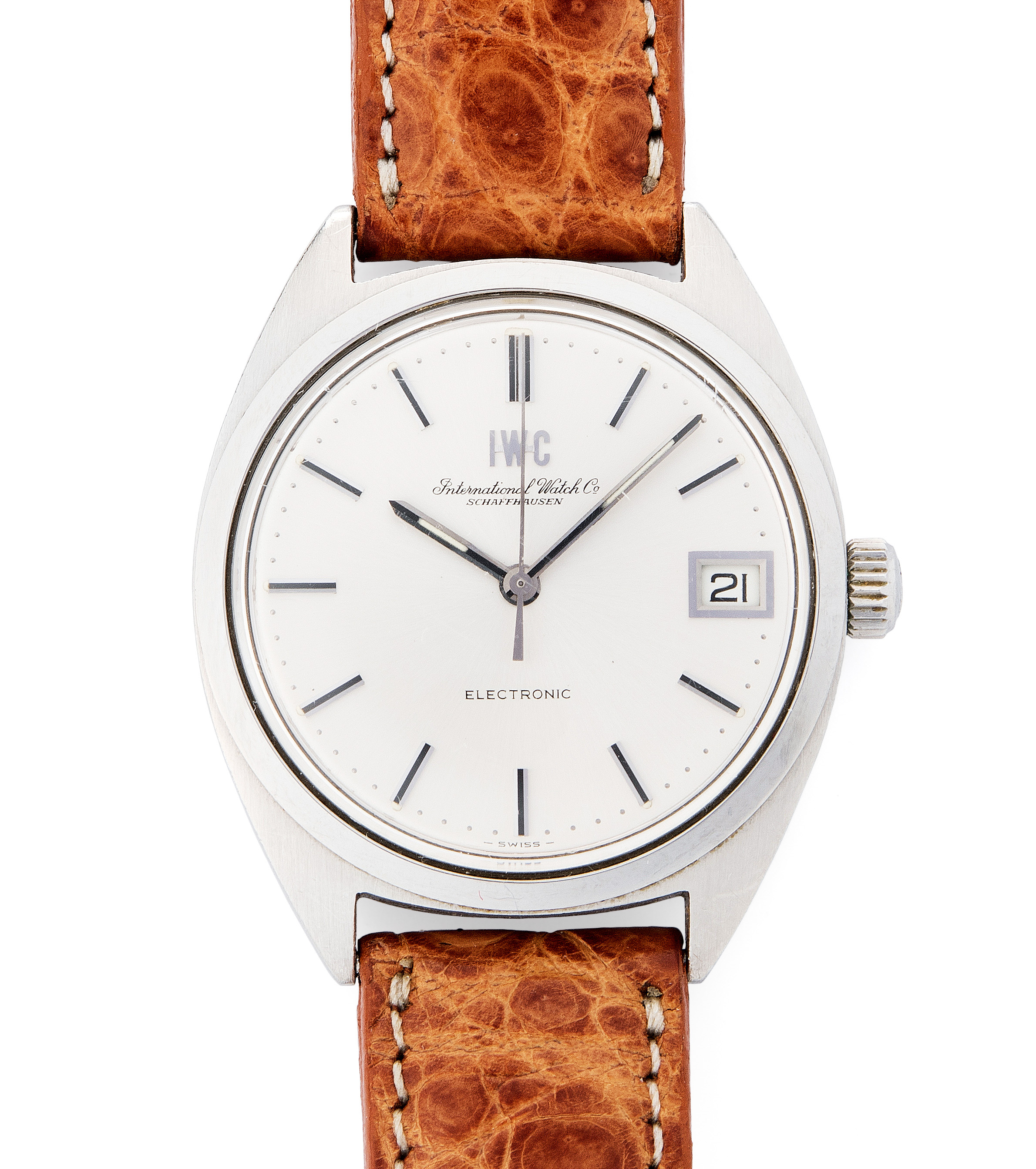 Runde Armbanduhr 80er Jahre mit Quarzwerk in tonneauförmigem Stahlgehäuse. Boden gedrückt, Werknummer 2190332, Kaliber 150, Gehäusenummer 2026789, D 36 mm. Silberfarbenes Zifferblatt mit Stundenindizes, Stab-Zeiger, zentraler Sekundenzeiger, Datumsfenster. Hellbraunes Lederarmband mit Dornschliesse. Gebrauchsspuren. Batterie ersetzt 04/19.