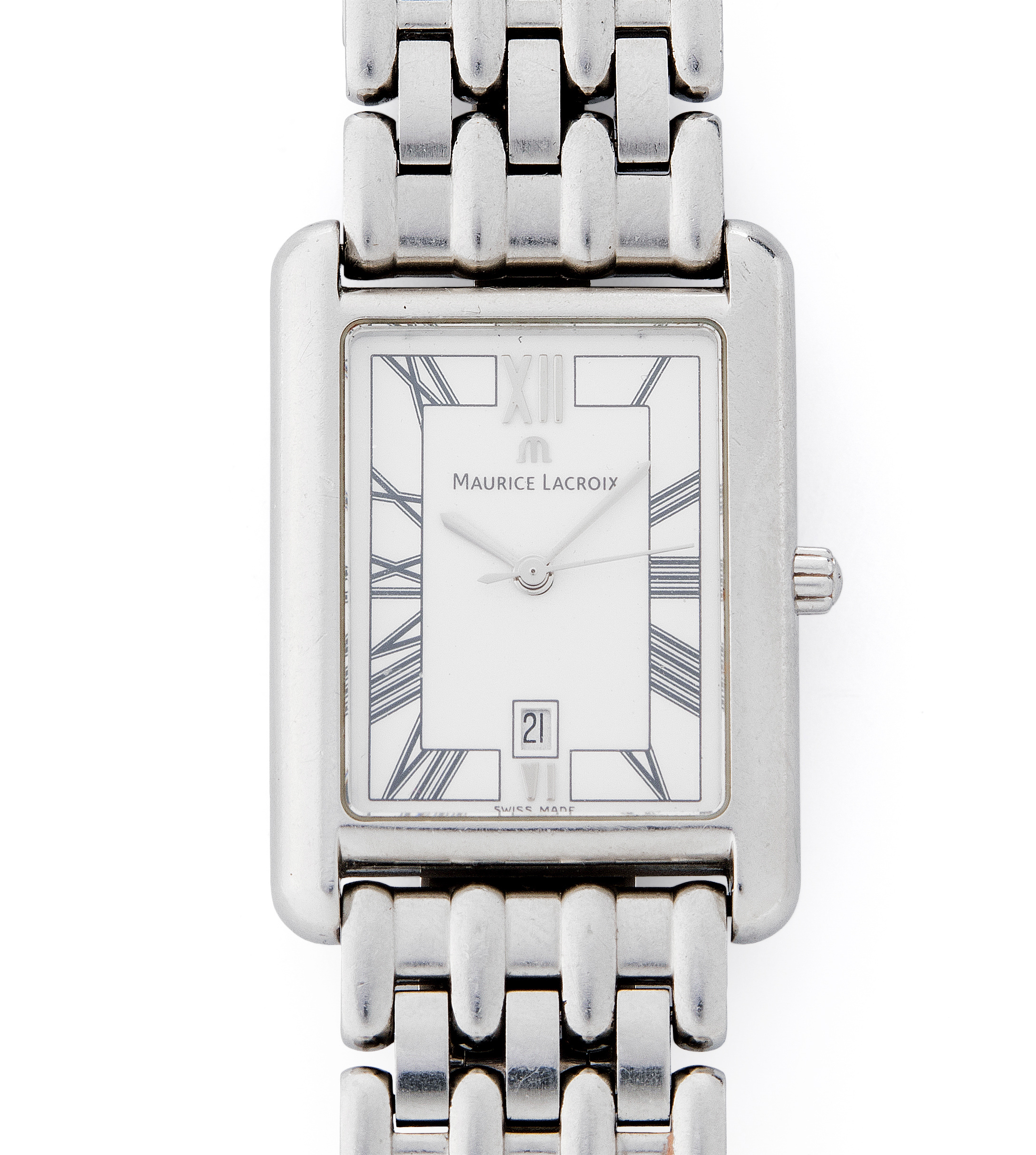 Rechteckige Armbanduhr 80er Jahre mit Quarzwerk in Stahlgehäuse. Boden gedrückt, 26x29 mm. Weisses Zifferblatt mit römischen Stundenzahlen, Stab-Zeiger, zentraler Sekundenzeiger, Datumsfenster. Gliederarmband mit doppelseitiger Faltschliesse, Umfang 16 cm. Gebrauchsspuren. Keine Funktionskontrolle, Batterie nicht ersetzt.