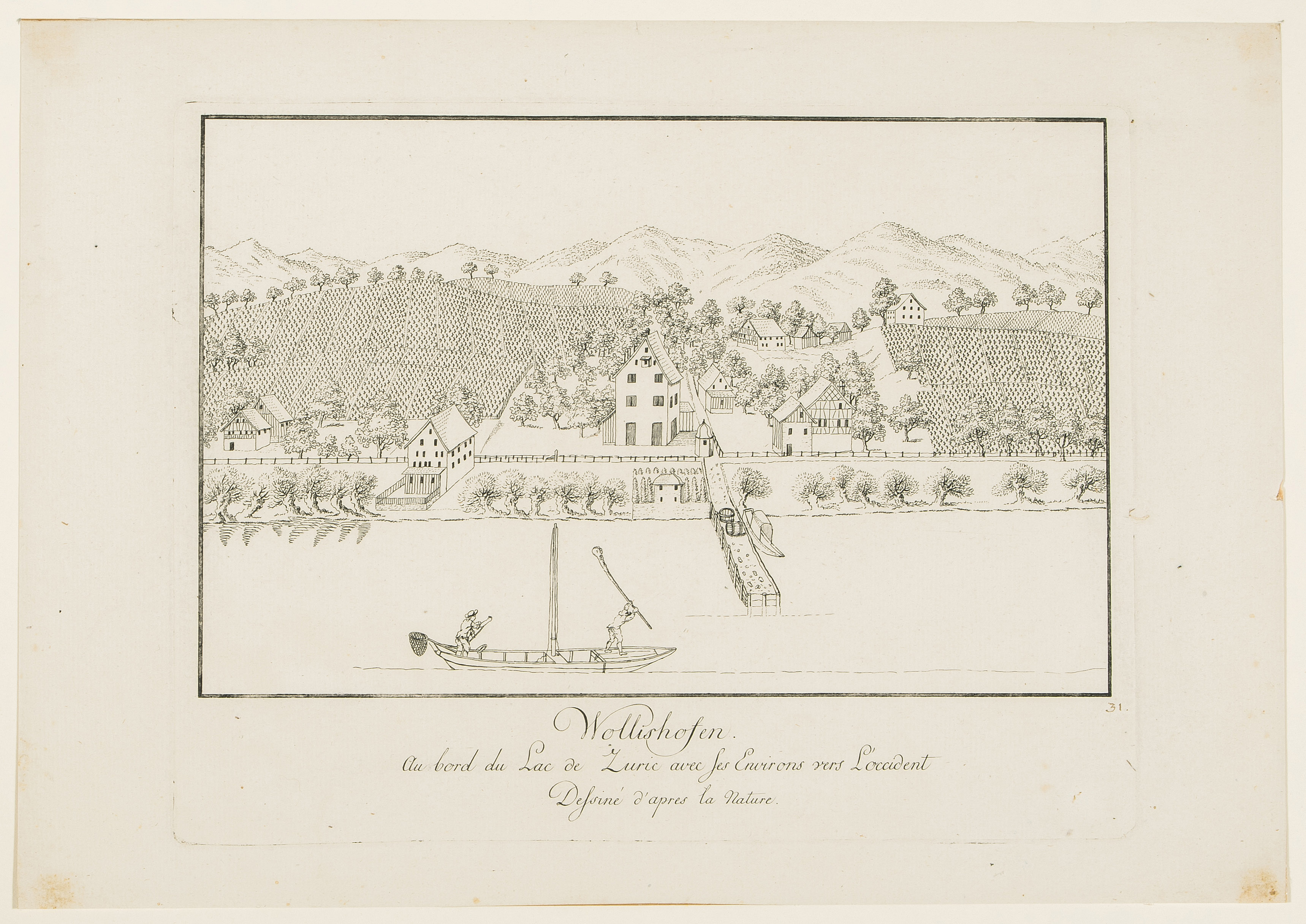 Zürich: "Le Village de Wollishofen. Au bord du Lac de Zuric avec ses Environs vers L'occident". / "Wollishofen. Au bord du Lac de Zuric avec ses Environs vers L'occident". 2 (1 grau laviert) Umrissradierungen, 1794. Je ca. 16,5x25,5 cm. - Stellenweie minimal fleckig.