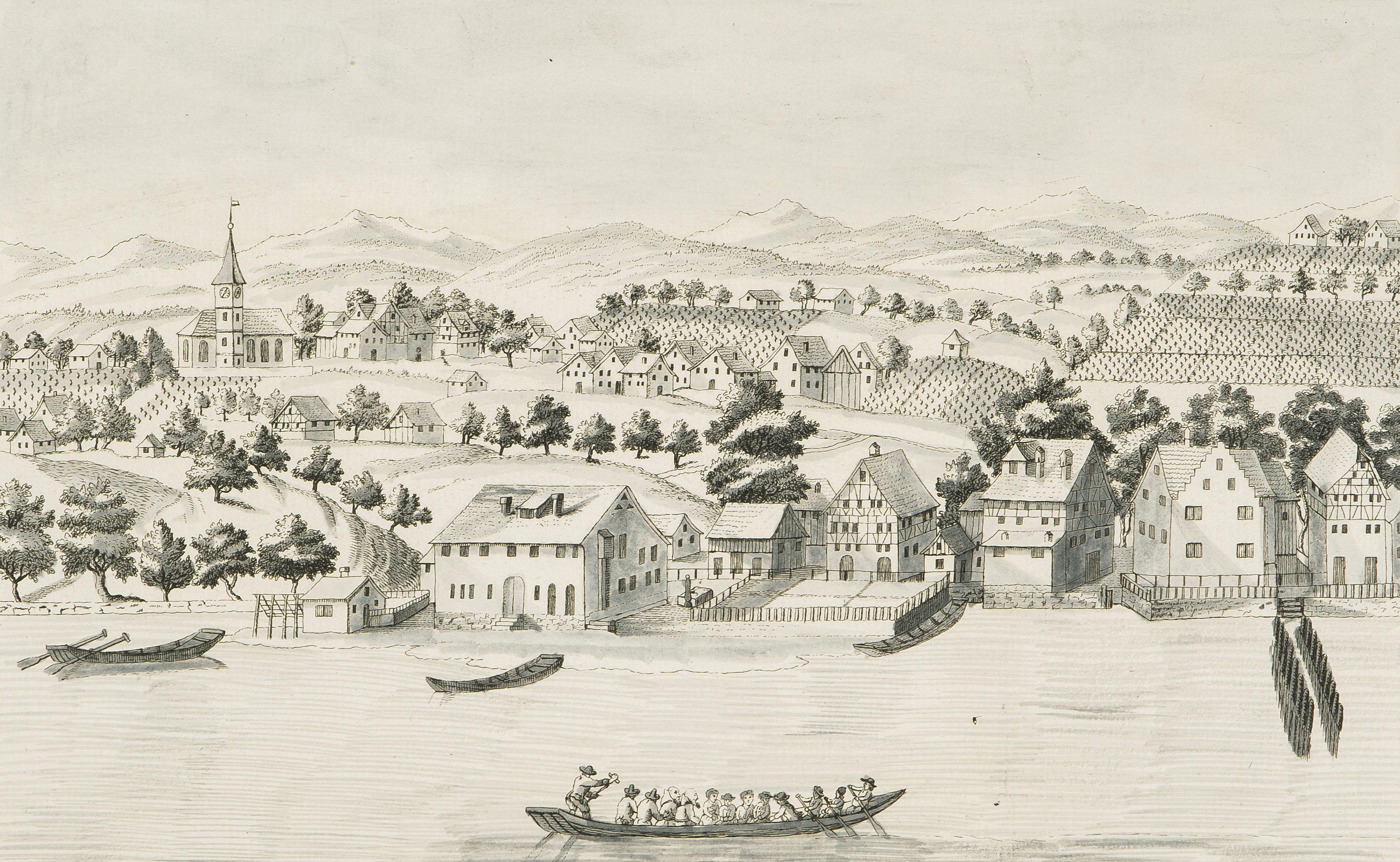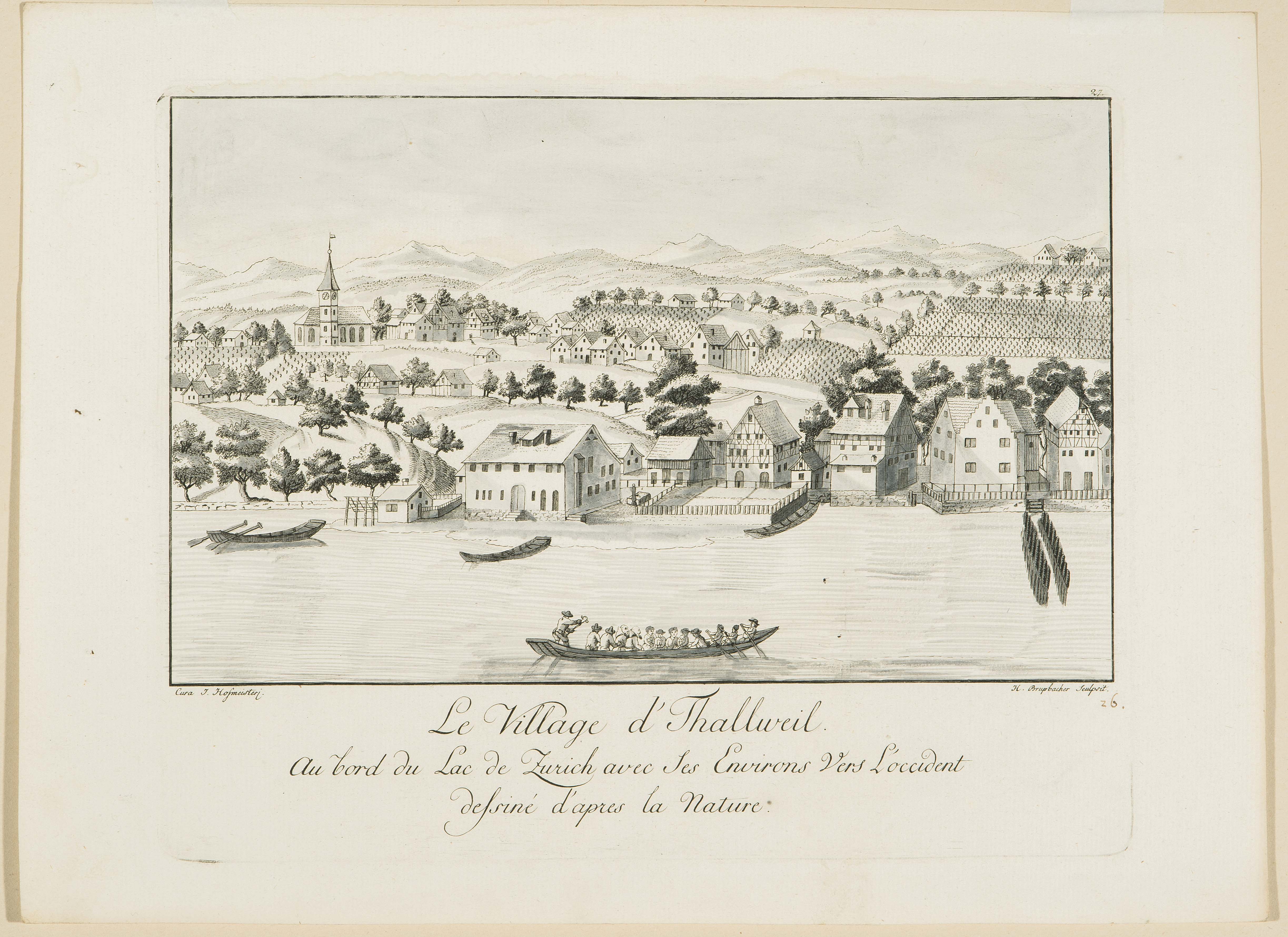 "Le Village d'Thallweil. Au bord du Lac de Zurich avec Ses Environs Vers L'occident". Lavierte Umrissradierung, 1796. 16x25,6 cm.