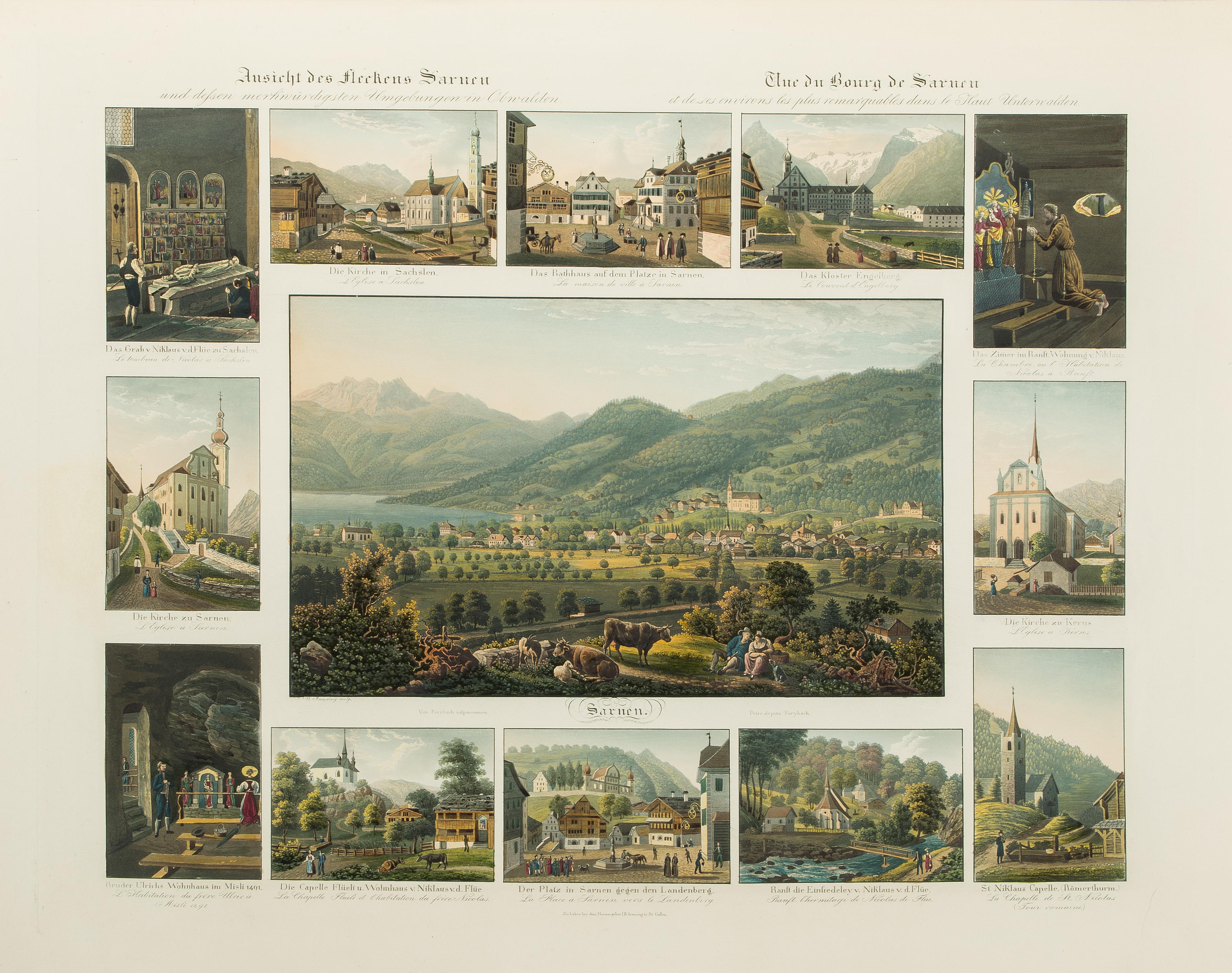 "Ansicht des Fleckens Sarnen und dessen merkwürdigsten Umgebungen in Obwalden". Zentrale Ansicht "Von Forybach aufenommen", umrahmt von 12 Detailansichten von Ort und Umgebung. Altkol. Aquatinta nach D.A. Schmid, 1833/35. 37,2x49,4 cm.