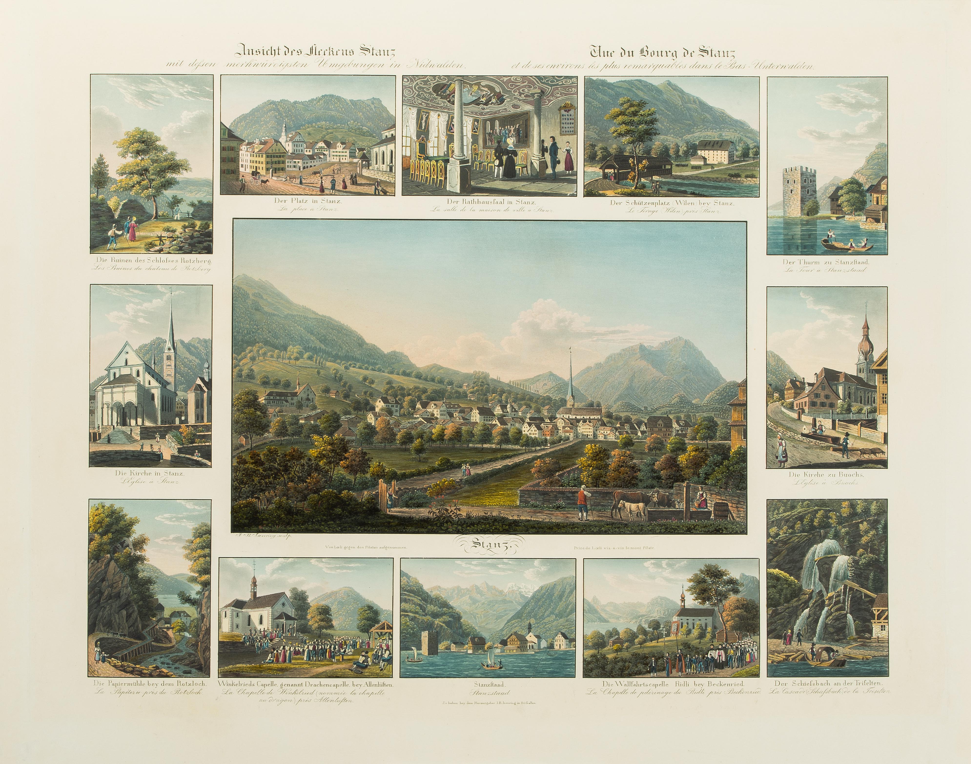 "Ansicht des Fleckens Stanz mit dessen merkwürdigsten Umgebungen in Nidwalden". Zentrale Gesamtansicht "Von Loeli gegen den Pilatus aufgenommen", umrahmt von 12 Detailansichten des Ortes und Kantons. Altkol. Aquatinta nach D.A. Schmid, 1833/35. 36,9x49,5 cm. - Vereinzelt minimale Randmängel.