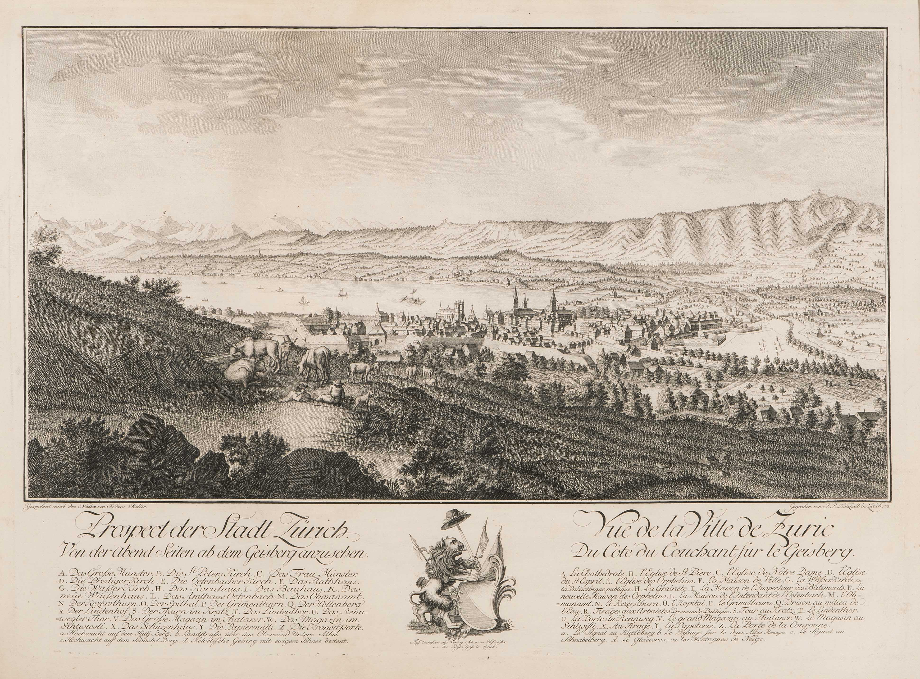 "Prospect der Stadt Zürich. Von der Abend Seiten ab dem Geisberg anzusehen". Radierung von J.R. Holzhalb. Hrsg. v. J. Hofmeister, 1778/81. 29x52,7 cm. Gerahmt. - Etwas gebräunt.
