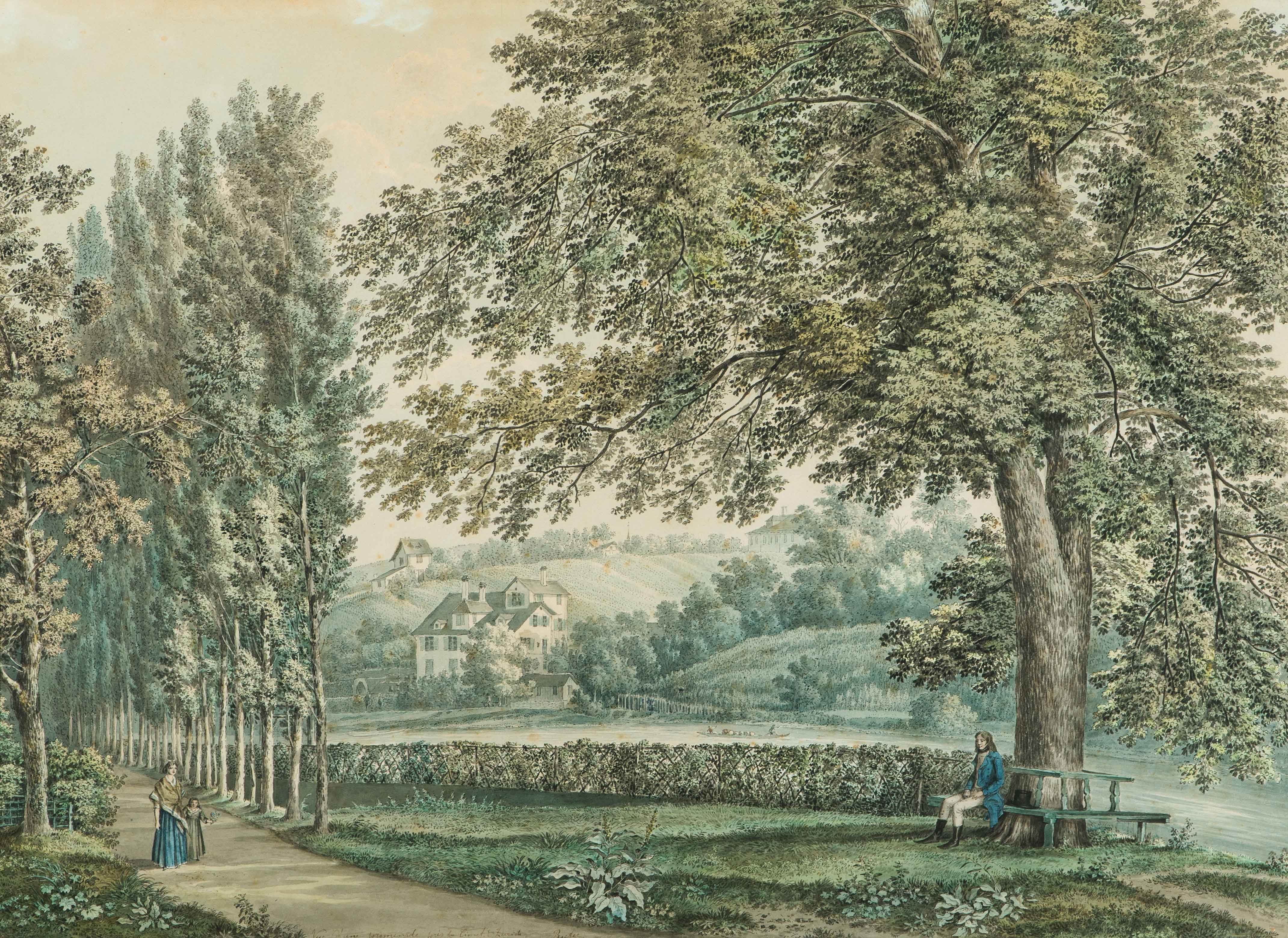 "Vue d'une promenade près du Limat à Zurich". Aquarell und Tuschfeder. Unten signiert und bezeichnet. 40x55,5 cm. Gerahmt. - Teilweise minimal stockfleckig und gebräunt.