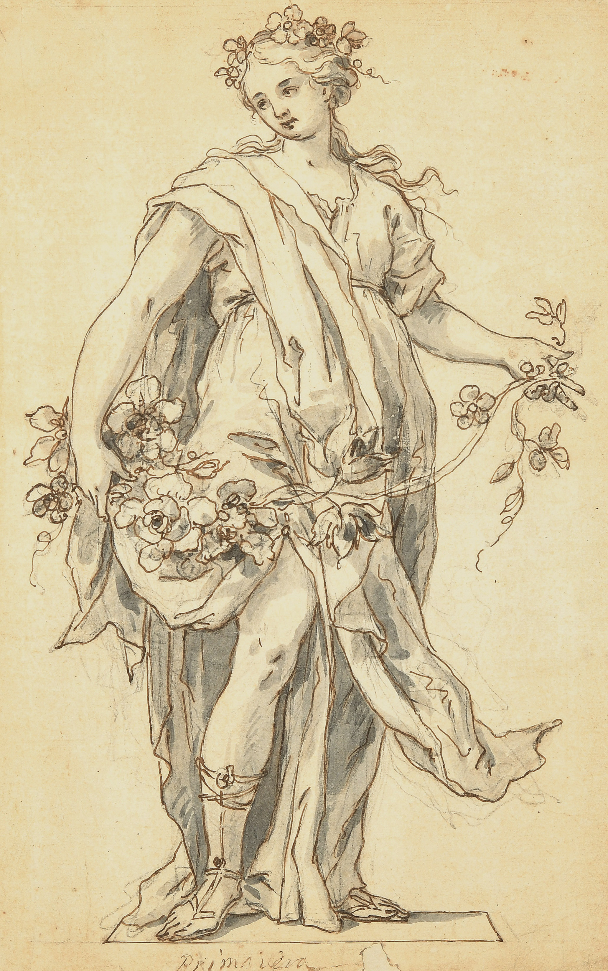 Allegorie des Frühlings (junge Frau mit Blumengirlande). Grau lavierte Federzeichnung in Braun über Kreide, unten alt bezeichn. "Primavera". 19x30 cm. - Alt aufgezogen. Beschabt und berieben.