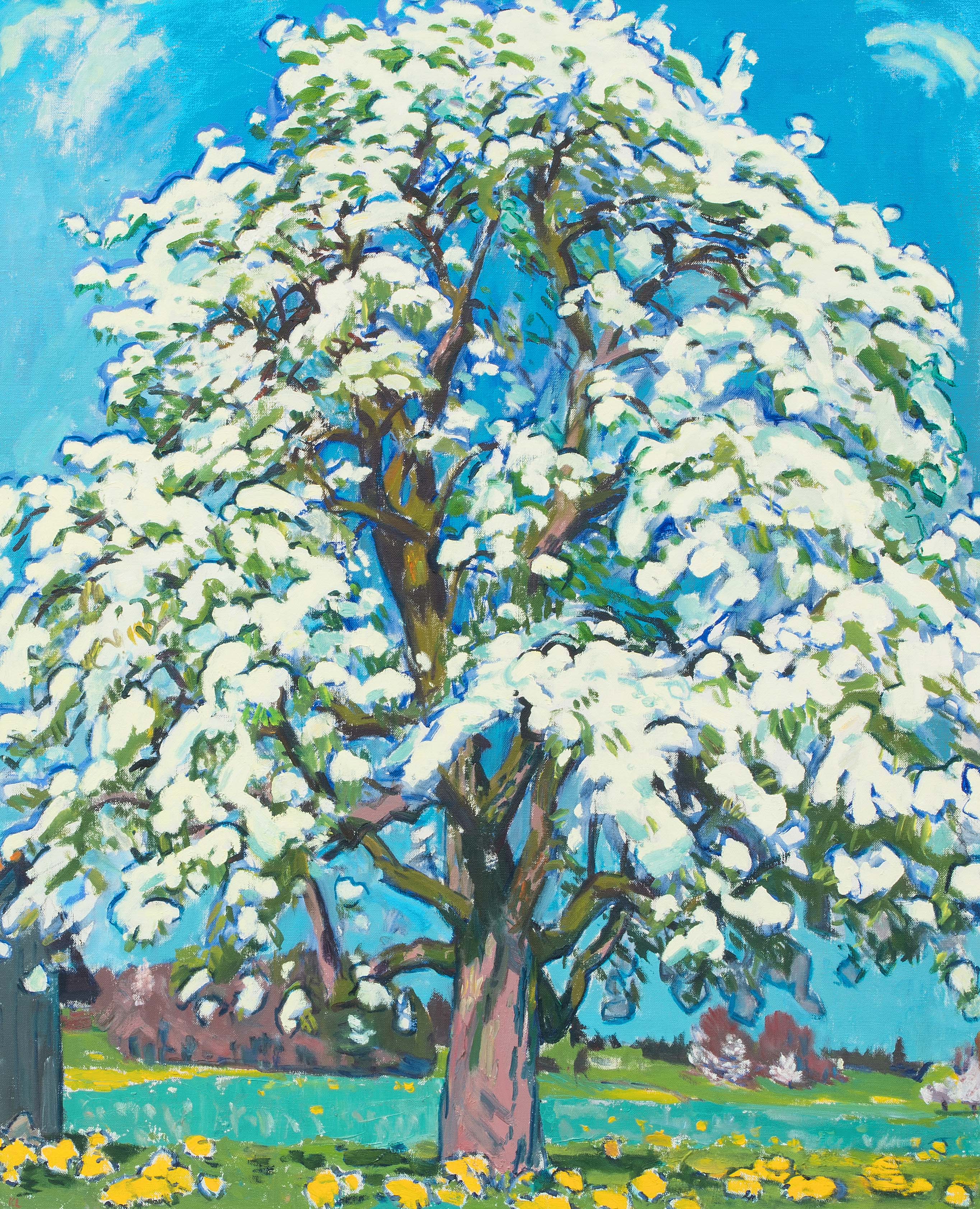 "De gross Birebaum im Bluescht", 1988/89. Öl auf Leinwand. Unten links monogrammiert, verso signiert, bezeichnet und datiert. 100x81 cm.