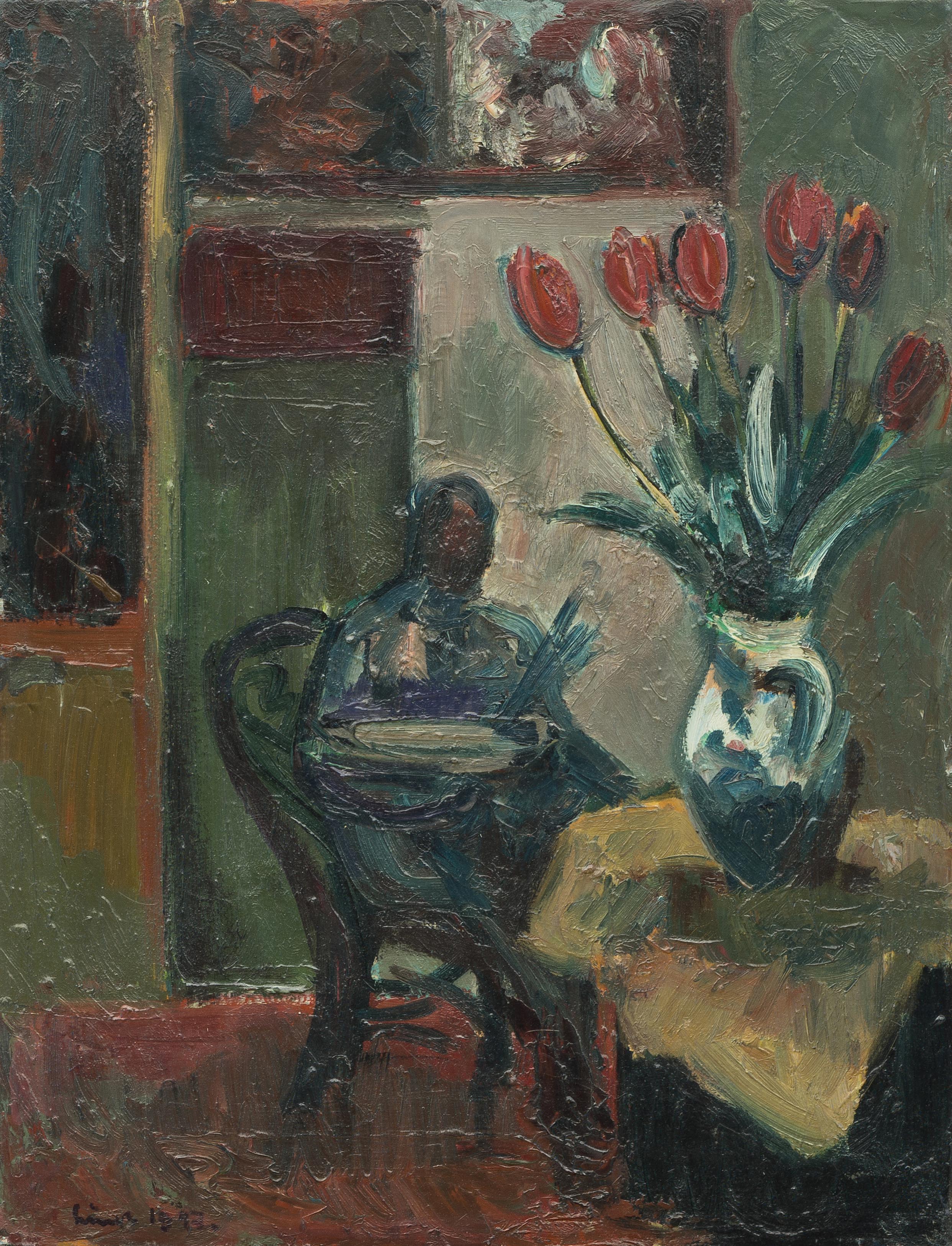 Interieur mit Tulpenstrauss, 1947. Öl auf Leinwand. Unten links signiert und datiert. 60,5x46,5 cm.