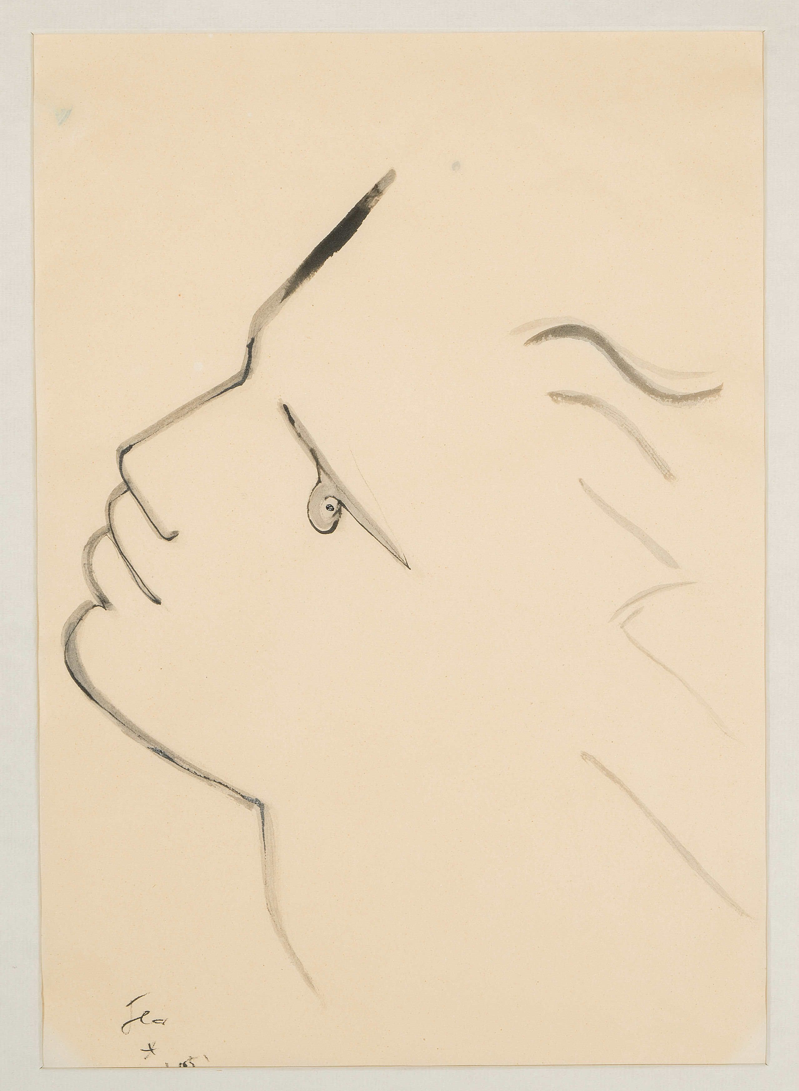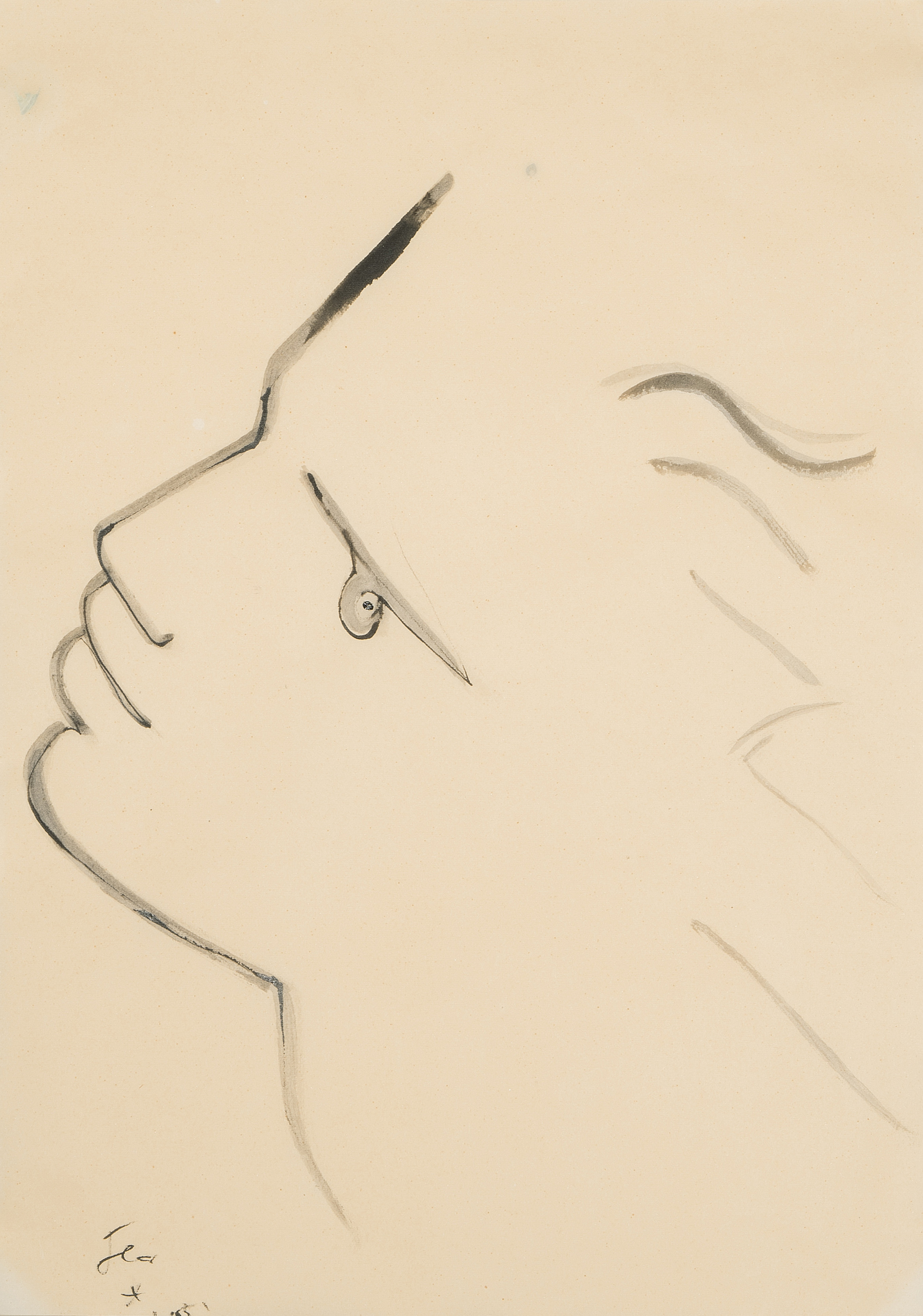 "Profile". 1951. Tusche auf Papier. Unten links signiert und datiert. Blattgrösse 41,9x26,2 cm. Gerahmt. -Blatt leicht gebräunt und leicht fleckig. Hellerer Lichtrand. Wenige Knitter. Linker Rand mit Abrissspuren. Verso in allen Ecken an Passepartout montiert.
