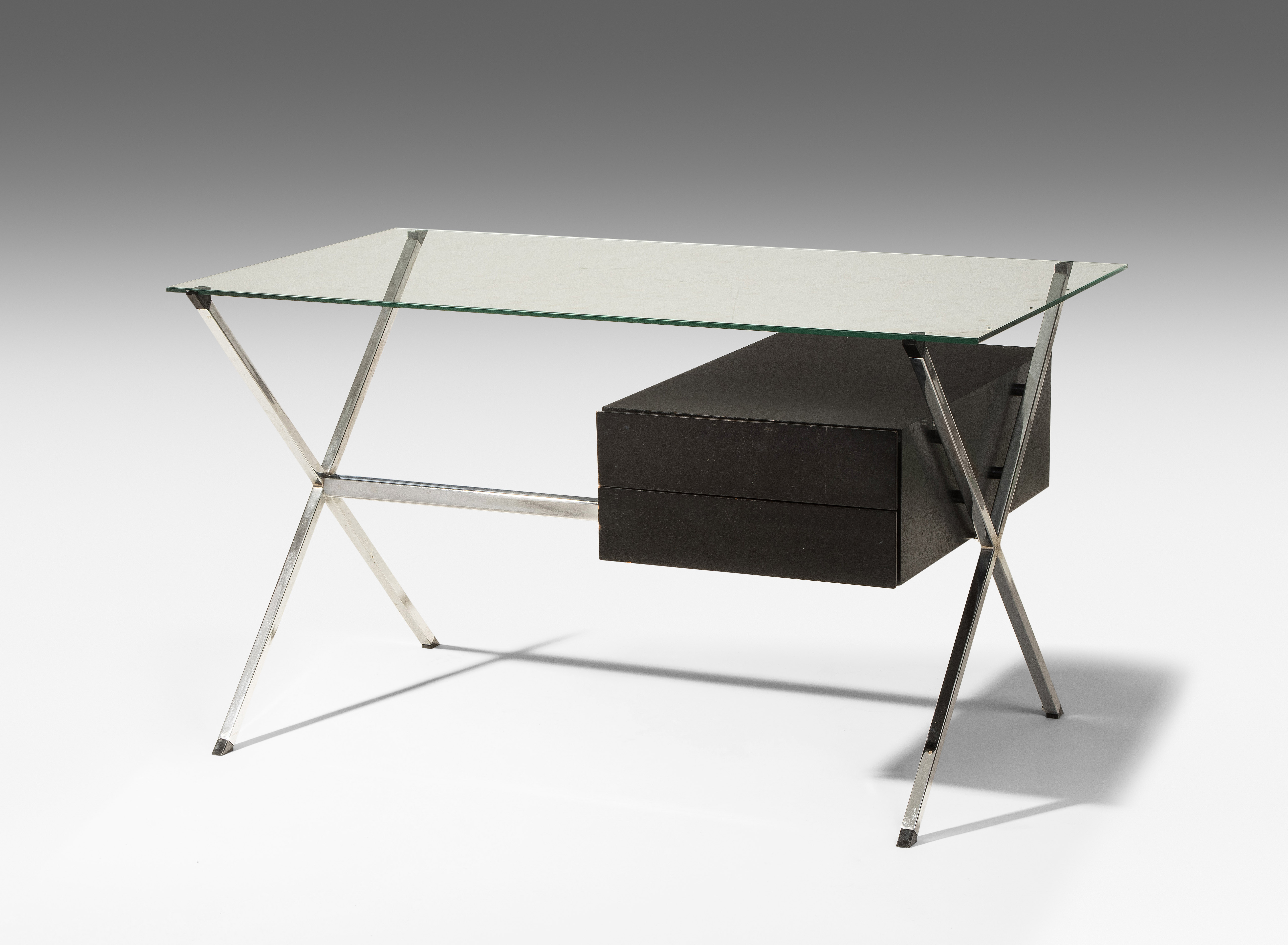 Entwurf 1949. Hersteller: Knoll International. Schreibpult. Platte Glas, Gestell Vierkantstahlrohr verchromt, Schubladen aus schwarz bemaltem Holz. 70x122x67 cm.