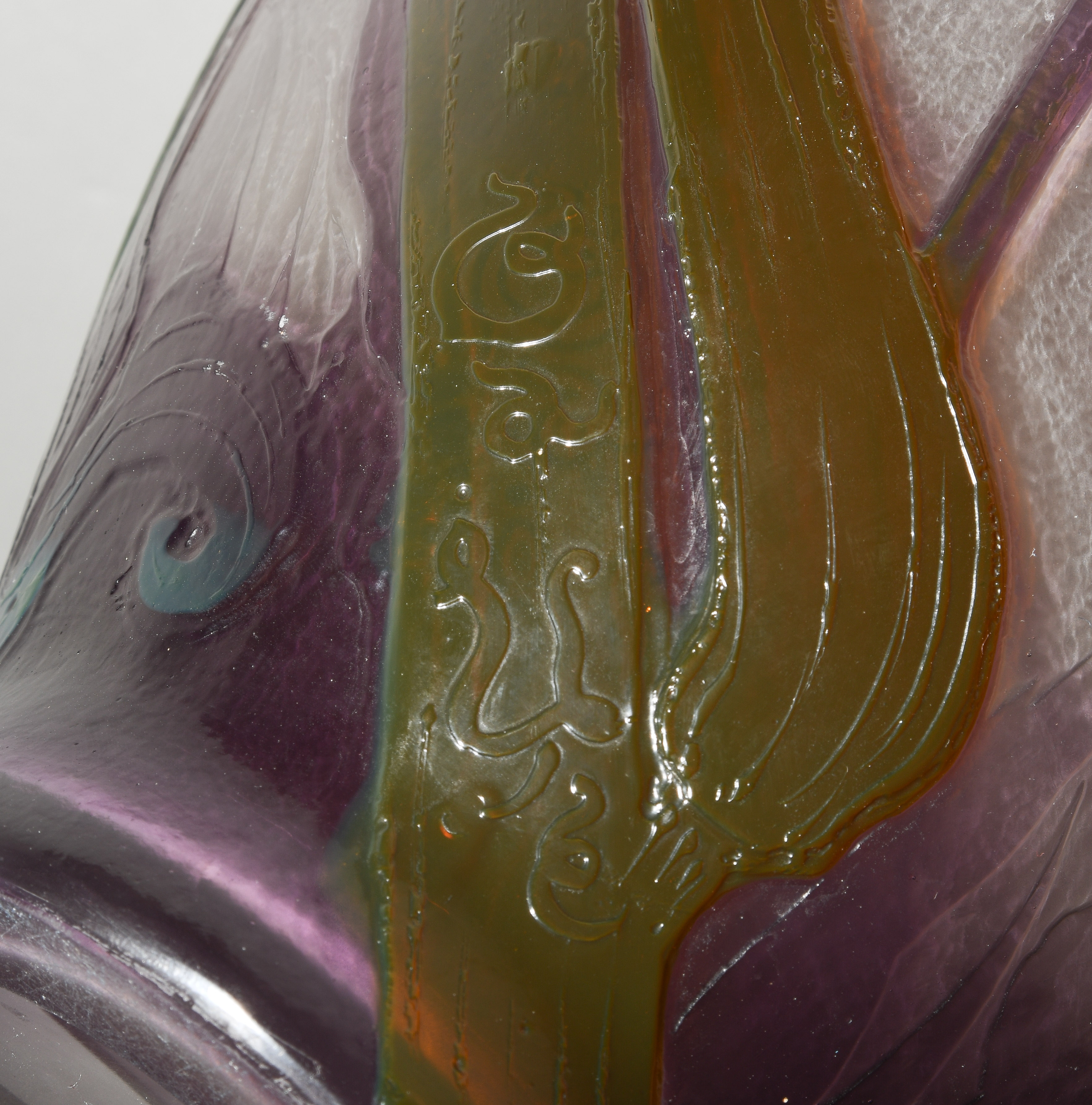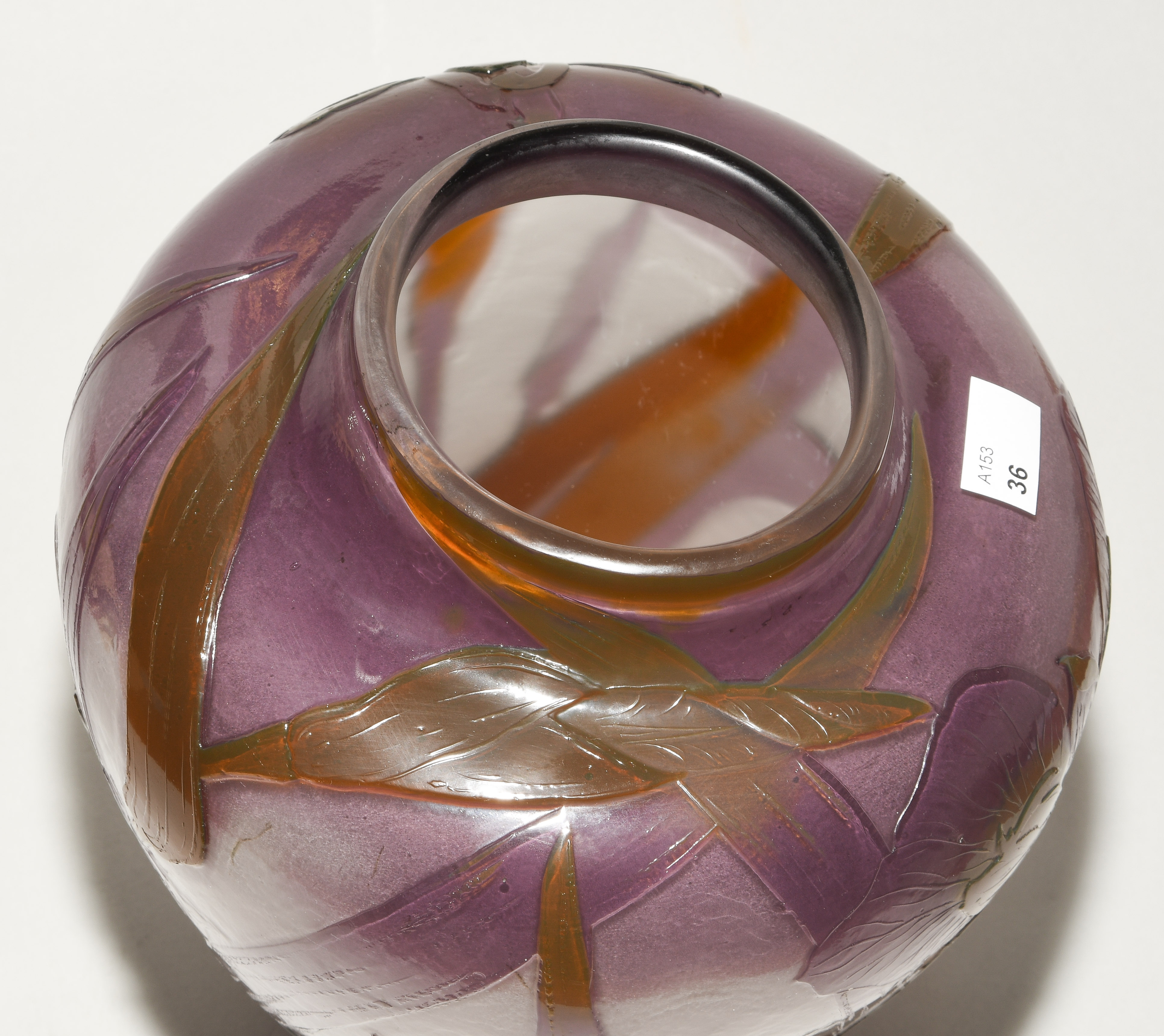 Nancy, um 1900. Vase. Farbloses Glas, innen milchigweiss, aussen violett und grün überfangen, umlaufend reliefiert geätzter Dekor mit Iris. Bezeichnet: Gallé (Reliefsignatur). H 25,5 cm.