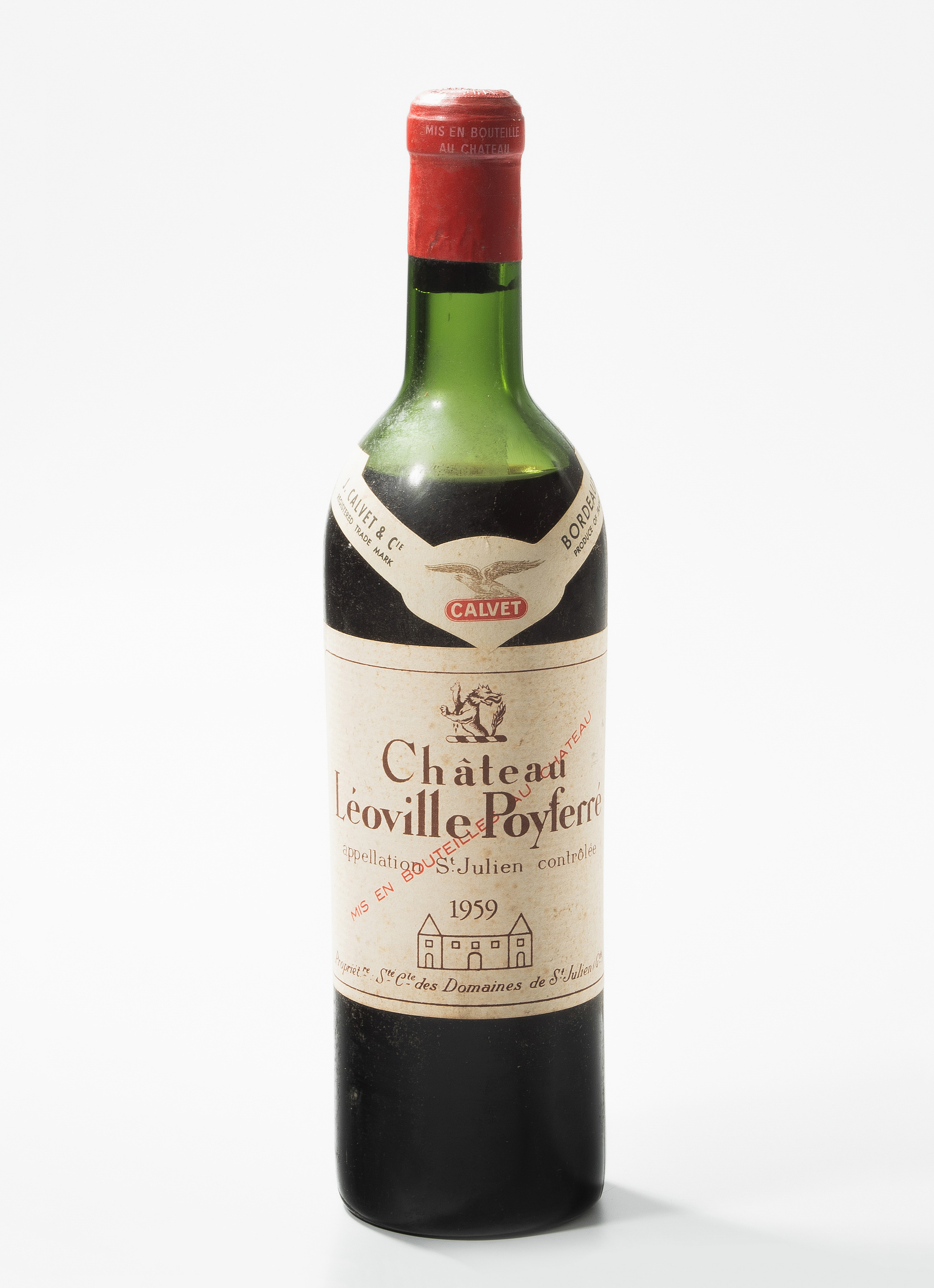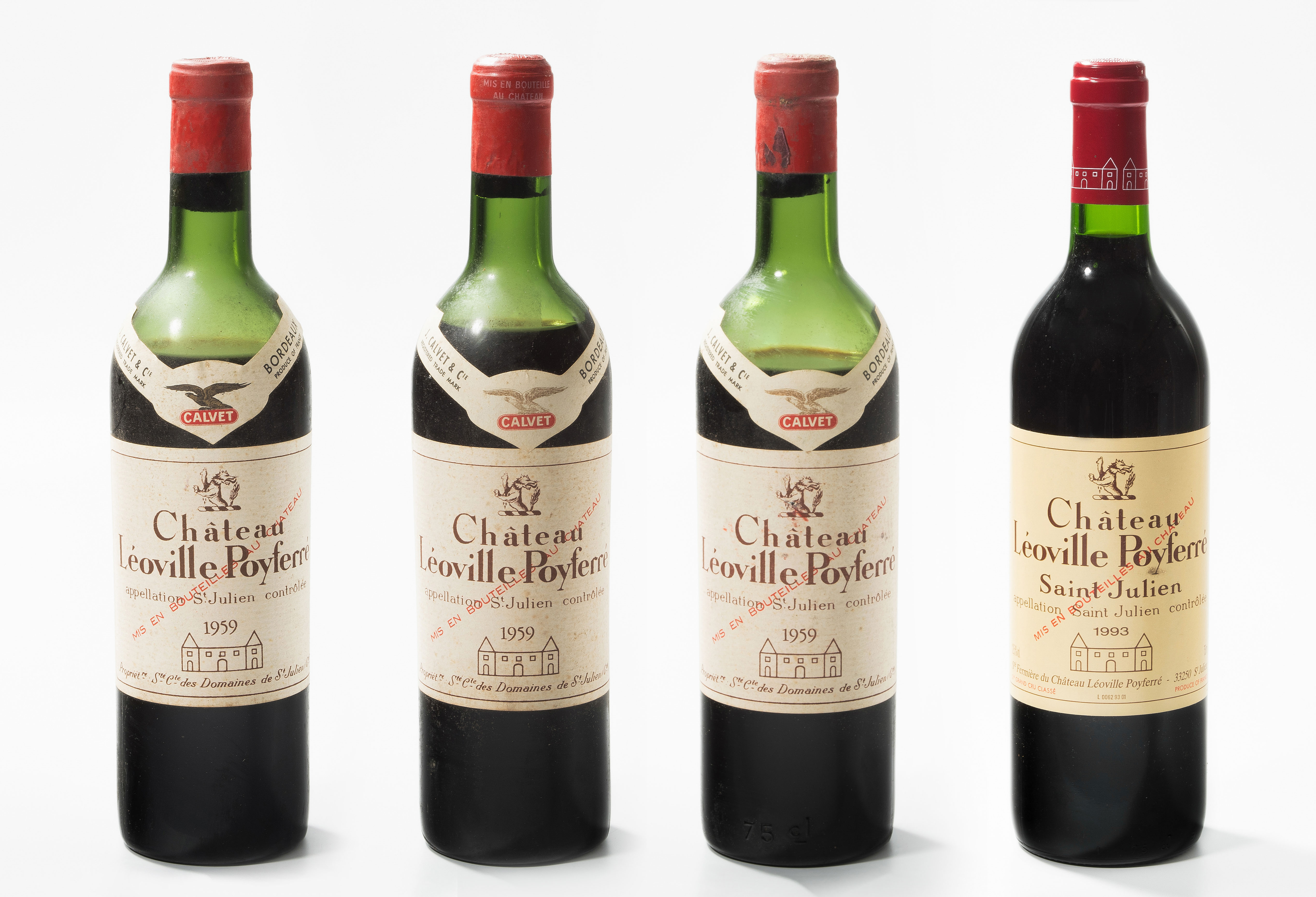 1959. 2eme Cru. St.Julien. 3 Fl. (Niveau: 1x Schultermitte, 2x unterer Teil der Schulter.) Chat. Léoville Poyferré, 1993,1 Fl. Zusammen 4 Flaschen.