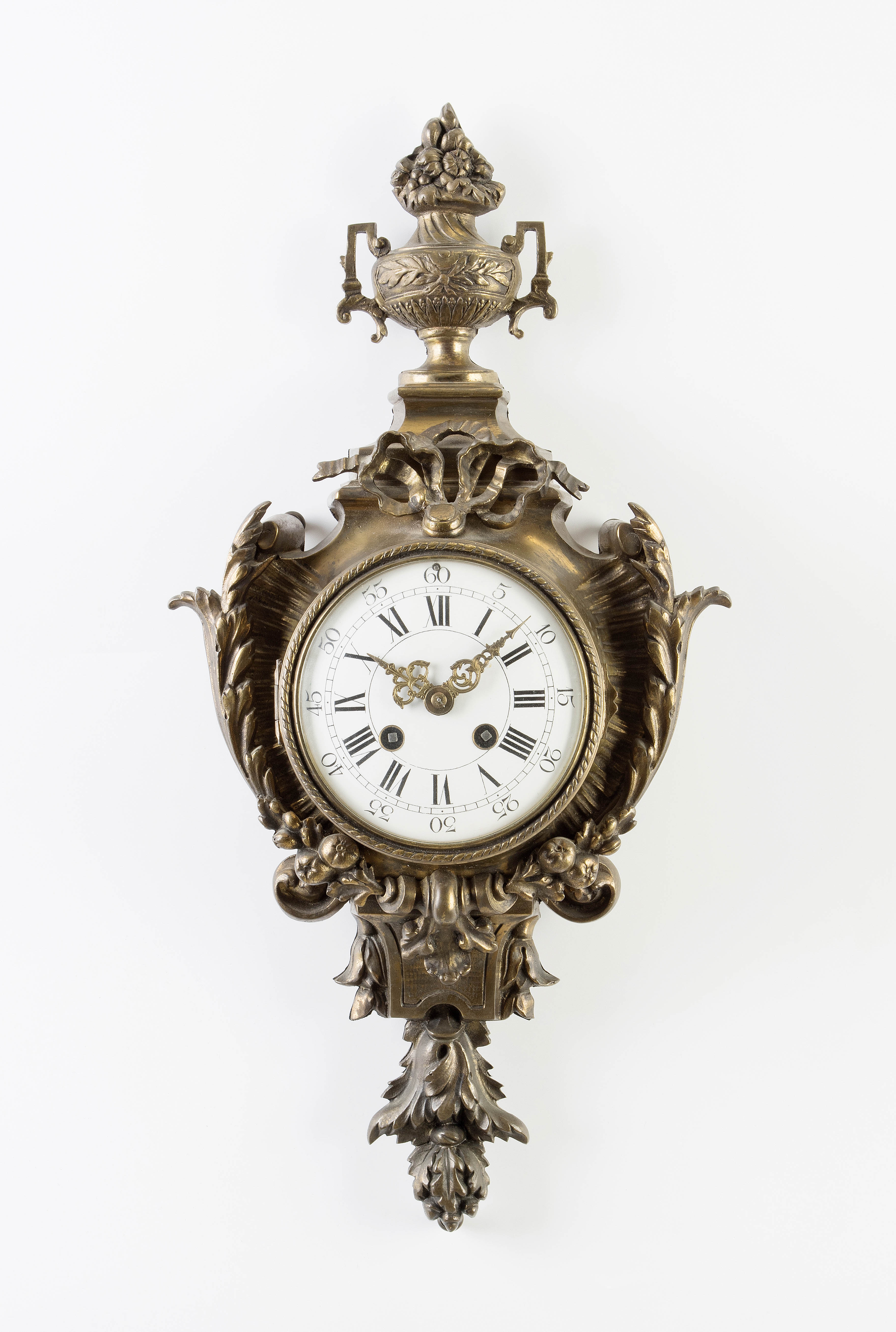 Frankreich, 19.Jh. Feuervergoldetes-, verziertes Bronzegehäuse. In Bronzering gefasstes Glasziffertürchen. Emailzifferblatt mit römischen Stunden- und arabischen Minutenzahlen. Ankerwerk mit Hinterpendel an Federaufhängung. Stunden- und Halbstundenschlag auf Glocke. Gehfähig. 49x25 cm. Schlüssel beigegeben.