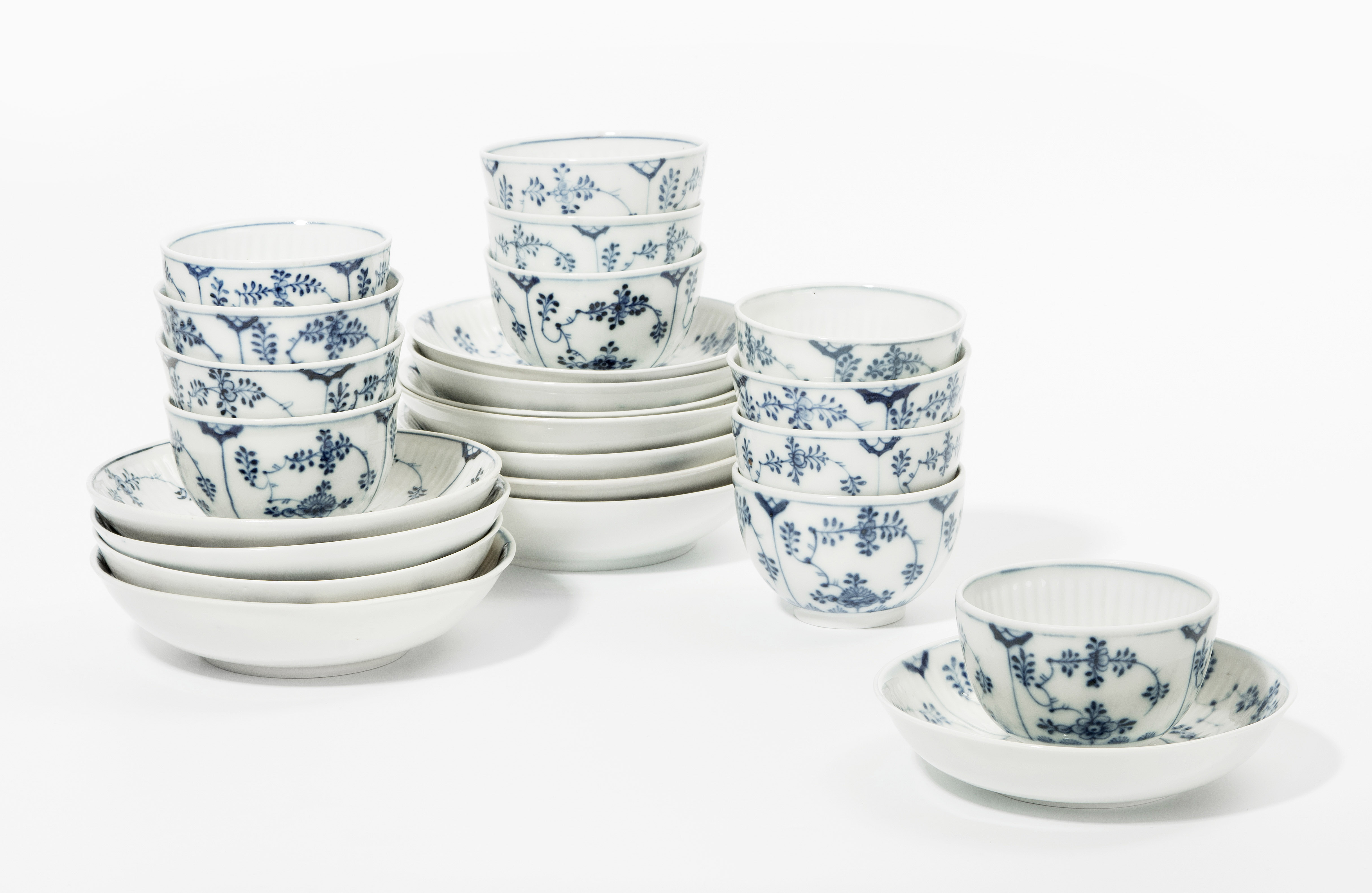 18.Jh. 12 Koppchen mit Untertellern. Porzellan, Rippenreihen, Blaublümchendekor in Unterglasurblau. Bezeichnet: Schwertermarke mit Beizeichen. H (Koppchen) ca. 5 cm.