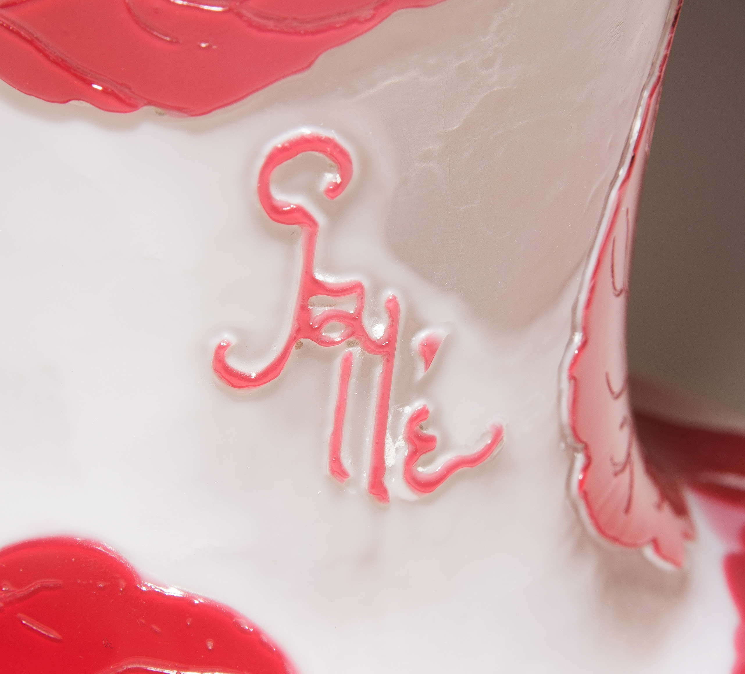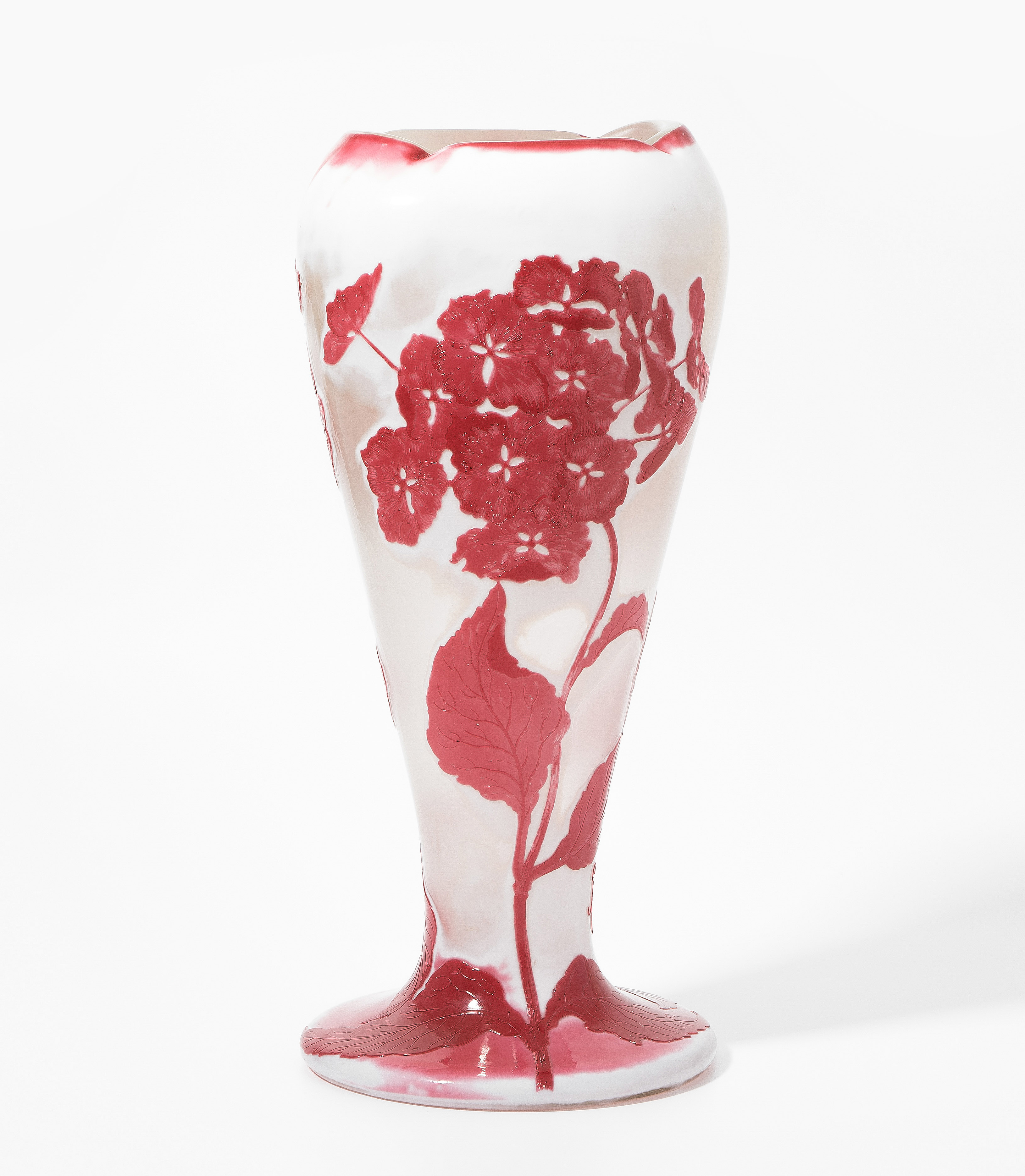 Nancy, um 1900. Vase. Farbloses Glas mit milchigweissen Pulvereinschmelzungen, aussen weiss und rot überfangen, umlaufend reliefiert geätzter Dekor mit Hortensien, feuerpoliert. Bezeichnet: Gallé (hochgeätzt). H 36,5 cm.