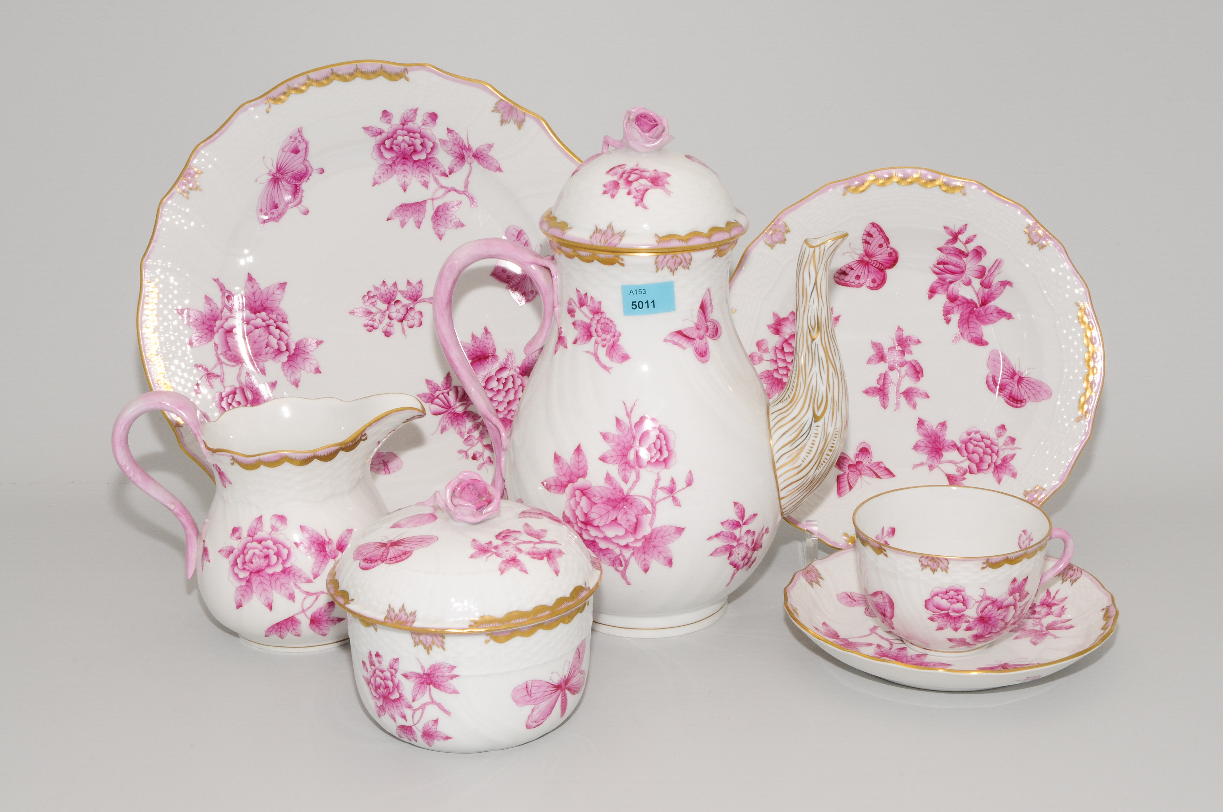 Herend, nach 1945. Porzellan, Rocaille, Dekor: Viktoria purpur (VBOP), Gold. Bestand: 12 Fleischteller (D 26,5 cm), 12 Dessertteller (D 21 cm), 12 (Suppen)Tassen mit U'tassen, 1 Kaffeekanne, 1 Cremier, 1 Zuckerdose, 12 Mokkatassen mit U'tassen, 1 Schälchen, 1 ovales Tablett. Total ca. 53 Teile.