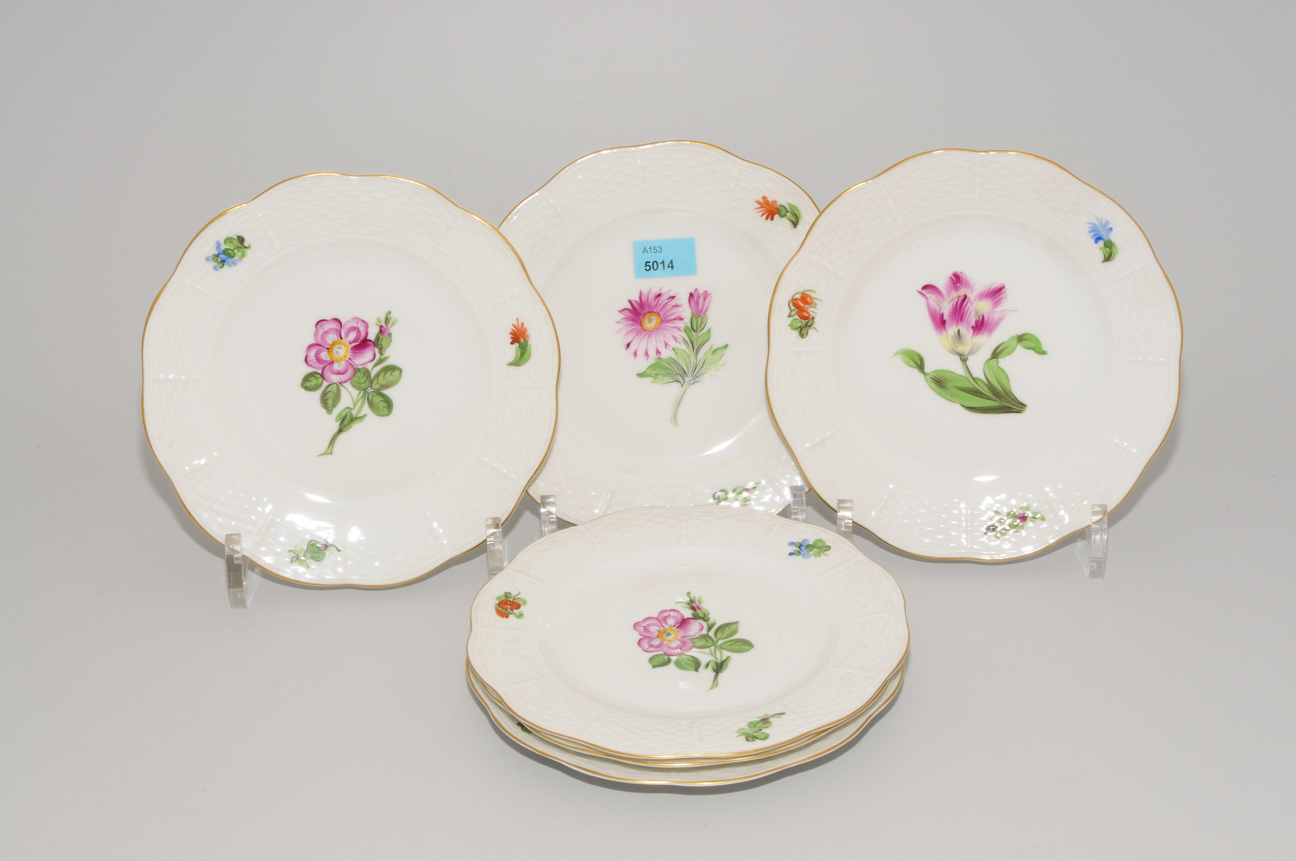 Herend, dat. 1946. Porzellan, Osier, im Spiegel bunt gemalte Einzelblume, Goldrand. D 16 cm.