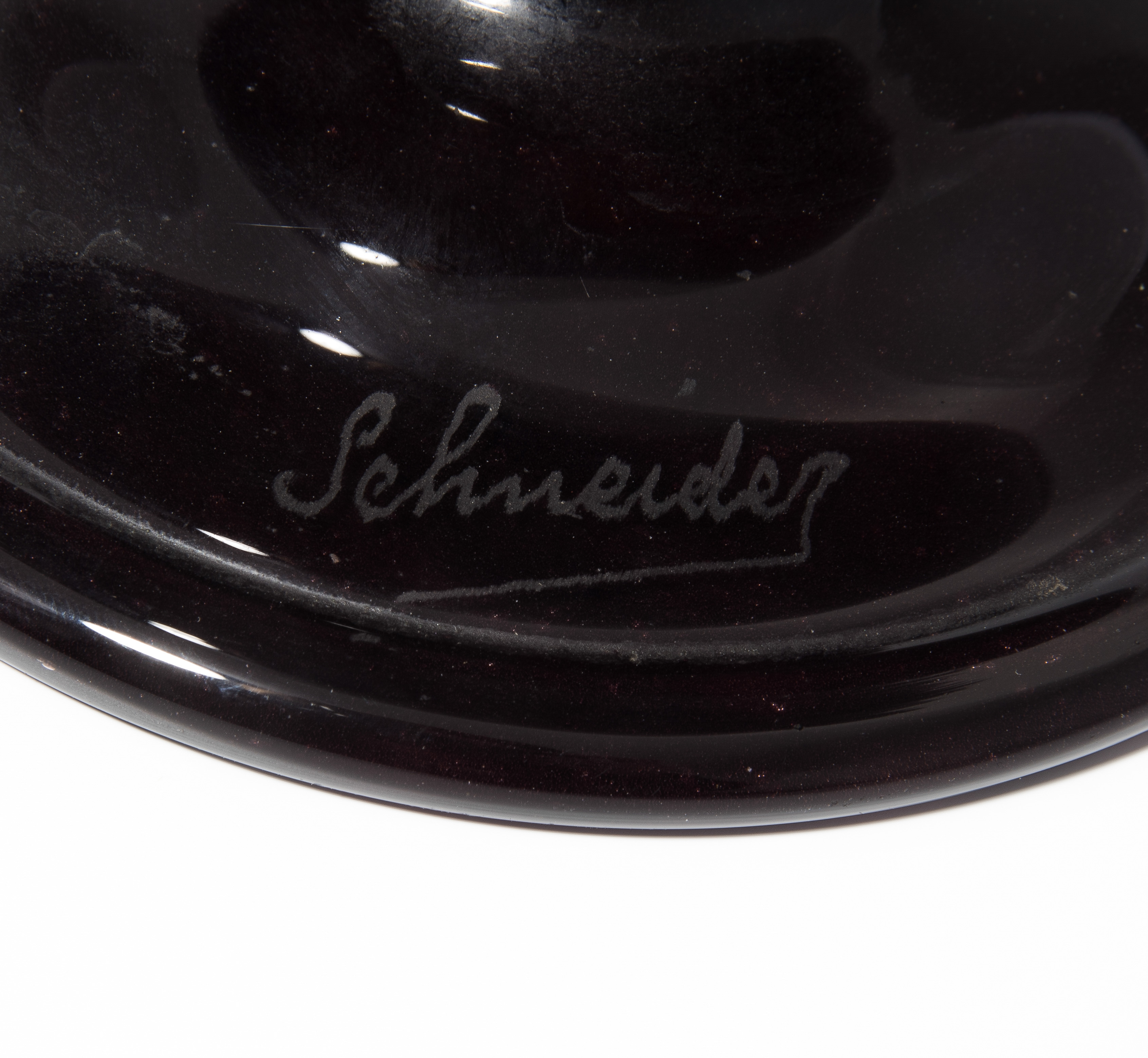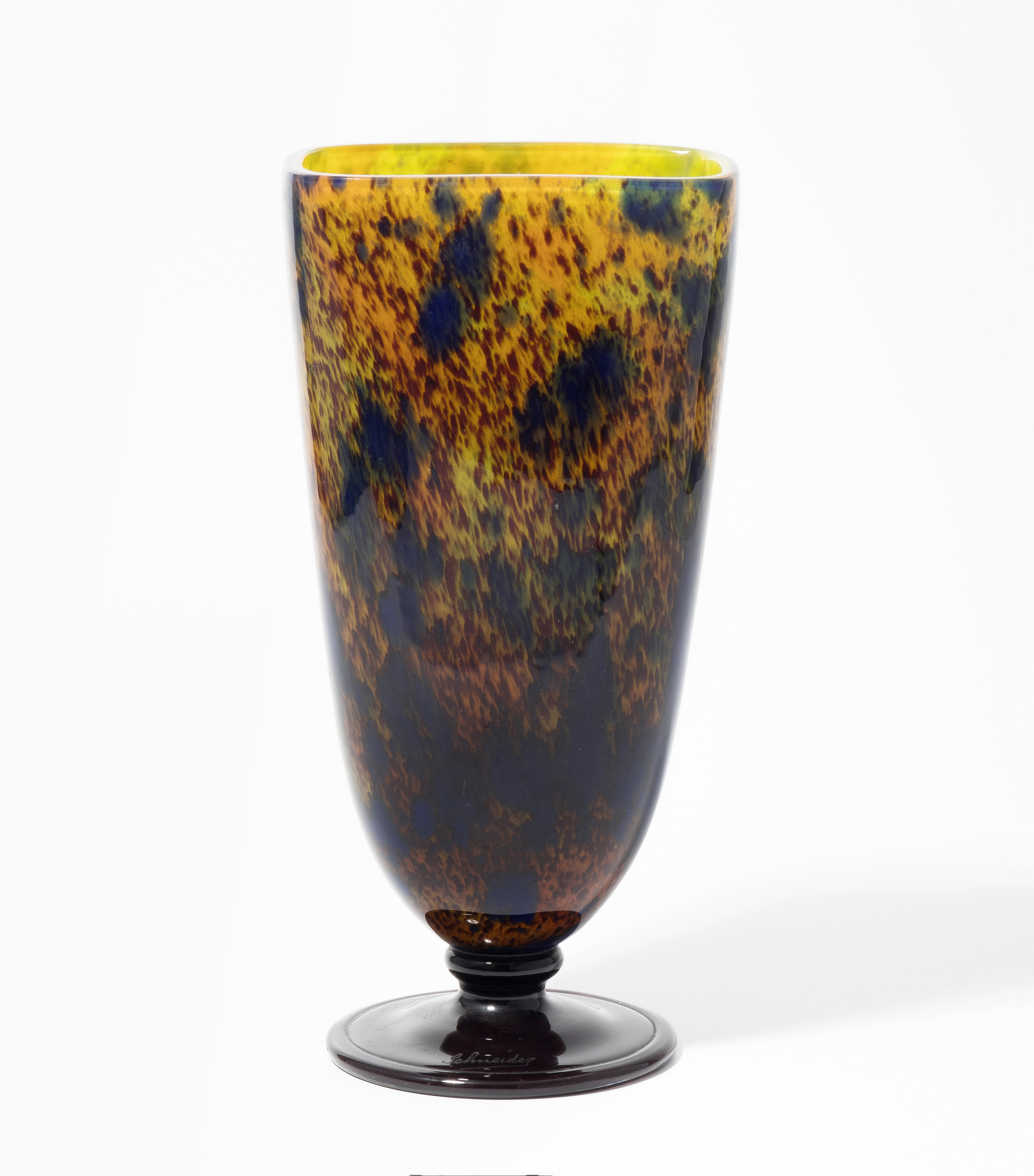 Epinay-sur-Seine, um 1930. Fussvase. Farbloses Glas mit gelben, orangen, violetten und blauen Farbpulvereinschmelzungen. Bezeichnet: Schneider (Nadelätzung). H 29 cm.