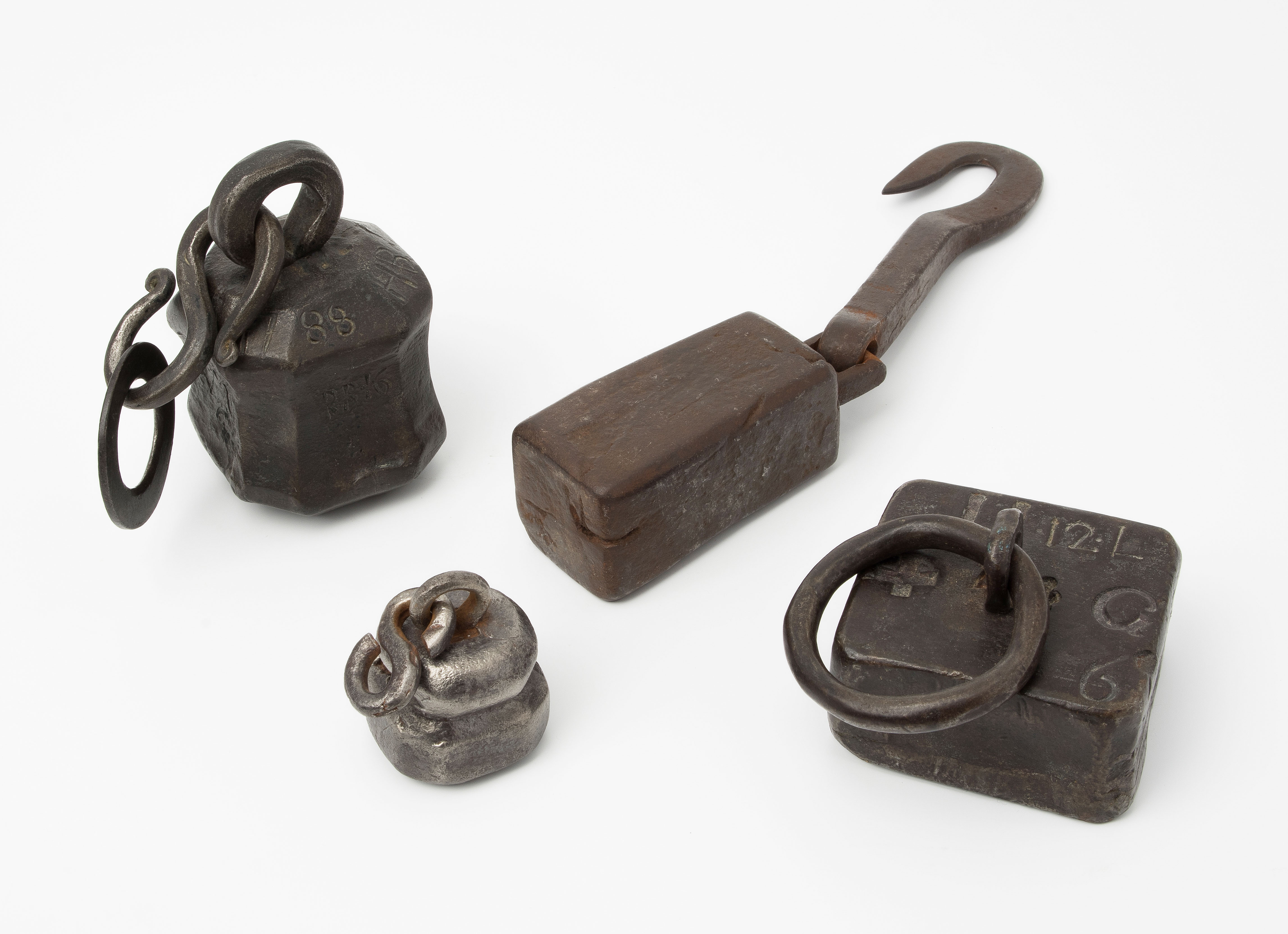 Schweiz, 18.Jh. Eisen. (1) Kanton Graubünden. Blockgewicht mit Ring. Gemarkt: "G", "II", "12L", 6 und Kreuz. Gewicht: 1183 g (2 Pfund). L 7 cm. (2) Kanton Bern. Laufgewicht mit S-Haken und Ring. Marken: "HB" (Johannes Brugger), "AMG", "RB.16", "81PI" sowie Jahreszahlen "1766" bzw. "1788". Gewicht: 1367 g. H 9,5 cm. (3) Laufgewicht. Ohne Marken. H 11 cm. (4) Kleines Gewicht mit S-Haken. Ohne Marken. H 5 cm.