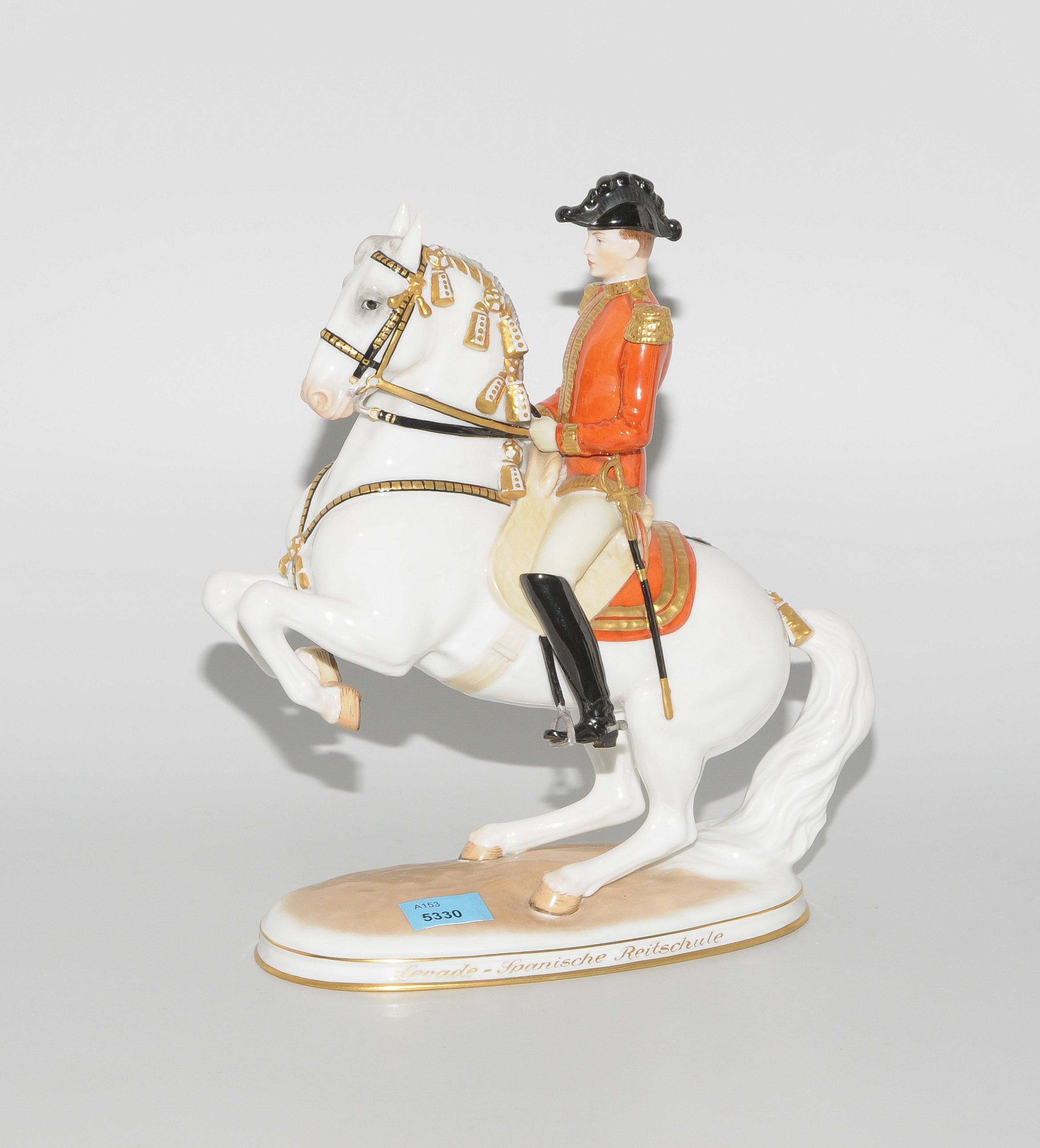Wien, Augarten 20.Jh. Modell von Prof. Albin Döbrich, 1925. Porzellan, polychrom bemalt und mit Goldstaffierungen. Levade mit Reiter. Spanische Reitschule. Hofburg. Modellnummer geprägt: 1591. Bezeichnet: Unterglasurblaue Bindenschild unter Krone. H 23 cm.