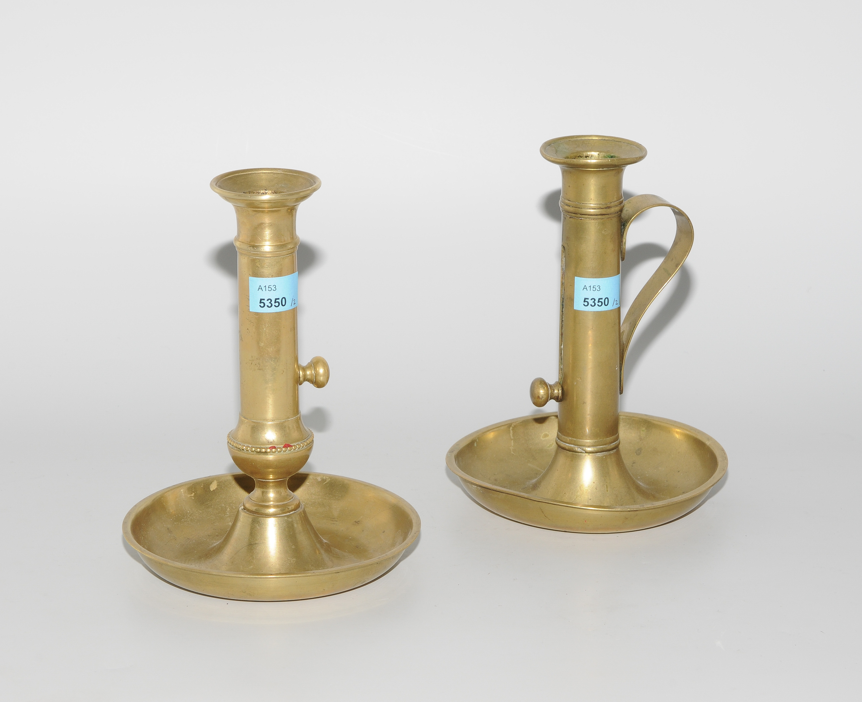 Biedermeier. Messing. Säulenschaft mit Schieber und Tropfrand über Rundfuss. 1 mit Handhabe. H 16,5 bzw. 17 cm.
