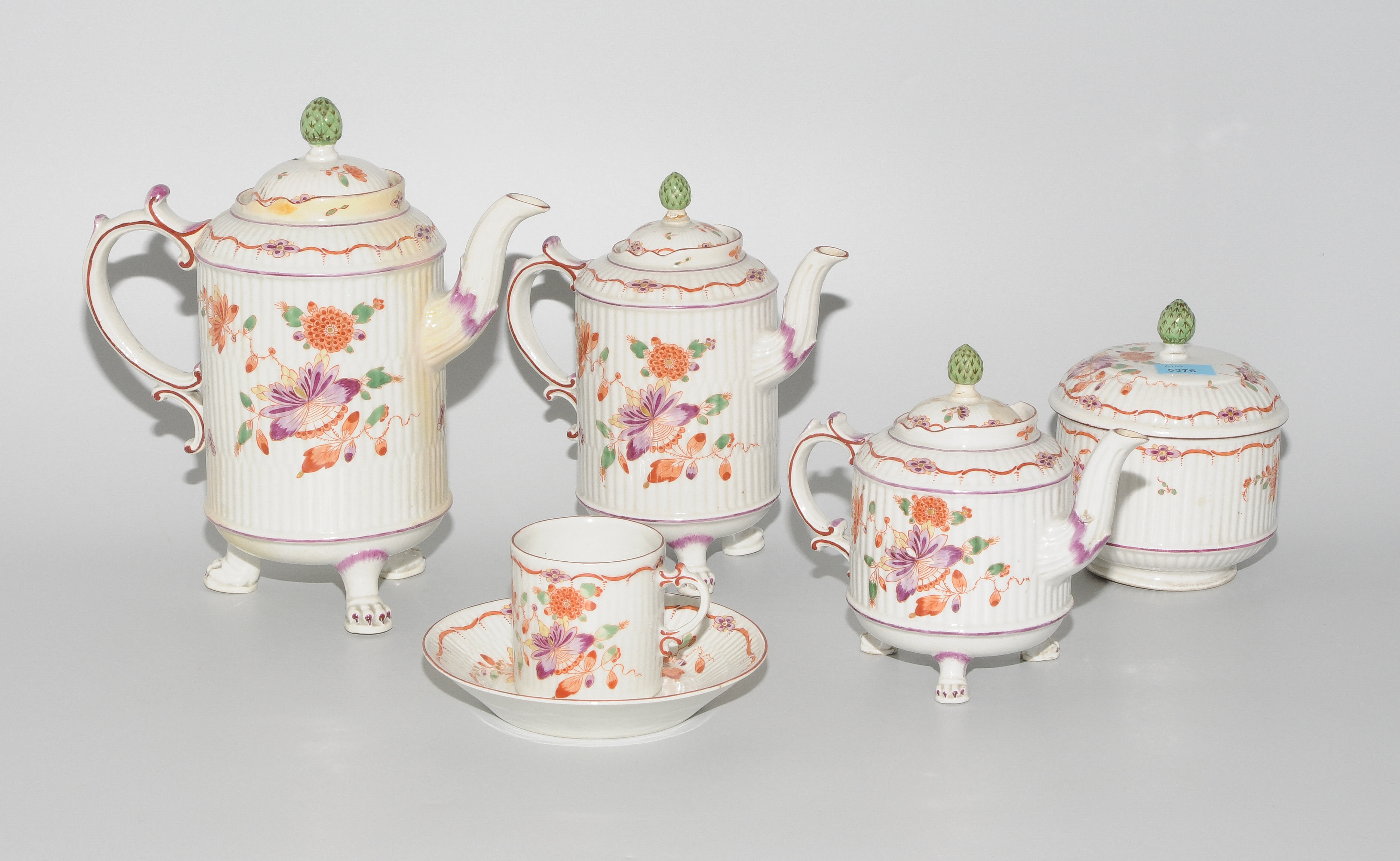 Ludwigsburg, um 1770. Porzellan, weiss glasiert. Dekor "Indianische Blumen" in polychromer Malerei über Reliefdekor. Konische Form. Bezeichnet: Unterglasurblaue Manufakturmarke. Bestand: 3 Kannen, 1 Zuckerdose, 11 Tassen mit Untertassen. H (Tasse) 6 cm.