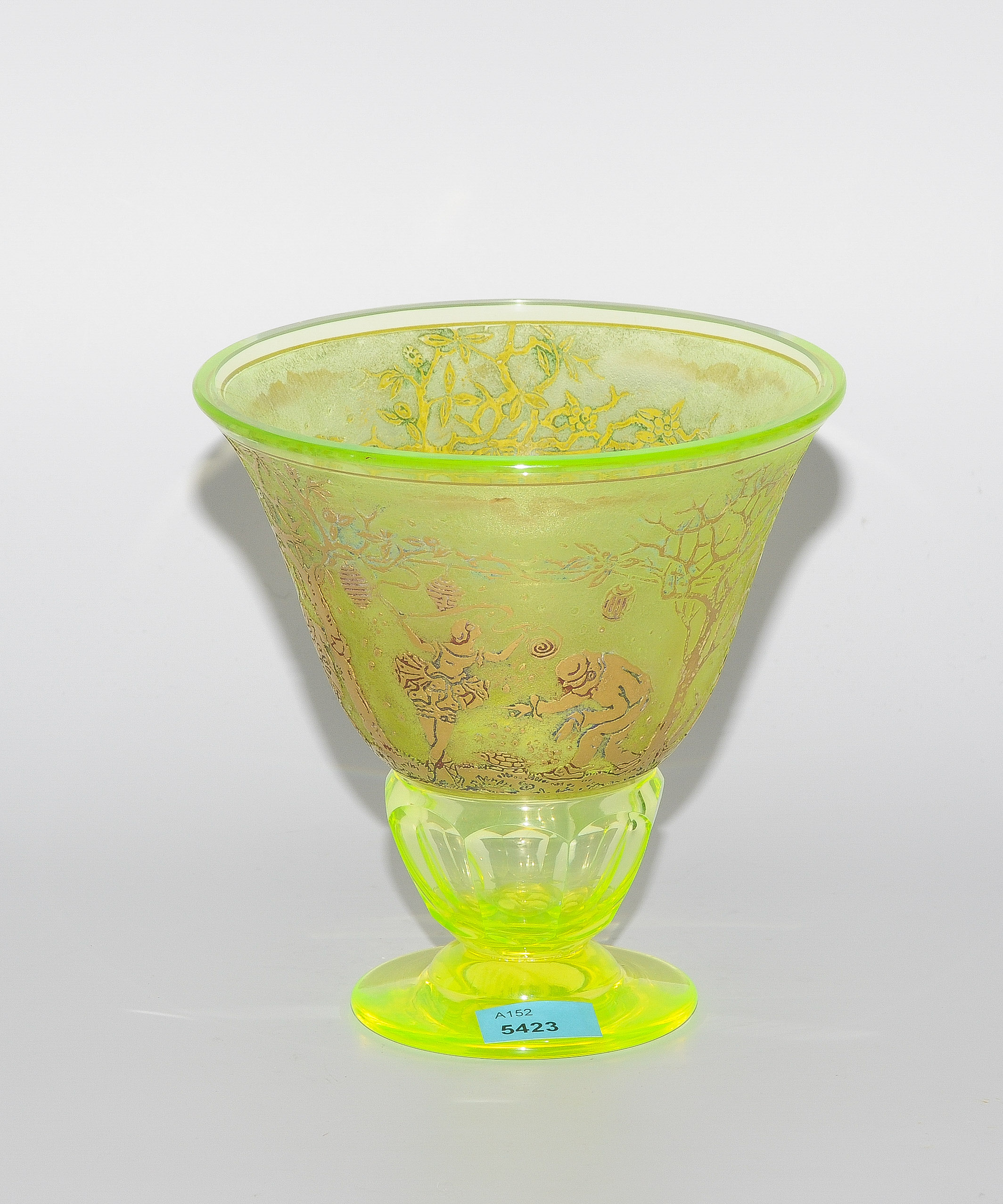 Moser Karlsbad, um 1935. Uranglas. Gold geätzter Figurenfries. Konischer, geschliffener Gefässkörper. Bezeichnet: Firmensignet (geätzt). H 14 cm.