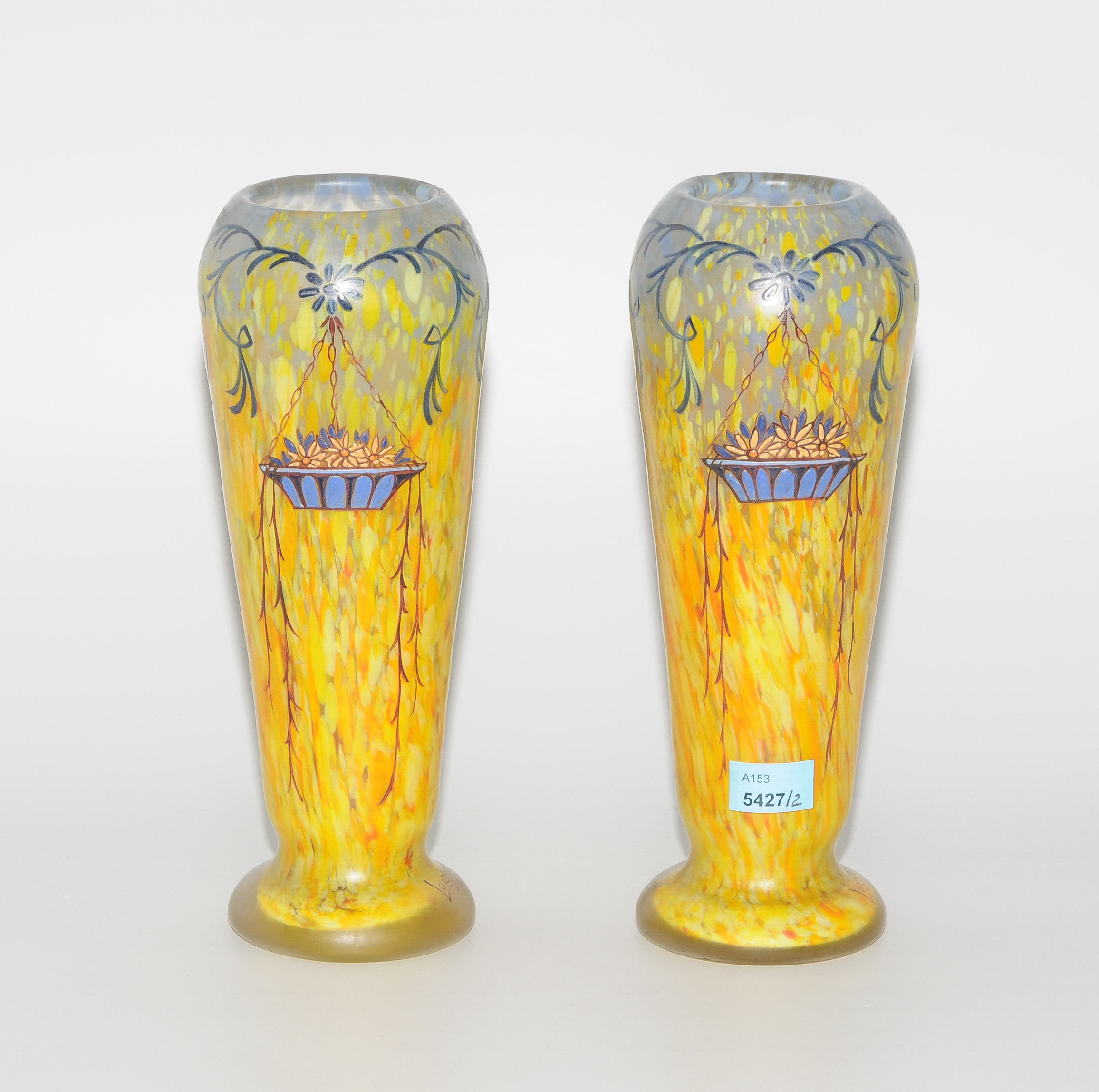 Legras, Saint Denis, Paris, um 1900. Farbloses, gelb-oranges, tlw. blau marmoriertes Glas. An der Wandung Blumenkorb in polychromer Emailmalerei. Balusterförmiger Gefässkörper. Bezeichnet: Legras (in Braun). H 21,5 cm.