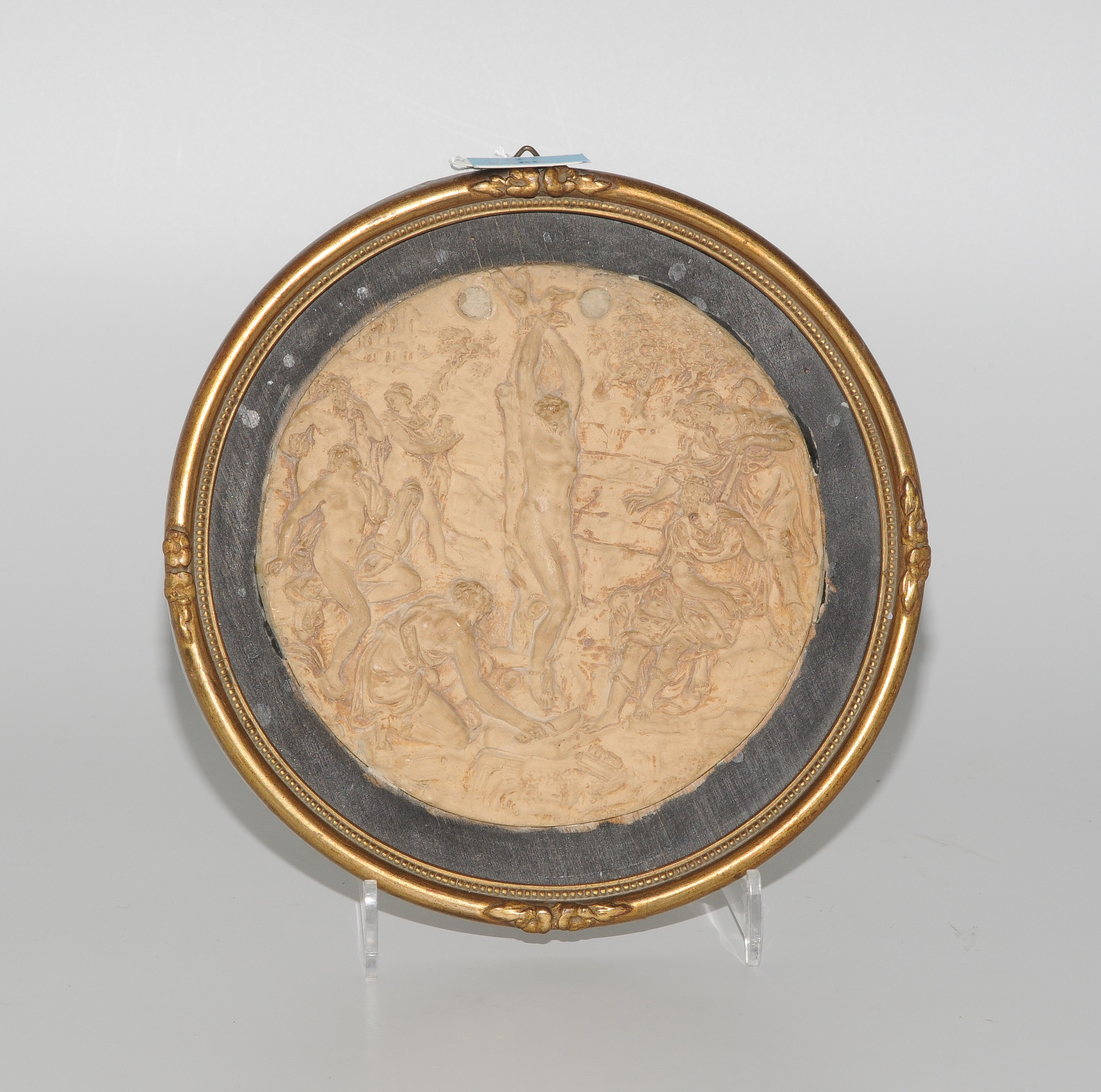 19.Jh. Terracotta. Rund. Darstellung: Die Häutung des Marsyas. Gerahmt. D 16,5 cm.