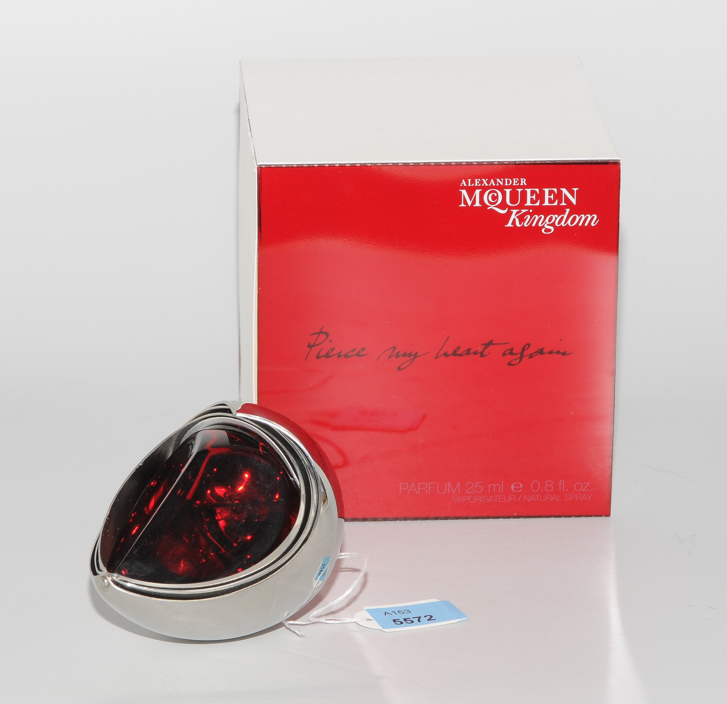 Alexander McQueen, ca. 2003. "Kingdom Perfume". Rotes Glas/Metall. Tropfenförmiger Gefässkörper. Mit Originalverpackung. H 7,5 cm.