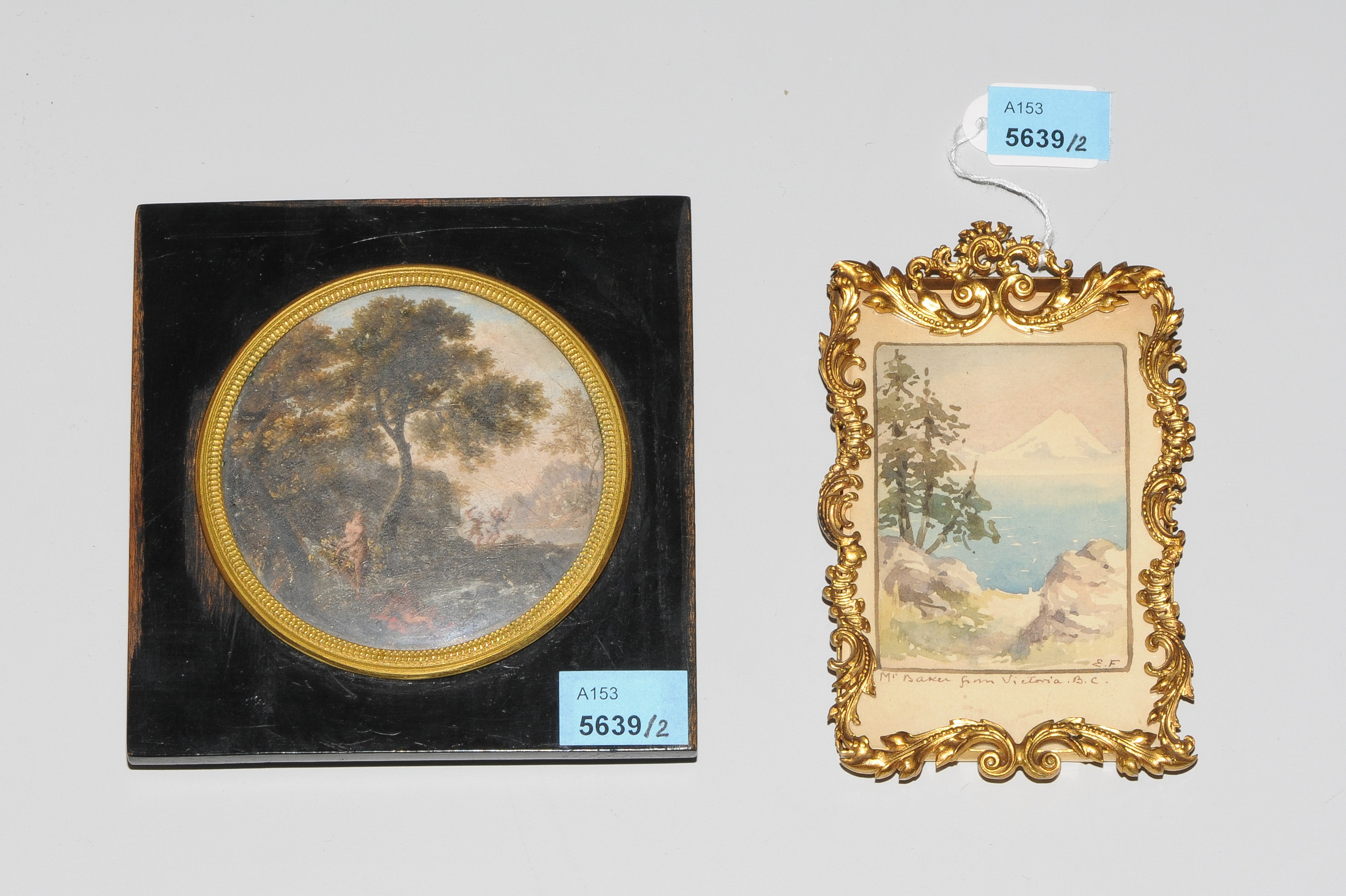 19. und 20.Jh. Gouachemalerei, bzw. Aquarell/Papier. Gouachemalerei: Allegorische Szene darstellend, rund. Aquarell: Seelandschaft mit Bergkette im Hintergrund, rechteckig. Beide gerahmt. 11,5x11,5 und 7x12 cm.