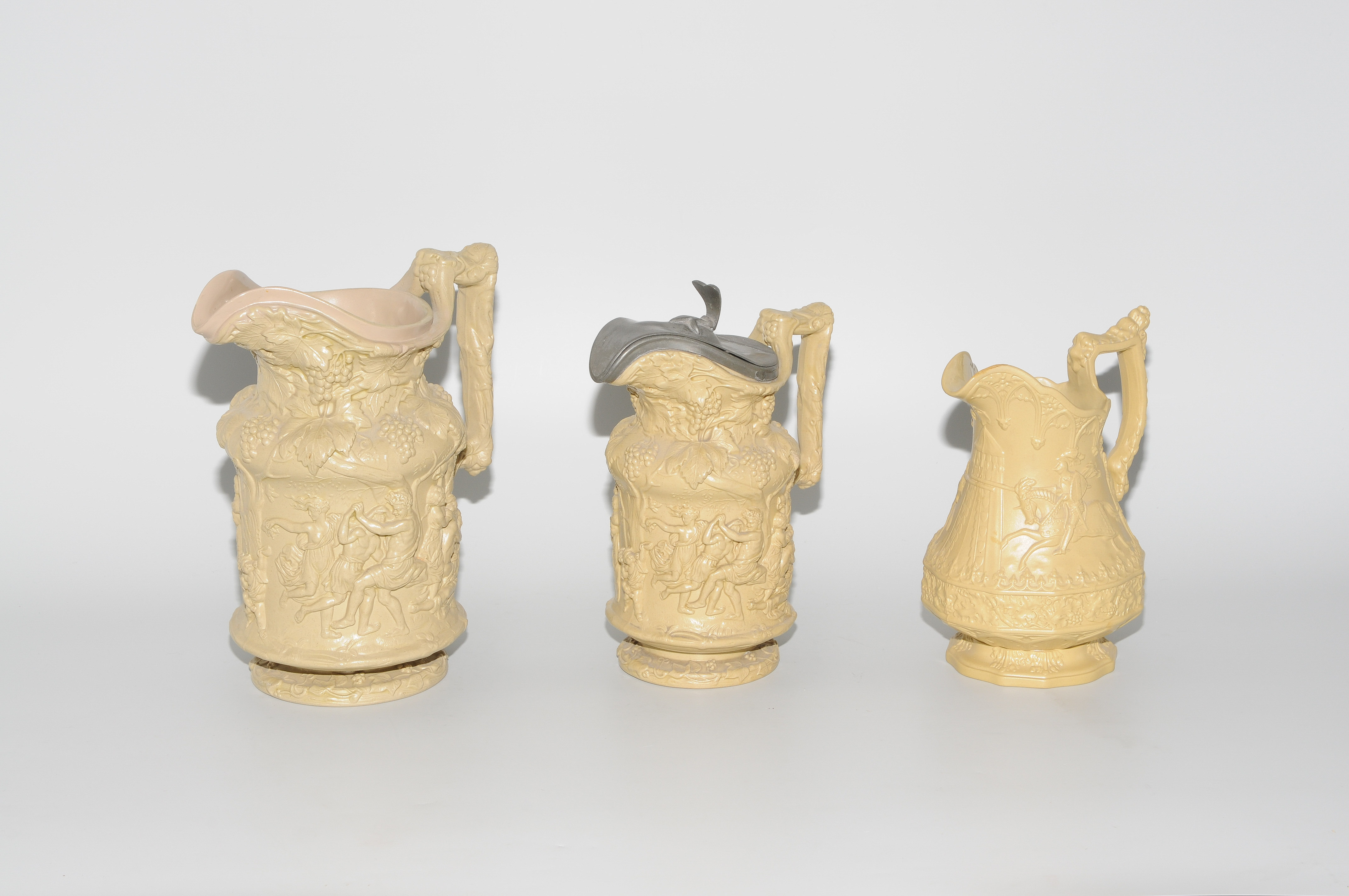 England, 19.Jh. Keramik, braun glasiert. (1) Ritterkampfszene im Relief. Bauchiger Gefässkörper. Bezeichnet: Manufakturmarke. H 18,5 cm. (2) Bacchusmotive im Relief. Bauchiger Gefässkörper. Bezeichnet: Manufakturmarke. H 23 cm. (3) Antike Szenen mit Weinlaubfries im Relief. Scharnierdeckel mit Zinnmontur. H 21 cm.