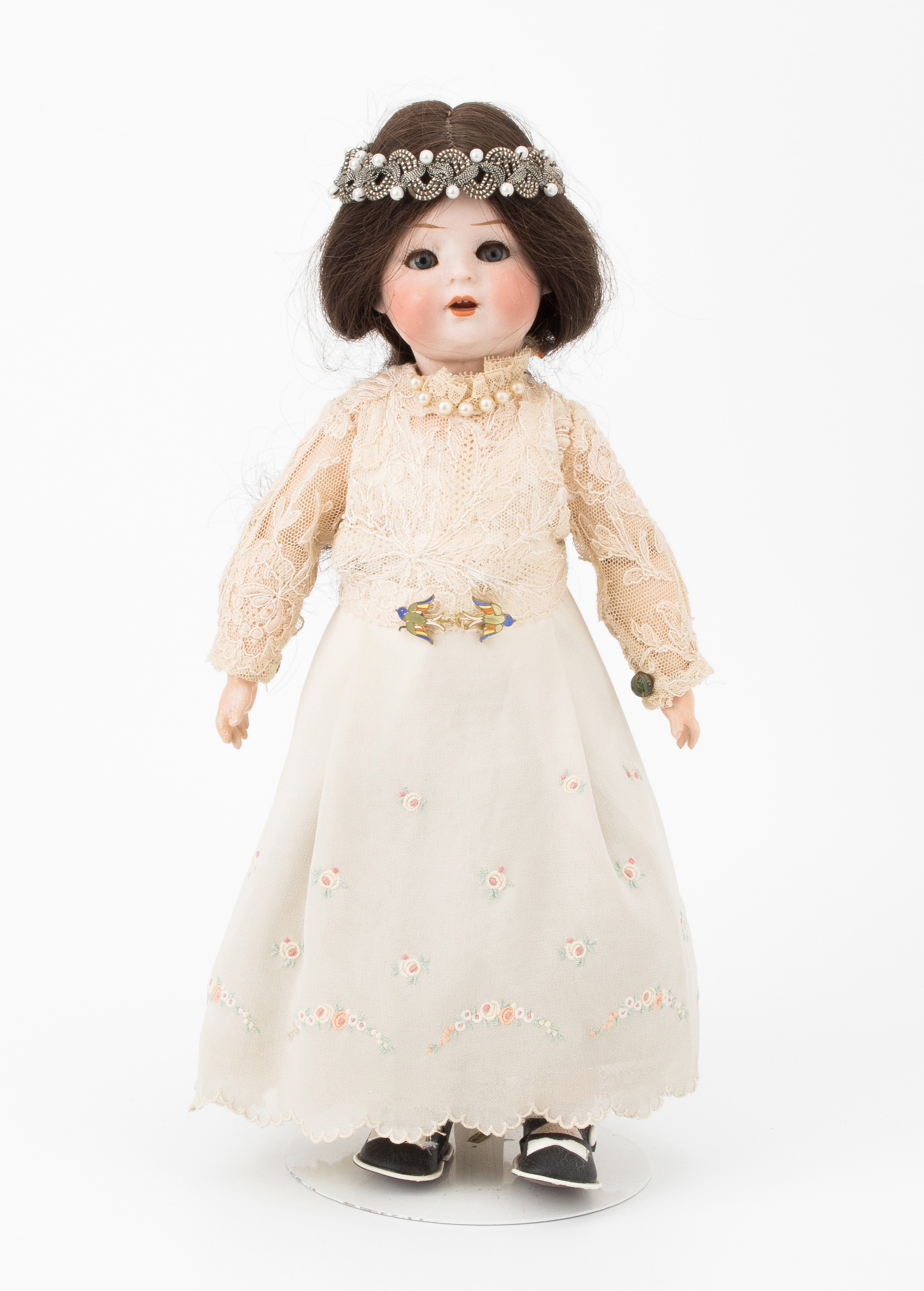 Deutschland, um 1915. Kurbelkopf mit festen blauen Augen und offenem Mund aus Biscuit-Porzellan. Halsmarke: "678, 3/0, BP (in Herz), Made in Germany". Gelenkkörper aus Masse. Dunkelbraune Echthaarperücke. Bekleidung im alten Stil. H 32 cm.