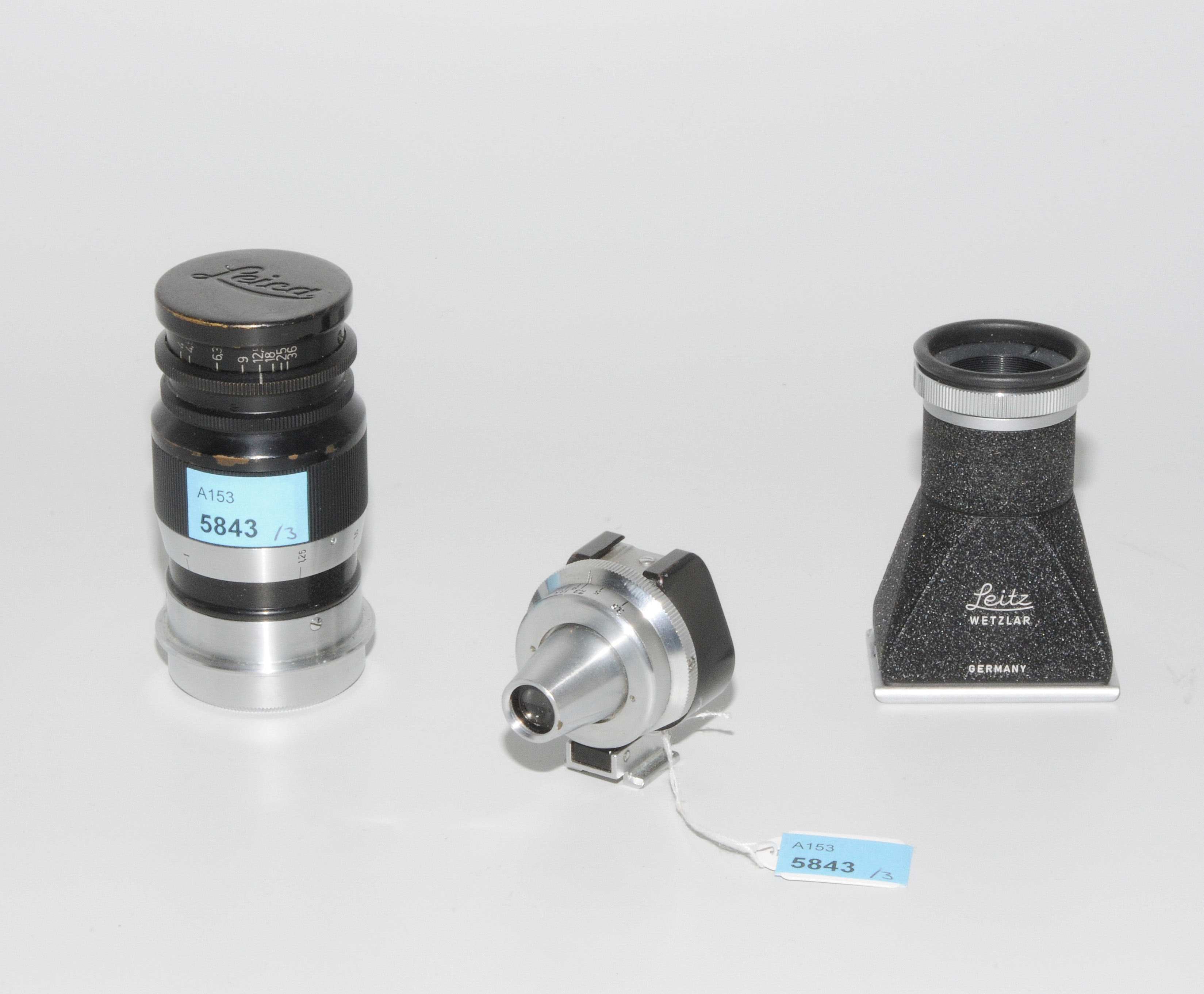 (1) Leica-Objektiv. 1939. Ernst Leitz Wetzlar, Elmar F=9 cm 1:4, Nr.517949. L 8,5 cm. (2) Leica-Aufstecksucher, 3,5–13,5 cm. Braunes Lederetui. L 5 cm. (3) Leica-Lupe. L 7cm.