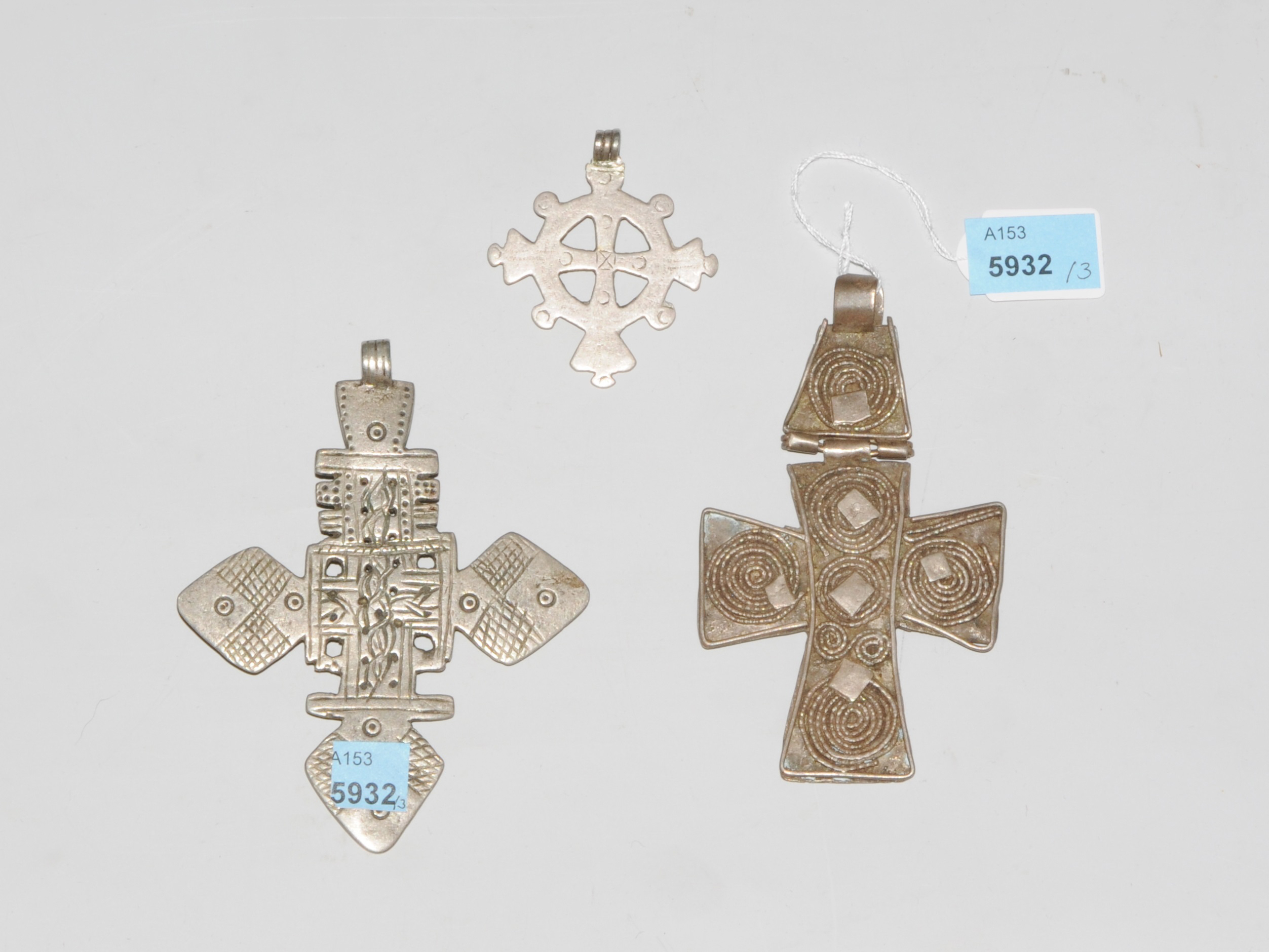 Äthiopien, 19.Jh. (1) Silber. Stilisiertes Tatzenkreuz. Auflagen aus Silberdraht in konzentrischen Kreisen. Scharnierter Aufsatz mit Öse. H 10 cm. (2) Versilbert. Stilisiertes Kleeblattkreuz. Durchbrochen gearbeitet und ornamental graviert. H 10 cm. (3) Silber. Rundkreuz. Durchbrochen gearbeitet und ornamental graviert. H 5 cm.