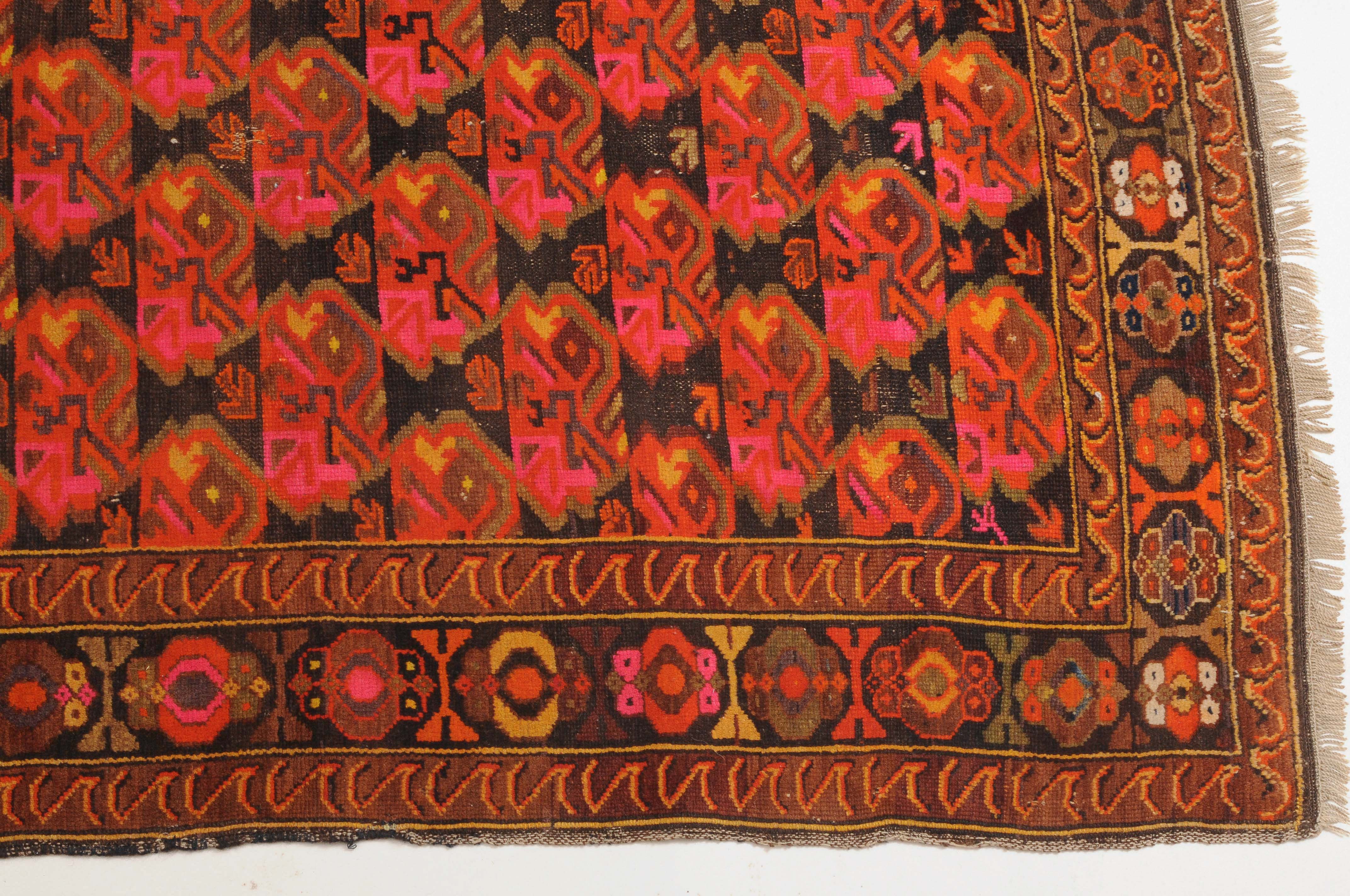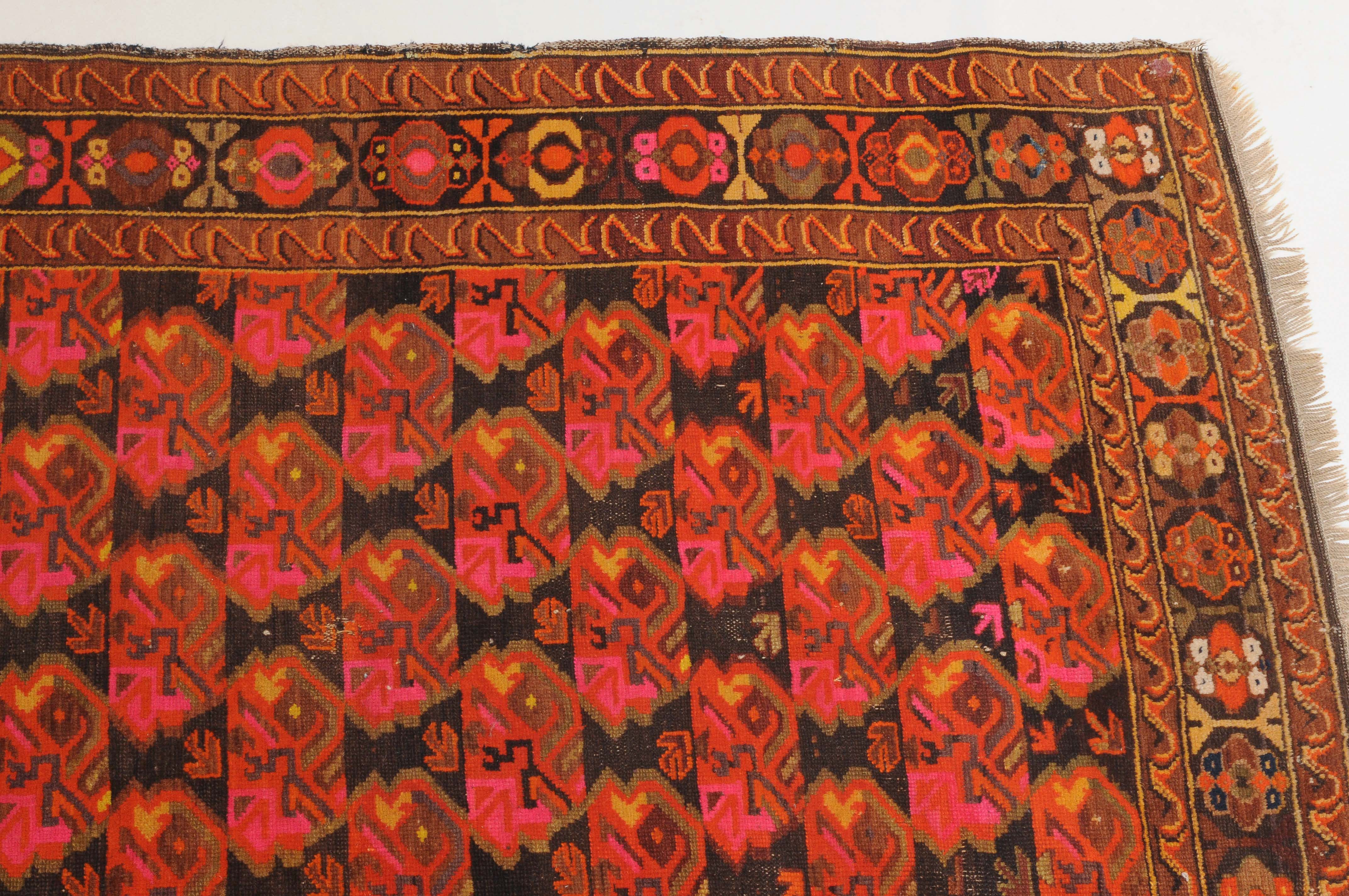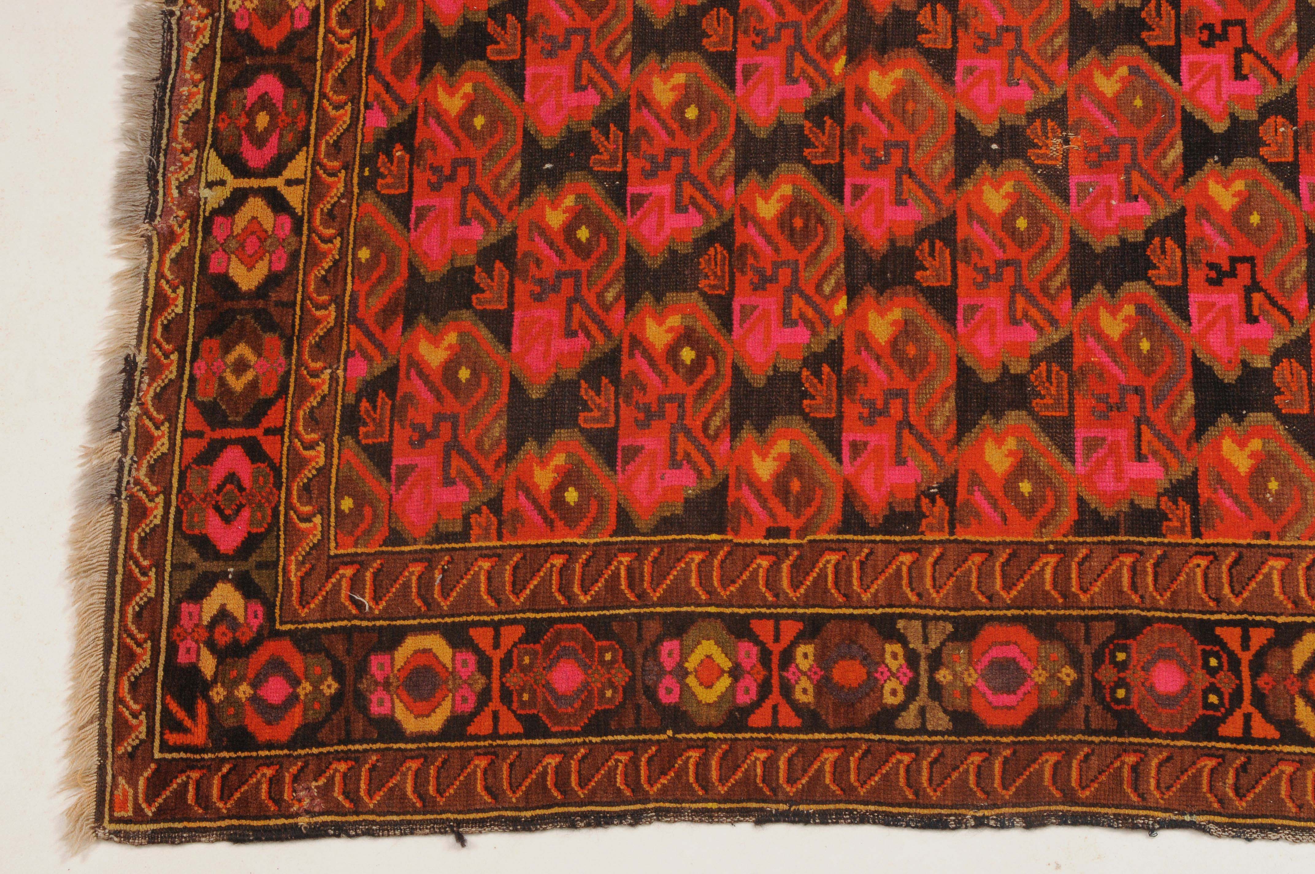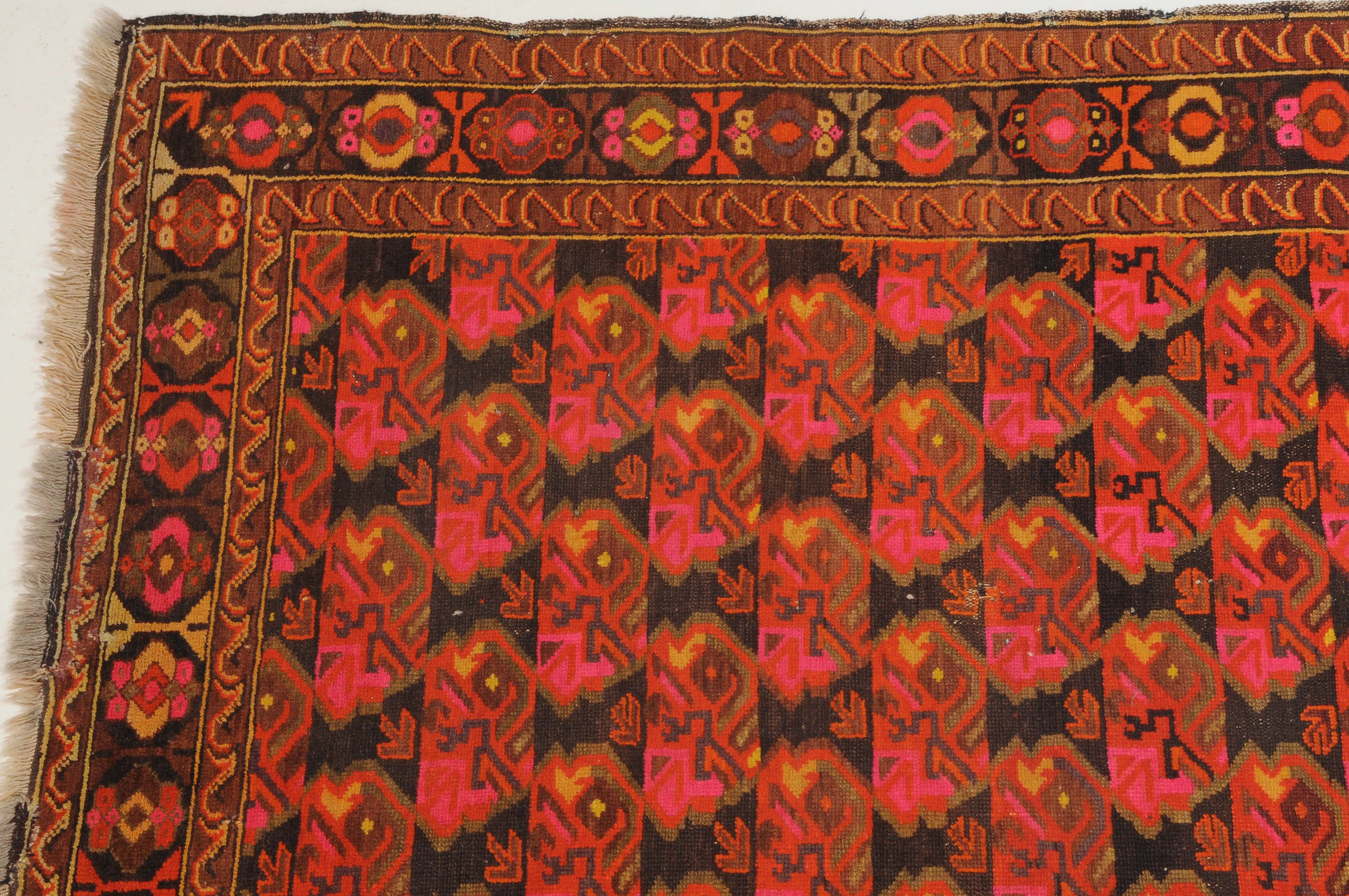 N-Kaukasus, um 1930. Im dunklen Mittelfeld sind horizontale Reihen mit Blütenmotiven wabenartig angelegt. 2 Wellenborten säumen die alternierende Blütenbordüre. Reparierte Stellen und Gebrauchsspuren. 116x160 cm (ft. 3.8x5.3).