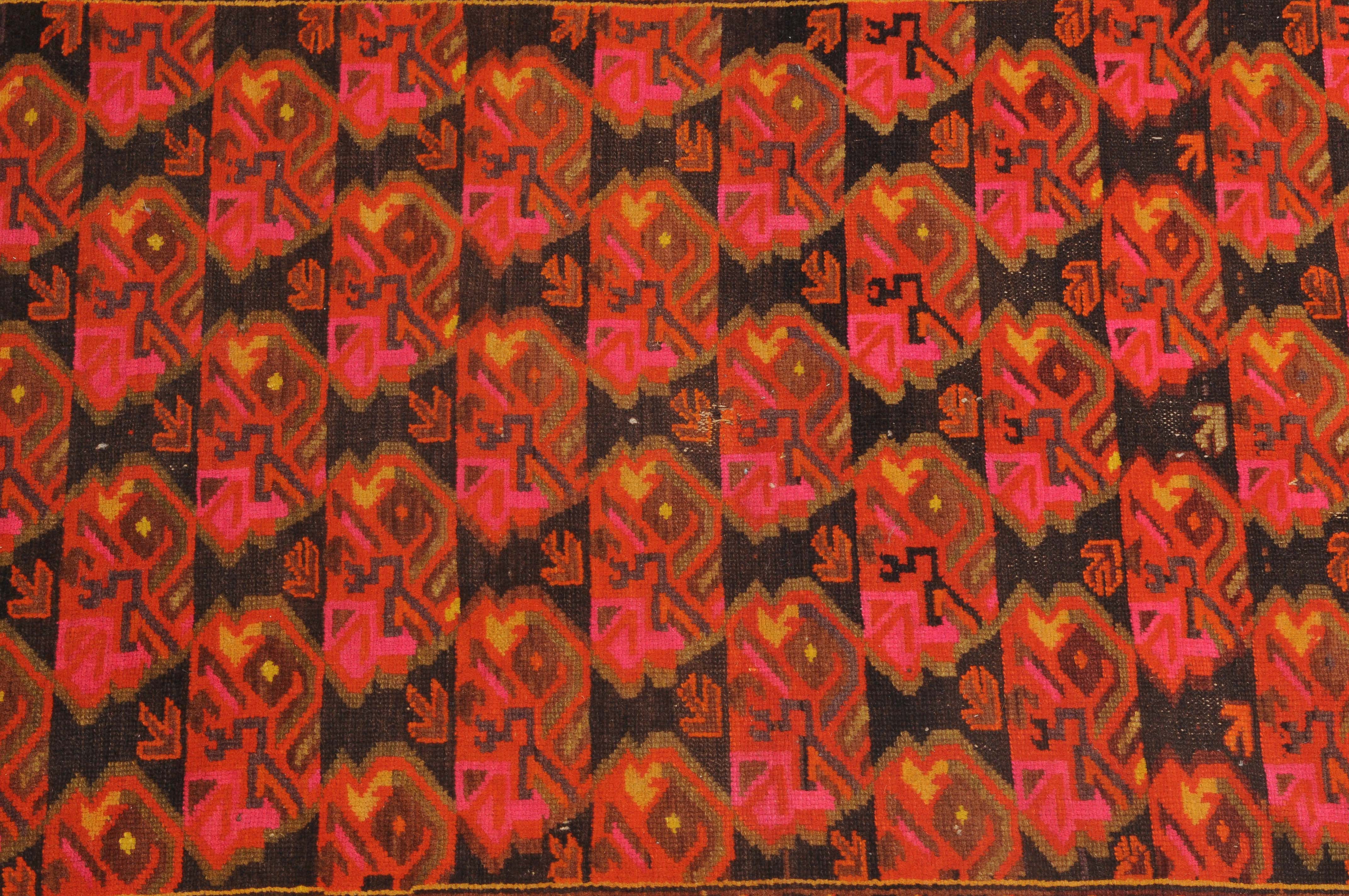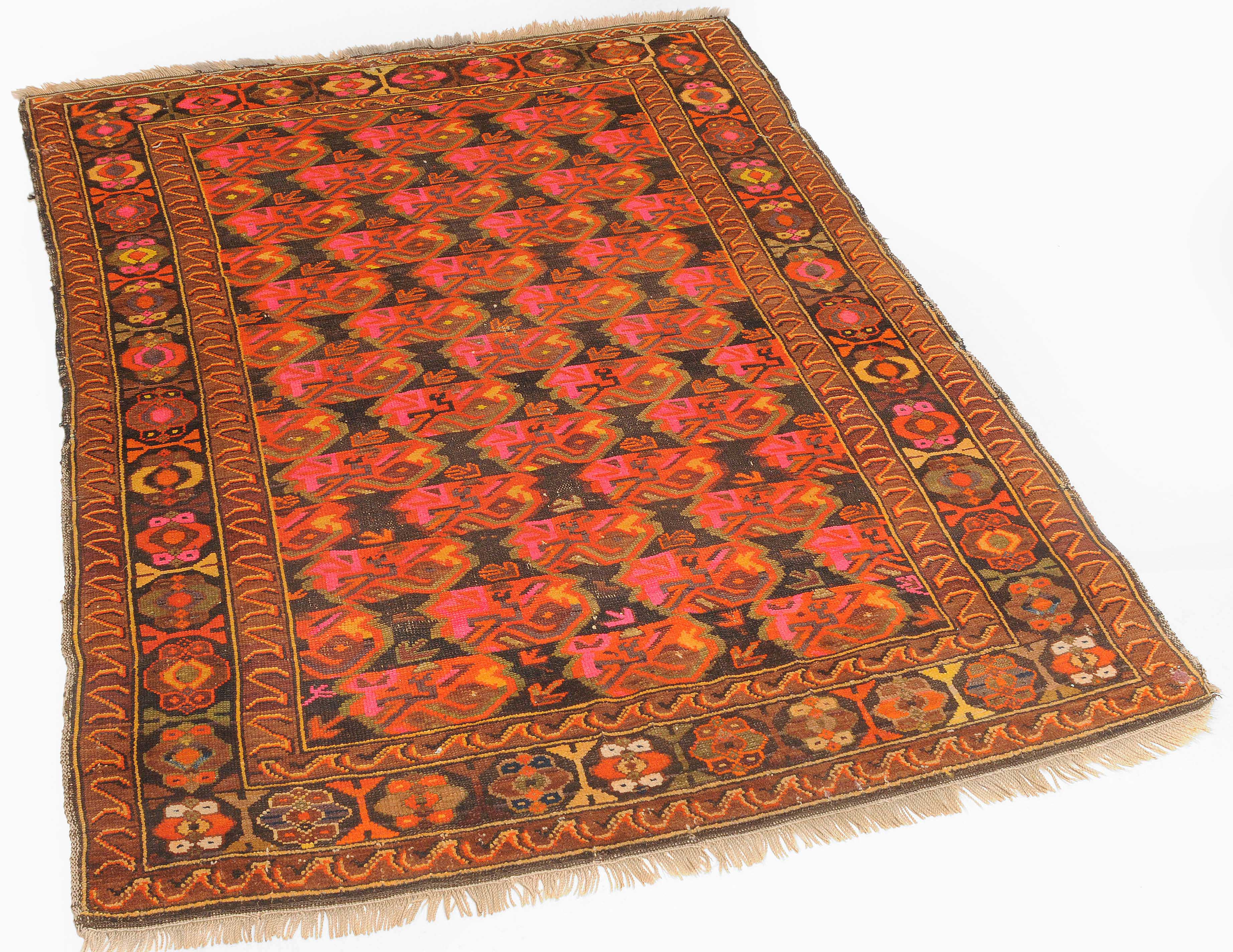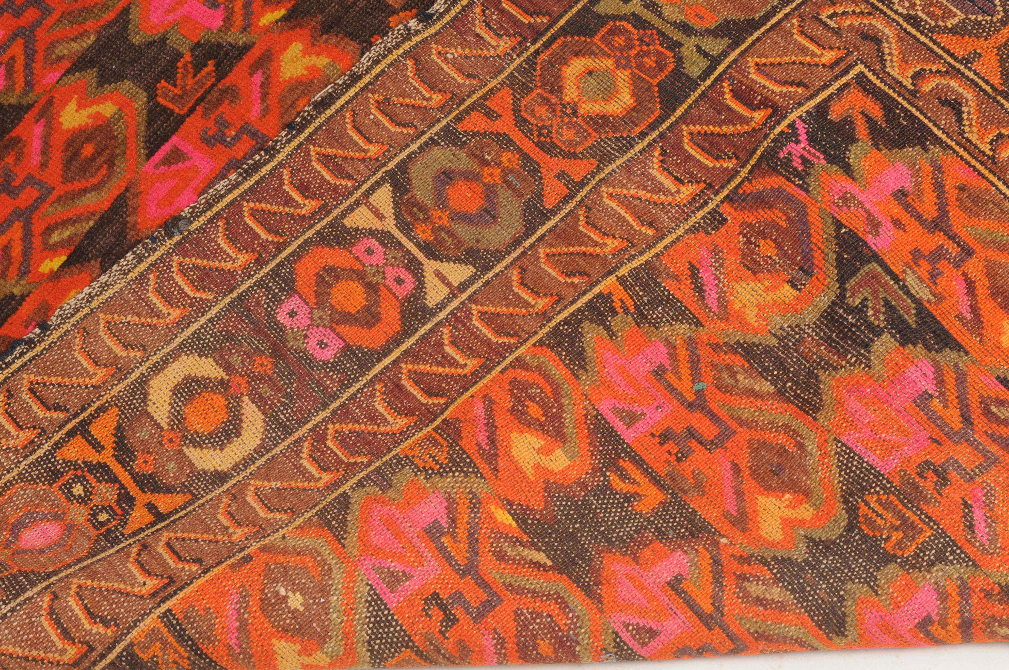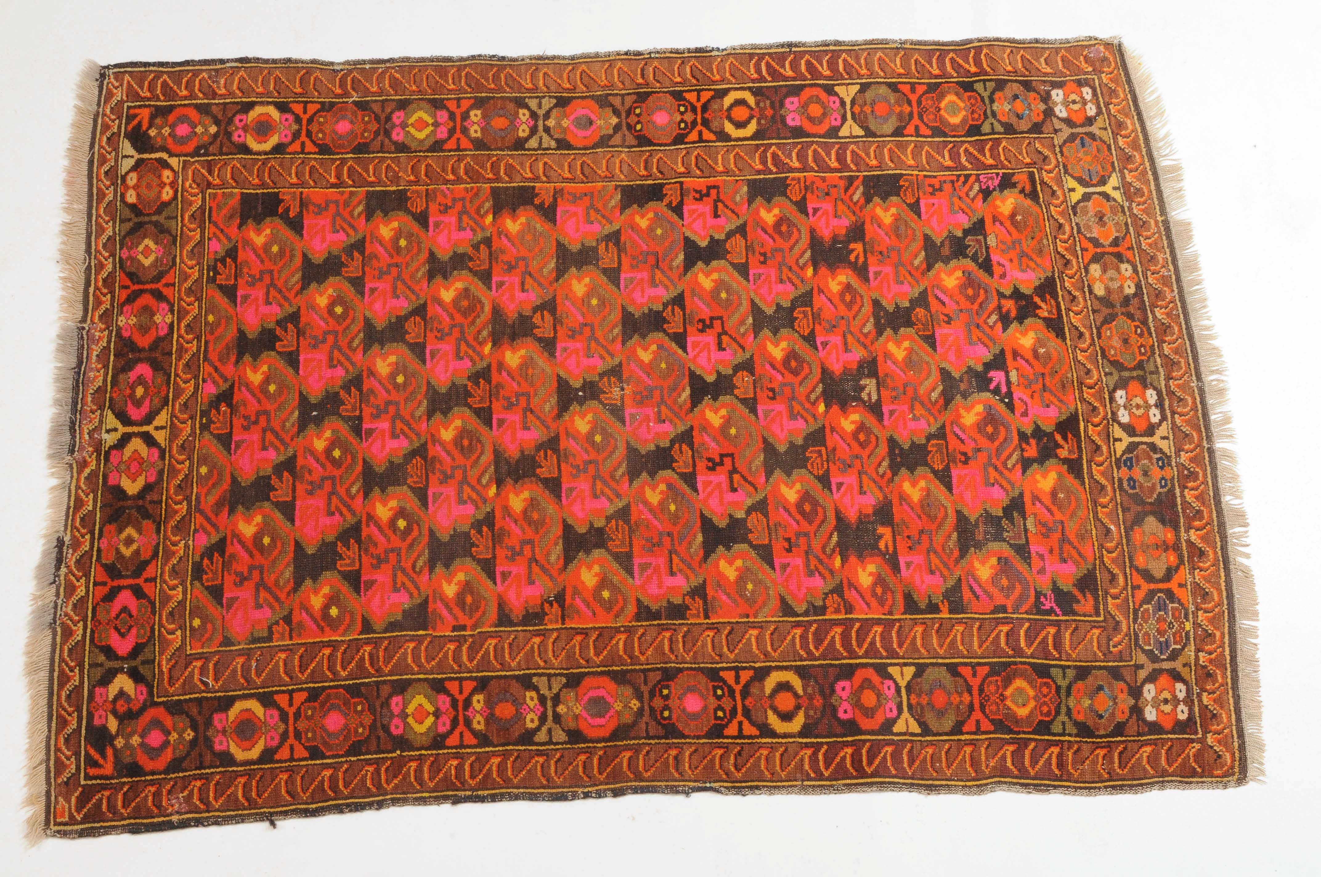 N-Kaukasus, um 1930. Im dunklen Mittelfeld sind horizontale Reihen mit Blütenmotiven wabenartig angelegt. 2 Wellenborten säumen die alternierende Blütenbordüre. Reparierte Stellen und Gebrauchsspuren. 116x160 cm (ft. 3.8x5.3).