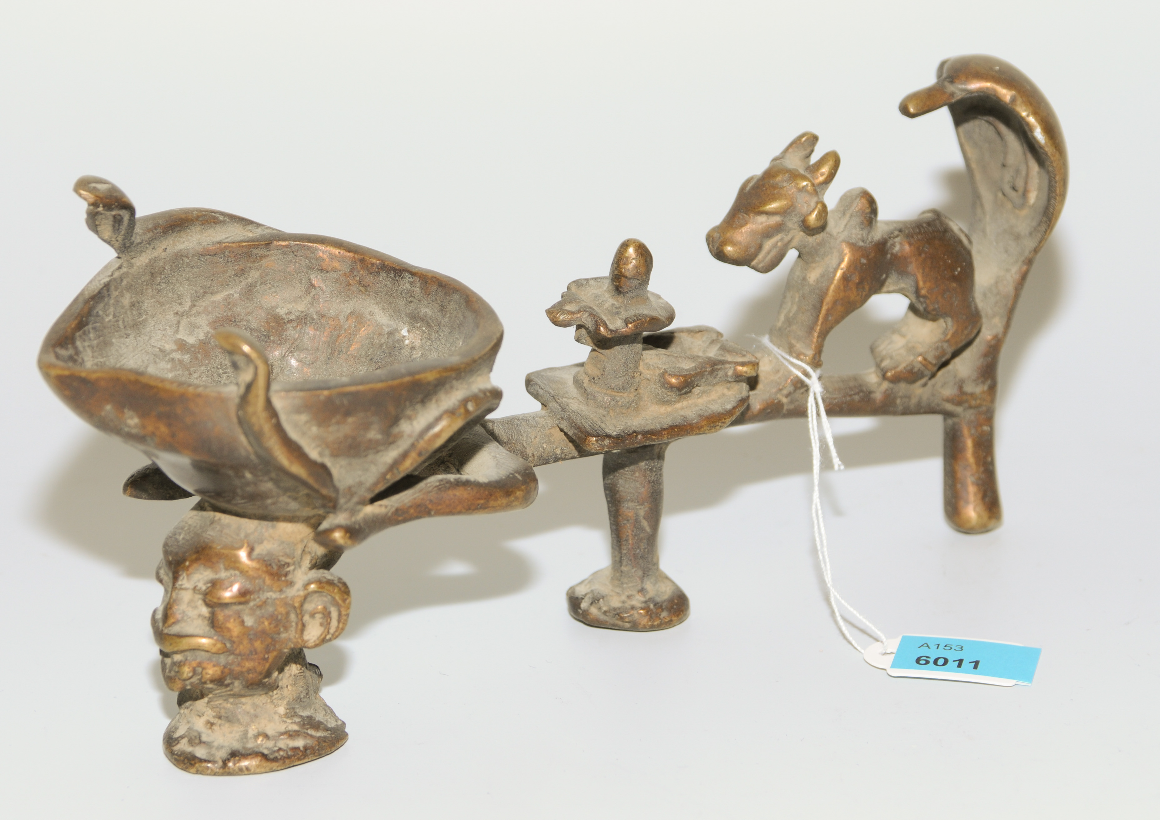 Indien. Gelbguss. Zeremoniallampe mit Nandi und Lingam. L 20 cm.