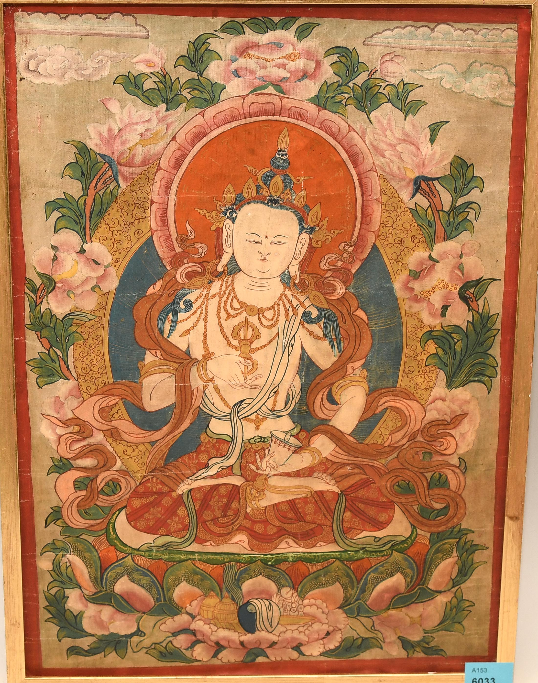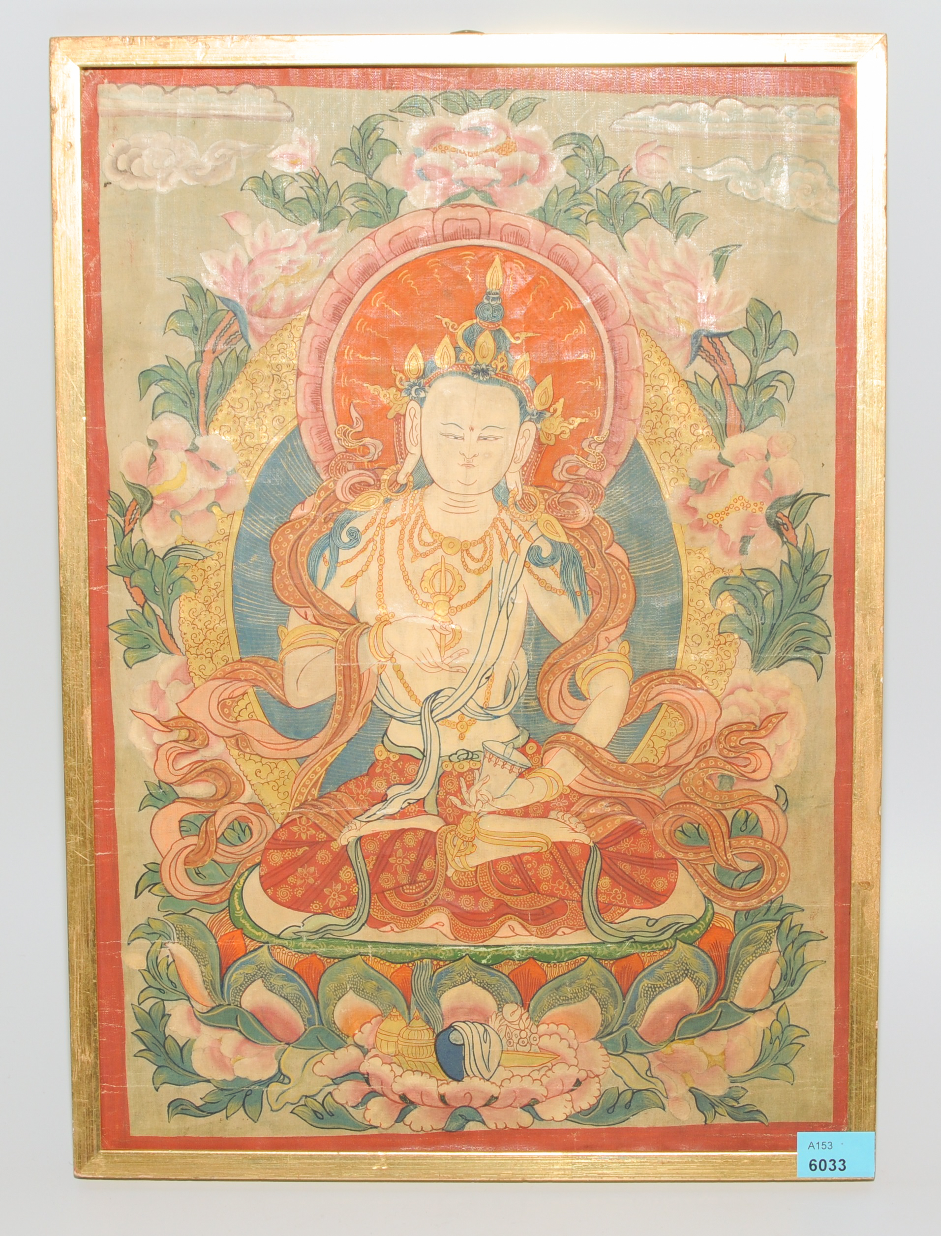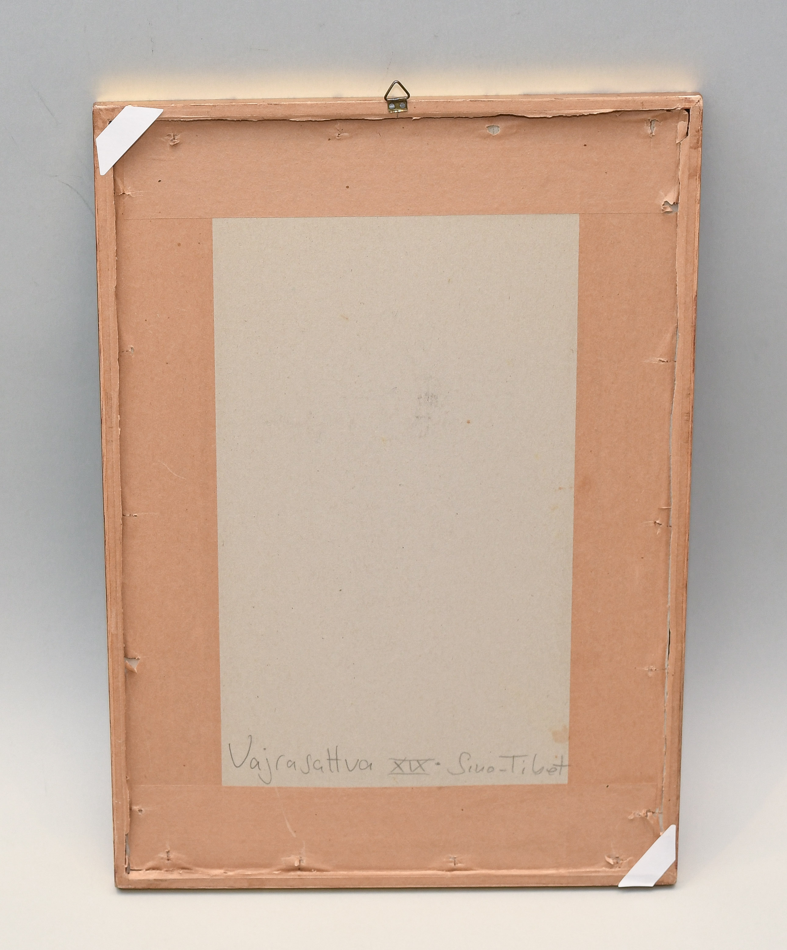 Sinotibetisch, 19.Jh. Gouache auf Stoff. Sitzende Darstellung der Vajrasattva mit Gantha und Vajra in den Händen. Gerahmt. 36,5x26 cm. - Beschnitten.